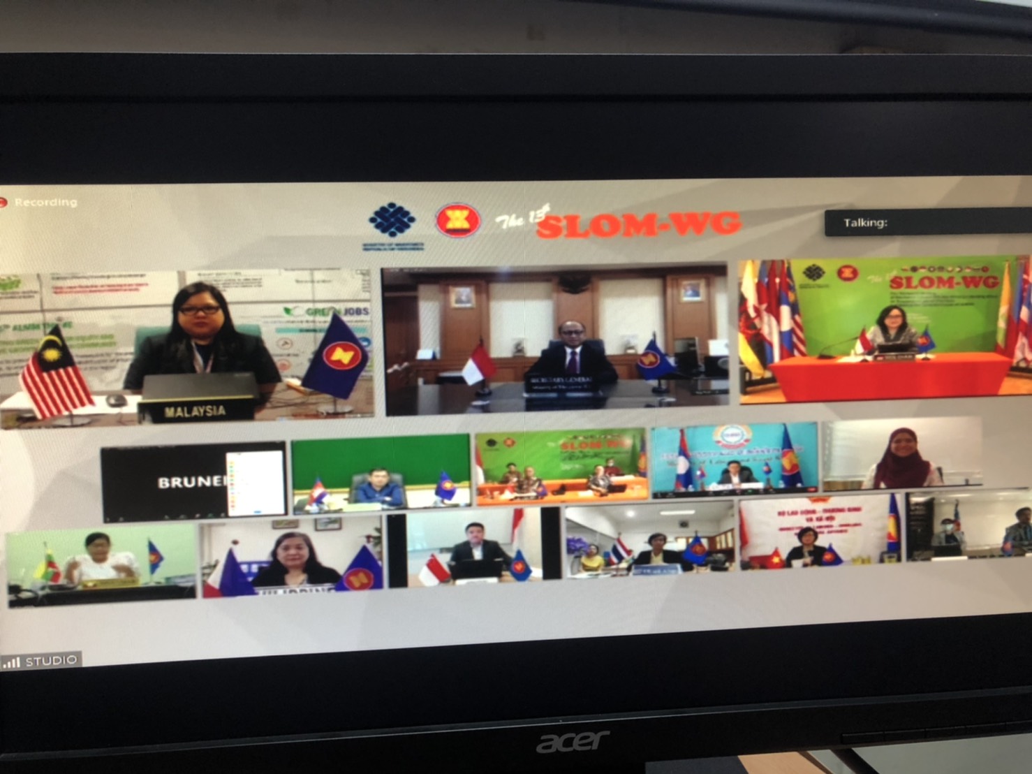 On October 13, 2020, at 09.00 hours, Permanent Secretary of Labour Mr. Suthi Sukosol assigned Assistant to the Permanent Secretary of Labour, Ms. Pattraporn Samatrat to attend the 13th SLOM-WG meeting through video conference. The meeting acknowledged the progress of the project implementation under the SLOM-WG plan for 2016-2020. It consists of the Ministry of Labour’s important projects, such as the 8th Academic Conference on Labour Inspection and research studies on the extension of social security to informal workers. The meeting also acknowledged the results of other important meetings on labor-related issues, such as the establishment of the ASEAN restoration guidelines after the Covid-19 pandemic and the preparation of the new SLOM-WG program 2016-2020. The meeting took place at the Office of International Cooperation meeting room, 12th floor, Ministry of Labour.