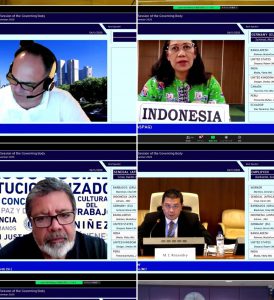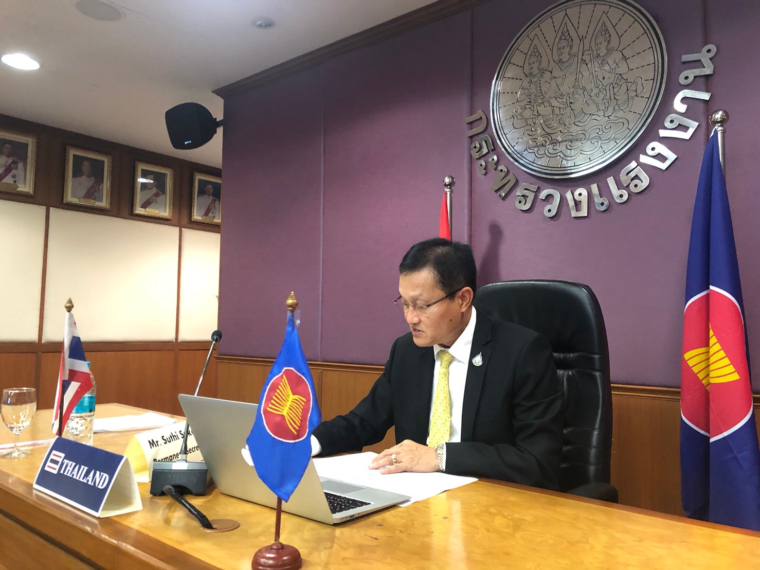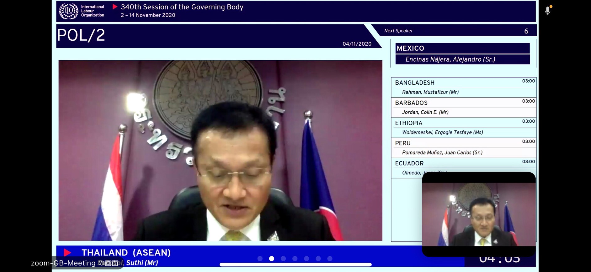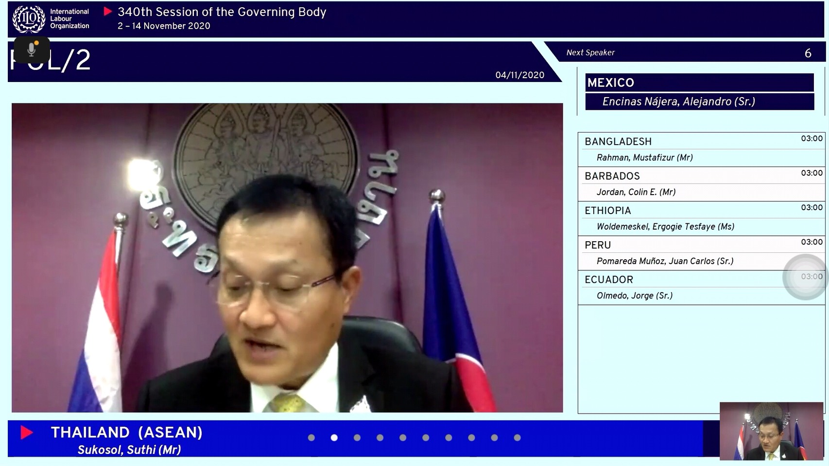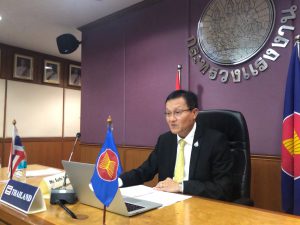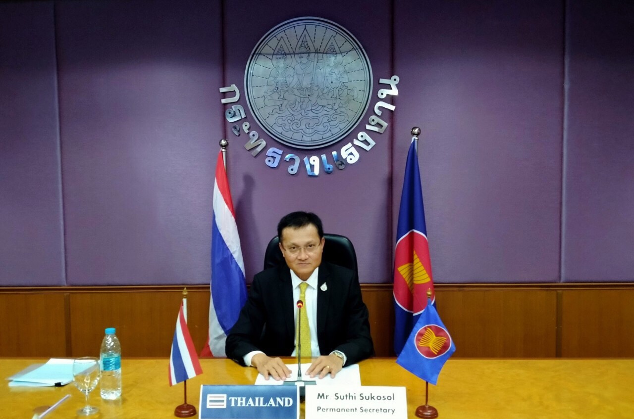 On November 4, 2020, at 22.30 hours in Thailand, Permanent Secretary of Labour Mr. Suthi Sukosol, Assistant to the Permanent Secretary of Labour, Ms. Pattraporn Samatrat, representatives from the Office of International Cooperation, Department of Employment, and Department of Skill Development, participated in the 340th Session of the International Labour Organization Governing Body, through video conference. The Session is held between November 2 – 14, 2020.