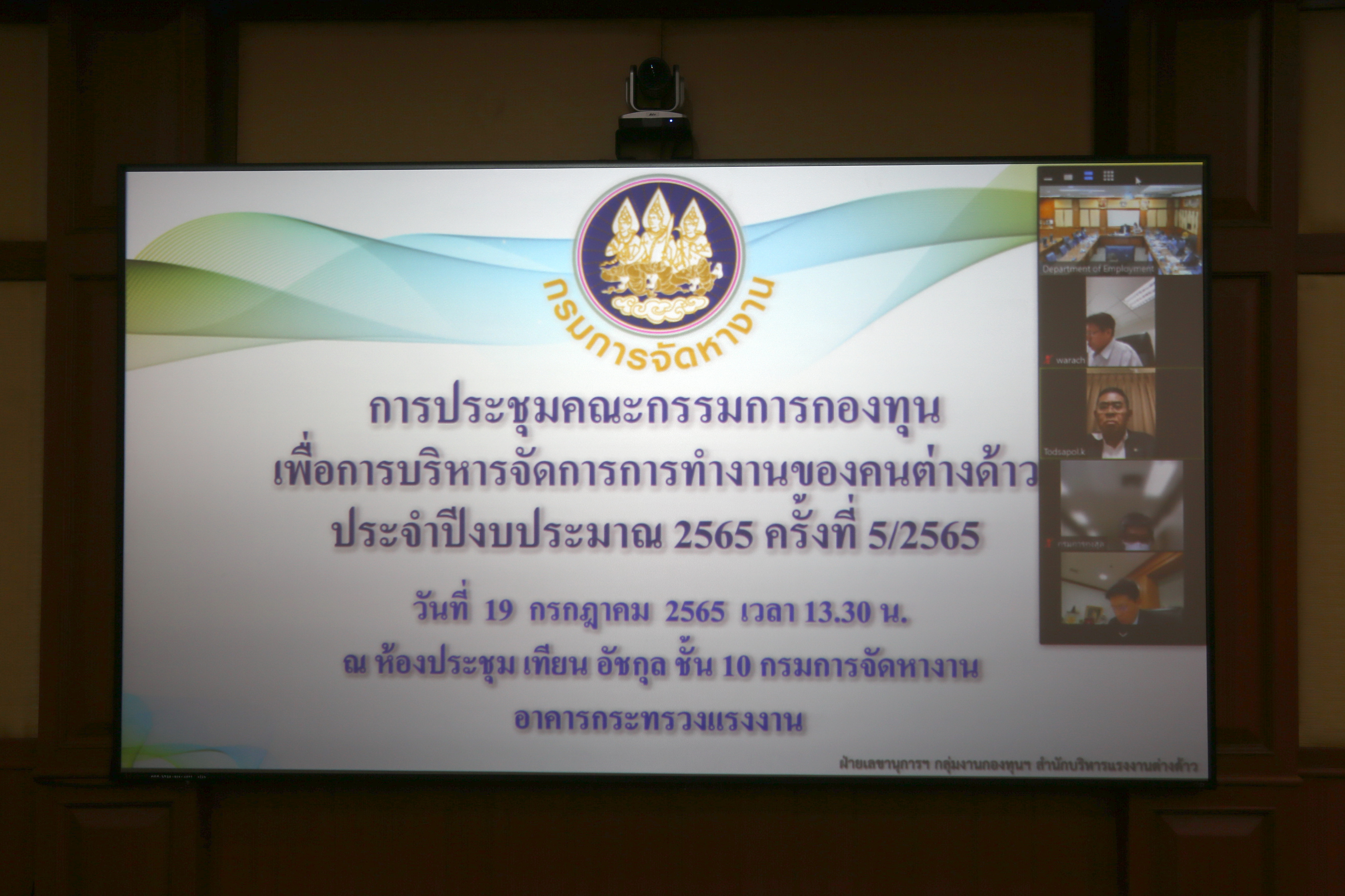 On July 19, 2022, at 13.30 hours, Permanent Secretary of Labour, Mr. Boonchob Suttamanaswong, assigned the Deputy Permanent Secretary of Labour, Mr. Wannarat Srisuksai, as the chairperson of the Foreign Worker Fund Management Committee for the 2022 Fiscal Year Meeting No. 5/2022. The meeting considered the review of public relations projects to create awareness and understanding of policies on management, import, prevention, and protection of migrant workers’ rights, by the Ministry of Labour’s Office of the Permanent Secretary of Labour and the government. It also considered the application for the allocation of funds from the fund by the Department of Employment, the application for the allocation of funds from the fund by the National Police, and programs to prevent and resolve forced labour or service problems that may arise from the violation of migrant workers by the Office of the Permanent Secretary of Labour. The occasion took place at the Tian Achakul Conference Room, 10th floor, Department of Employment, Ministry of Labour.