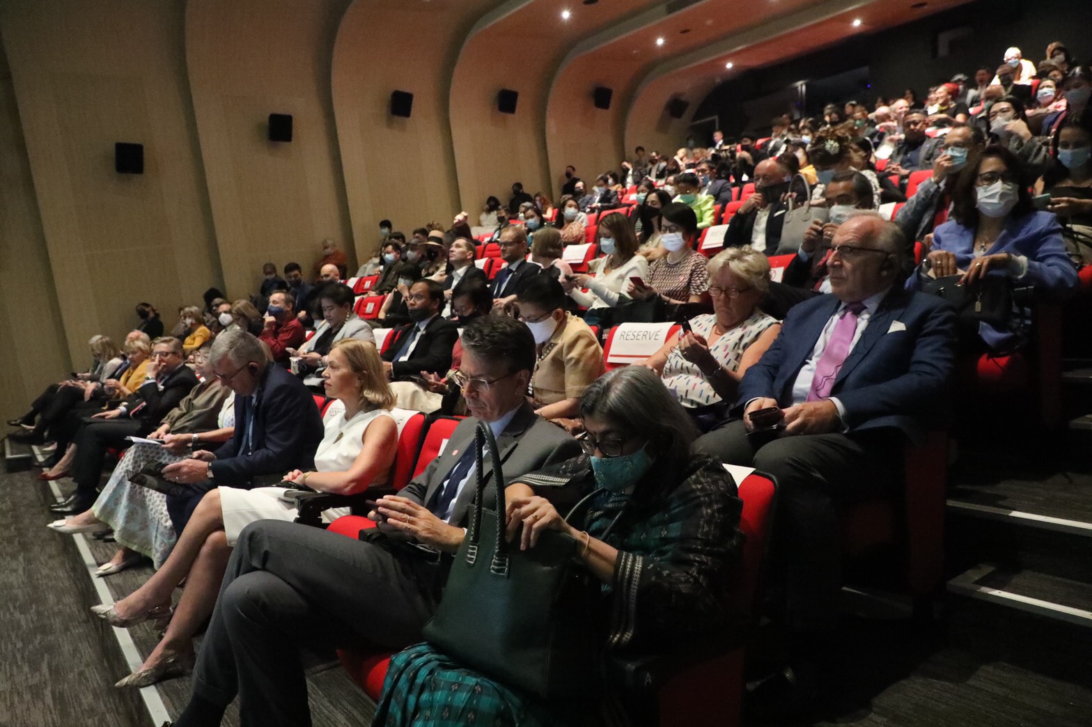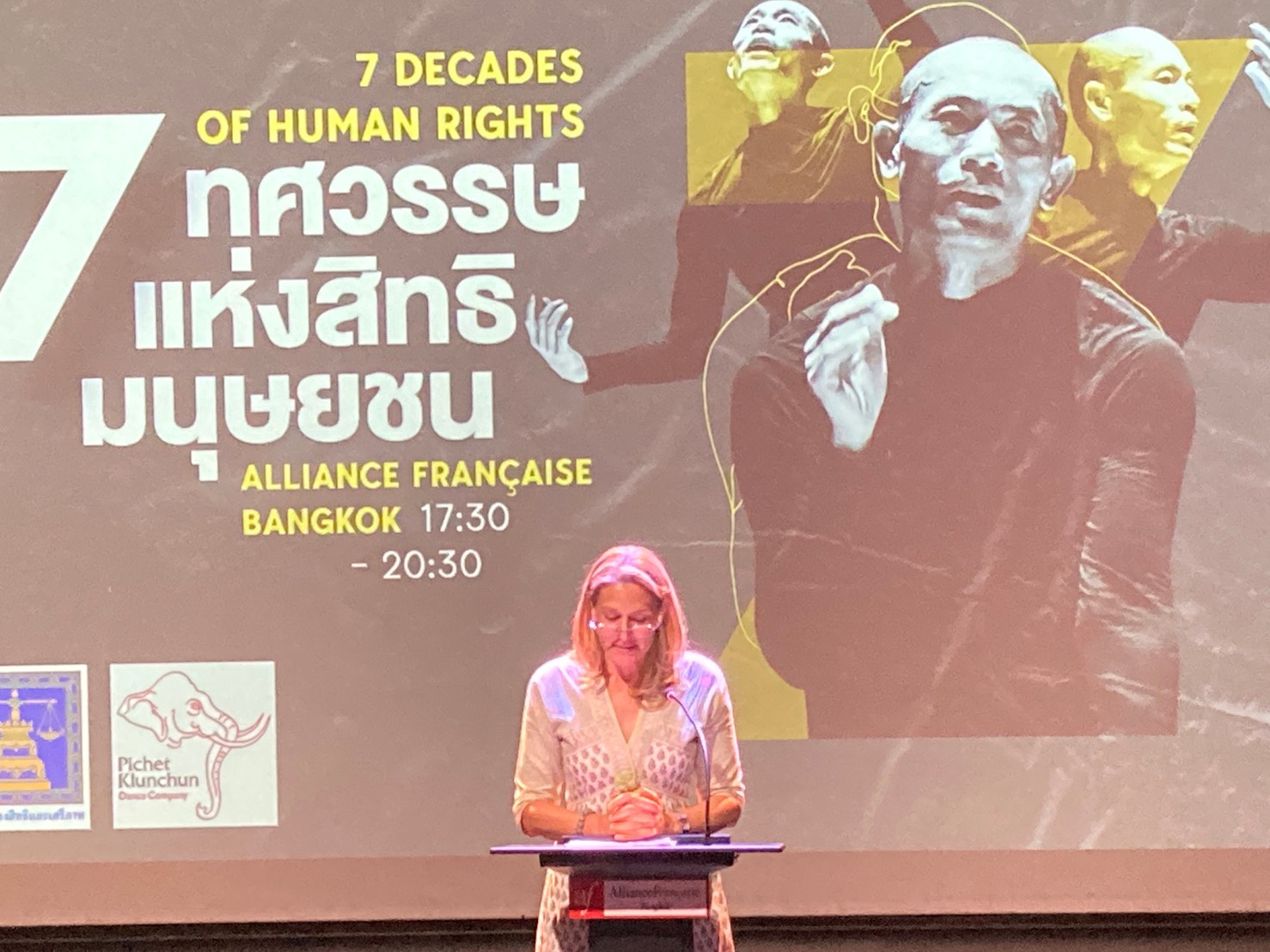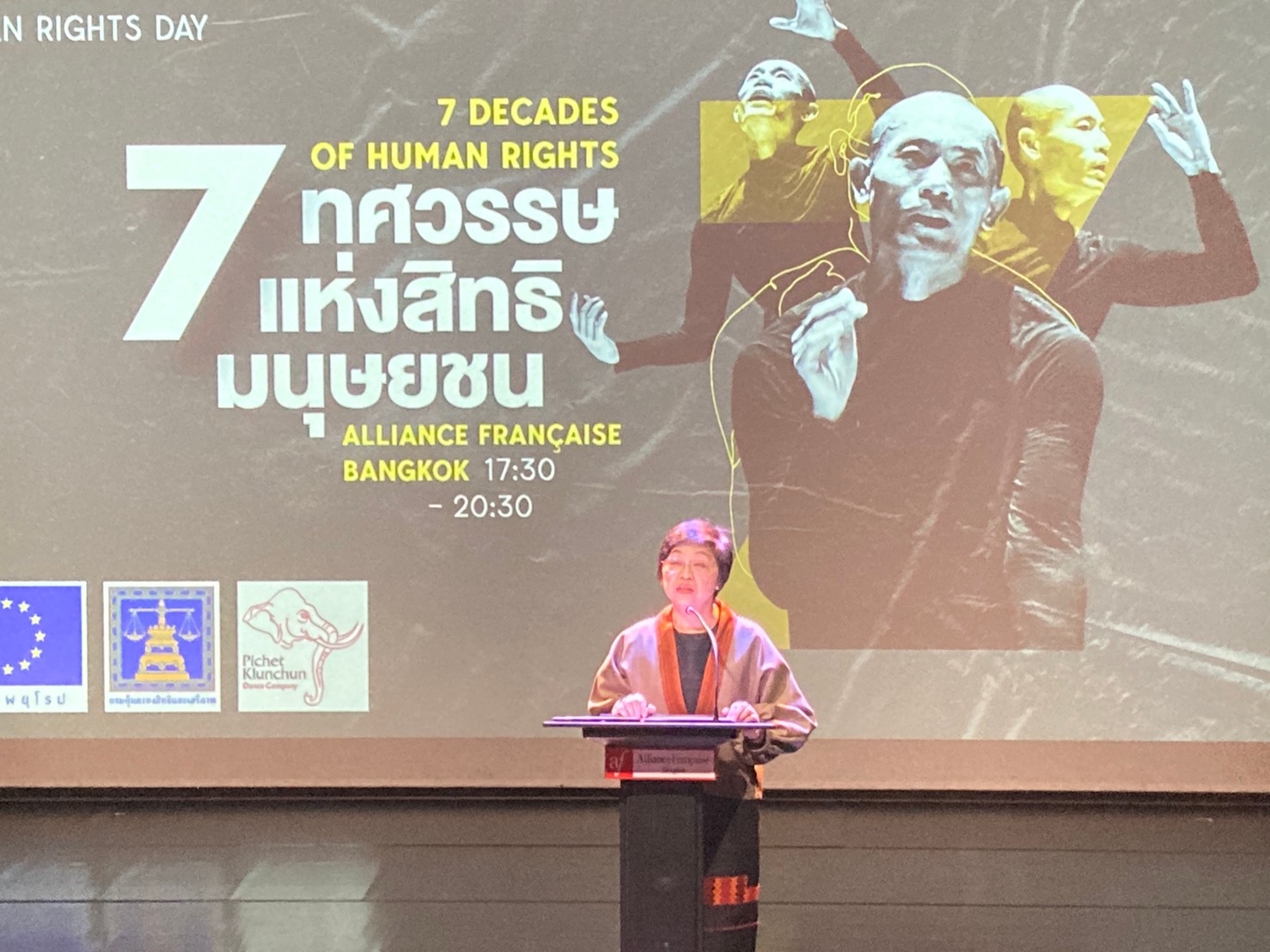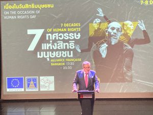 On December 7, 2020, at 17.30 hours, Permanent Secretary of Labour Mr. Suthi Sukosol assigned Assistant to the Permanent Secretary of Labour Ms. Pattraporn Samatrat to join the International Human Rights Day 2020 under the theme “7 Decades of Human Rights Progress” at the Association of Française, Bangkok, Wireless Road. During the opening ceremony, H.E. Pierca Tapiola, Ambassador Extraordinary, and Plenipotentiary of the European Union, Mrs. Tasanee Pao-in, Deputy Director-General of the Department of Rights and Liberties Protection and Mrs. Cynthia Velico, Representative of the United Nations High Commissioner for Human Rights for Southeast Asia, joined to deliver an opening speech. There were also attendees from the government, private sector, civil society, diplomatic groups, and international organizations. Pichet Klunchun Dance Company performed a contemporary dance performance, which presented the essence and challenges of the seven UN human rights treaties to which Thailand has become a partner. There was also a reception to strengthen relations with the relevant parties after the performance.