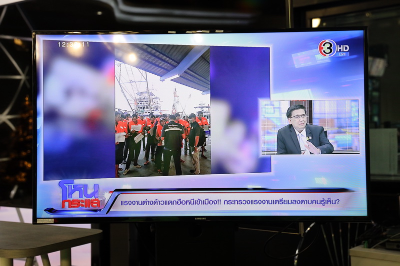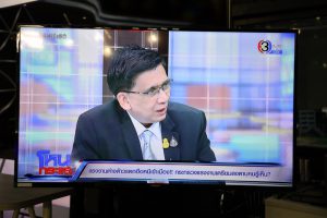 On December 23, 2020, at 12.20 hours, Labour Minister Mr. Suchart Chomklin assigned Deputy Permanent Secretary of Labour Mr. Phairoj Chotikasatian to give a live interview in the “Hone Kra-sae” program, broadcast on Thai TV Channel 3. The interview covered the Ministry of Labour’s measures to prevent and help people affected by the Covid-19 pandemic among foreign workers and company employees. It has requested the cooperation of employers and companies to prohibit foreign workers’ movement into or out of areas at risk of the spread of Covid-19 and to establish the Ministry of Labour’s Center for Covid-19 Situation Administration (MOL CCSA) on Monday, December 21, 2020. This center is under the National Labour Administration Center on the 5th floor of the Ministry of Labour’s building. The interview also discussed remedial measures regarding compensation benefits in the event of unemployment due to force majeure for insured persons. The occasion took place at the Thai Television Channel 3 station.