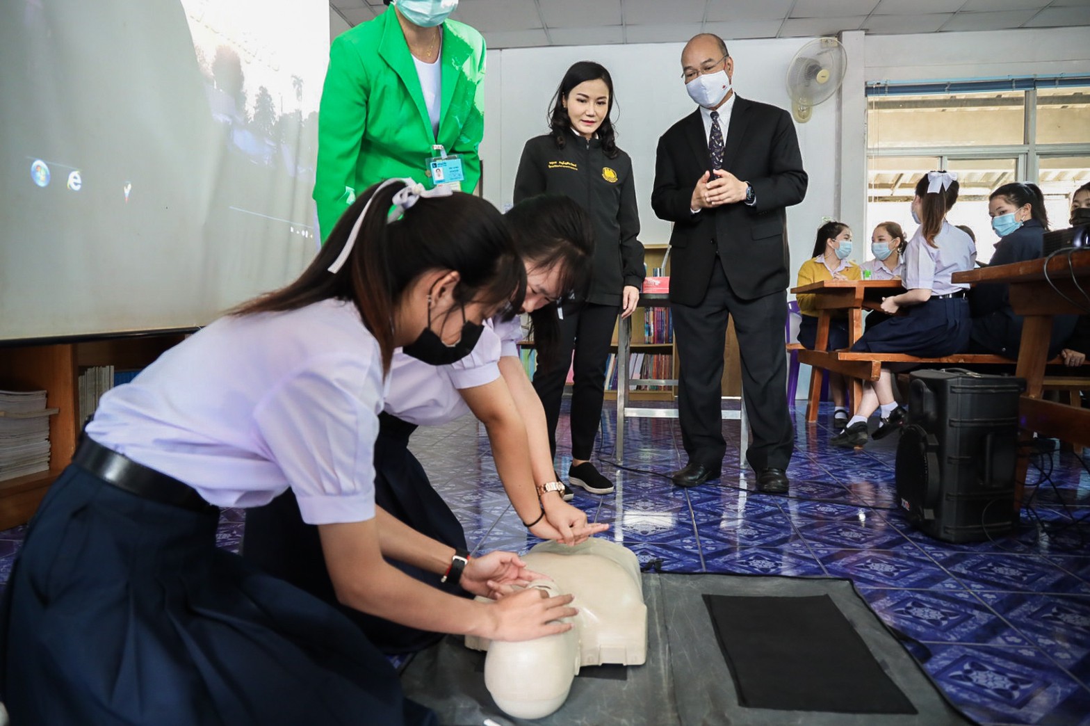 The Deputy Labour Minister continued that the visit to observe the operations of agencies under the DSD intended to encourage trainees, including workers in the system, informal workers, and vulnerable groups. It also visits provinces assigned by the government following the project to drive Thailand together, having an opportunity to lead the Kluaynamthai Hospital team into areas to provide information on self-care, first aid, and recruit interested people to attend the training course on caring for the elderly. The provinces that Kluaynamthai Hospital have had the opportunity to meet with youths, parents, and labour volunteers to share information with people in the community, including the Suphanburi Province, the Nan Skill Development Office, and the Ratchaburi Skill Development Institute 4. For feedback from sharing information in these three provinces, 17 people were interested in applying for the training. It is expected that the training will begin around May 2021. There are still youths waiting to consult with their parents to a decision. The Kluaynamthai Hospital will give scholarships to trainees for training throughout the course, valued at 95,000 Baht per scholarship. Coverage consists of an entrance fee, English training fee, the cost of equipment and training materials, clothing, accommodation, and three meals daily.
