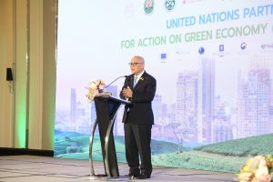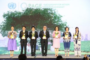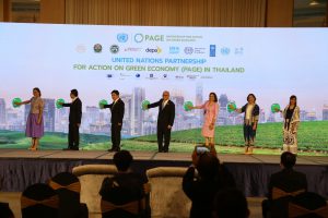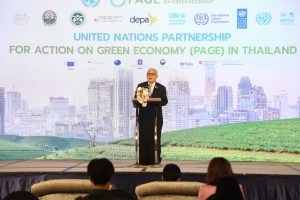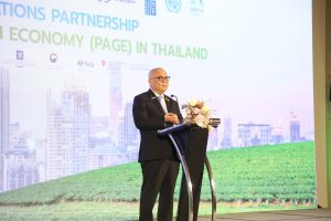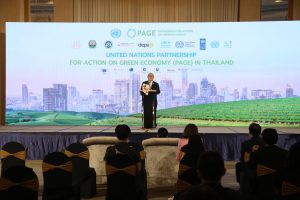 On November 10, 2022, the Permanent Secretary of Labour, Mr. Boonchob Suttamanaswong, assigned the Ministry of Labour’s Inspector-General, Mr. Samat Pattamasukon, to participate in the launch of the Partnership for Action on Green Economy in Thailand (PAGE in Thailand Launch Event). The Deputy Prime Minister and Minister of Energy, Mr. Supattanapong Punmeechaow, gave opening remarks at the Swissotel Bangkok Ratchada.