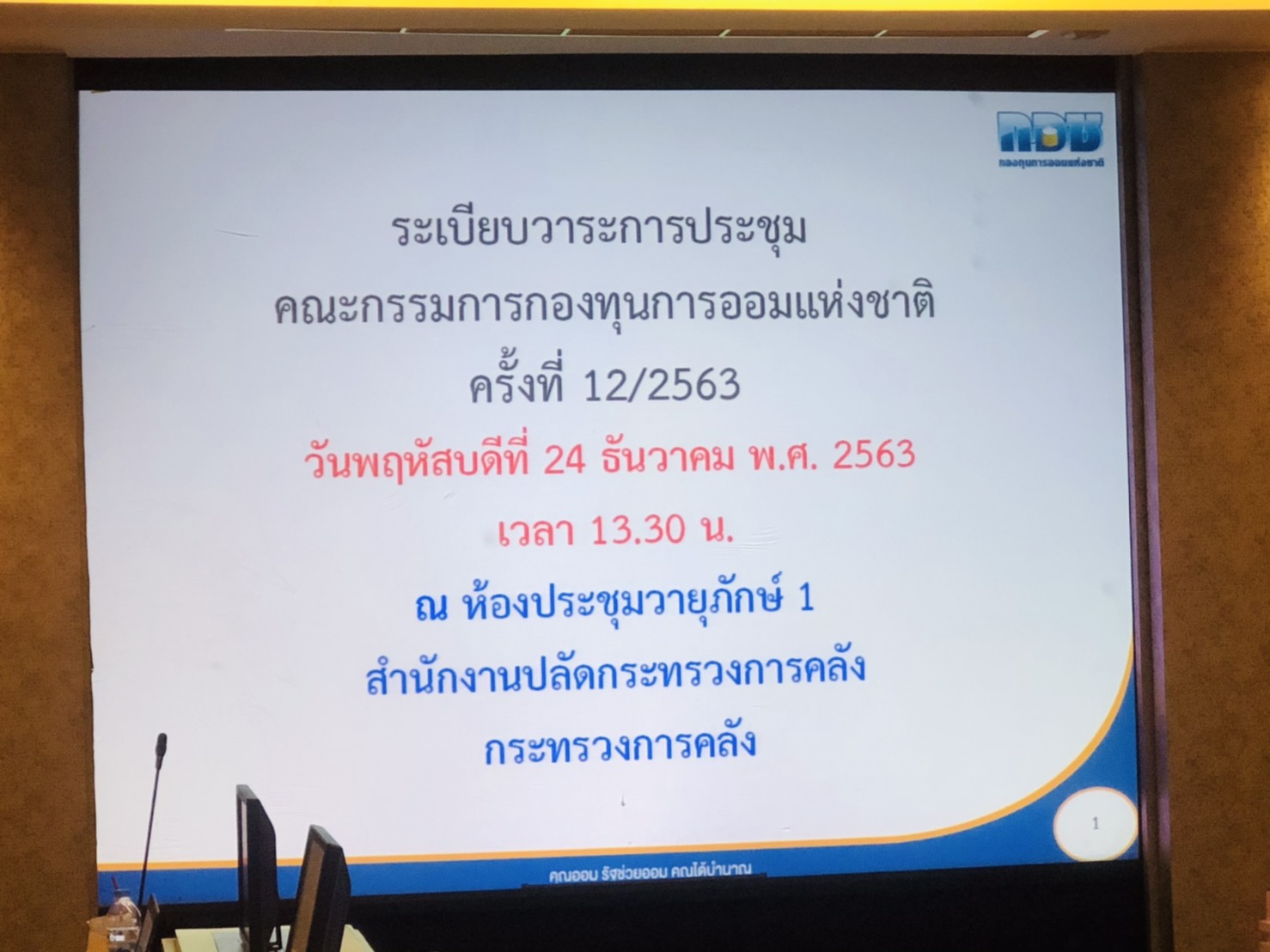 On December 24, 2020, at 13.30 hours, the Permanent Secretary of Labour Mr. Suthi Sukosol assigned Deputy Permanent Secretary of Labour Ms. Aumpun Thuvavit to join the National Savings Fund Committee Meeting No. 12/2020, chaired by the Permanent Secretary of the Ministry of Finance Mr. Krisada Chinavicharana. The meeting took place at the Vayupak Meeting Room 1, Office of the Permanent Secretary of Finance. The meeting considered the investment management plan for 2021 to maintain the collection of operating expenses of the Fund for Portfolio 1 (collections and contributions) and projects under the working group for the marketing plan and savings promotion in 2021.