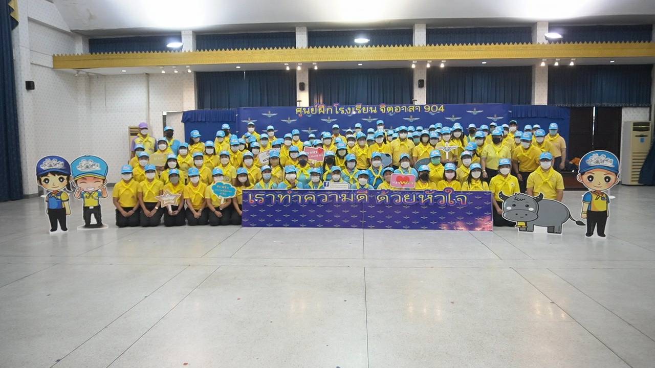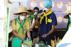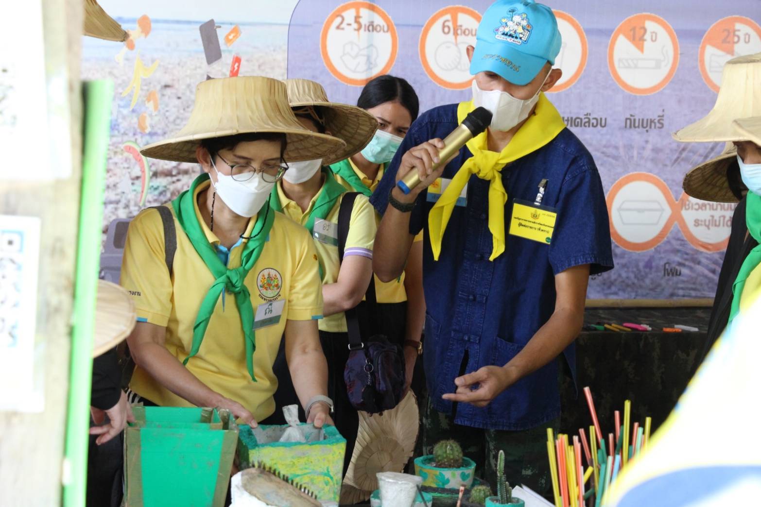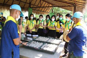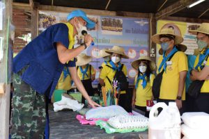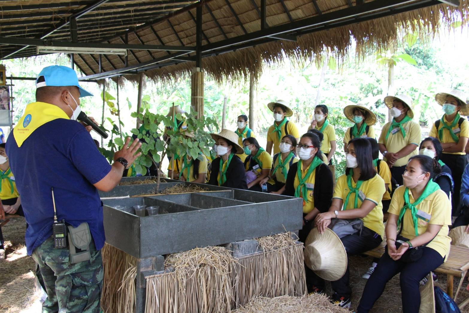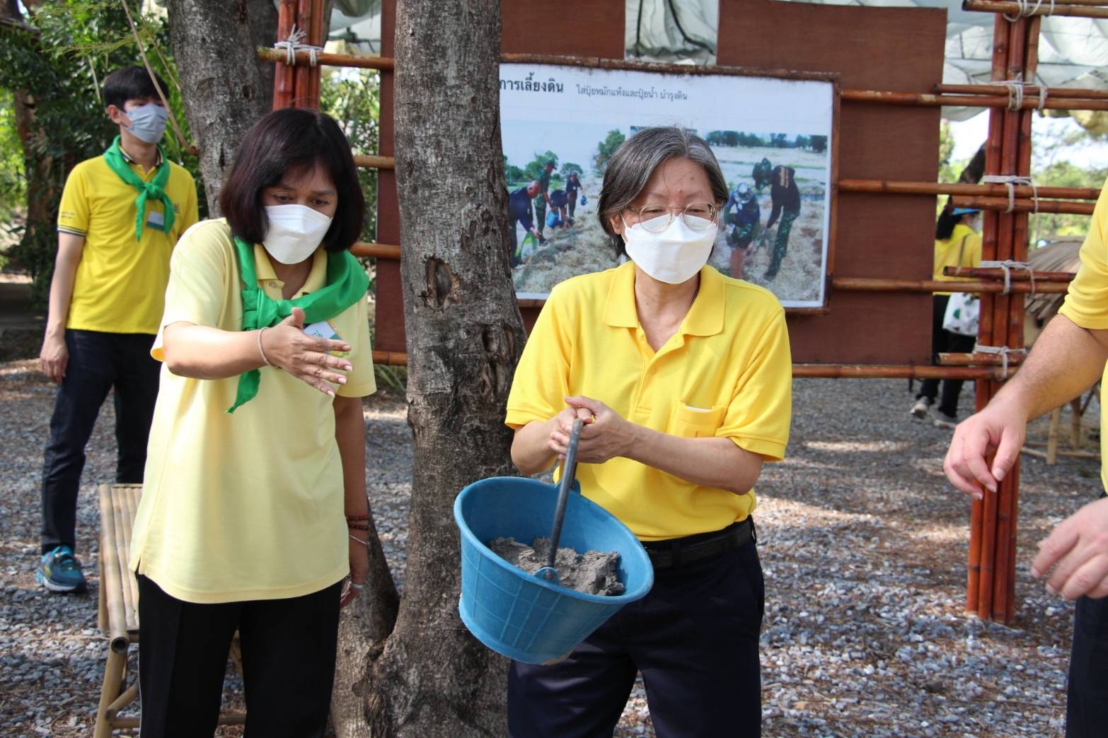 On December 16, 2022, the Permanent Secretary of Labour, Mr. Boonchob Suttamanaswong, assigned the Director of Strategy and Planning Division from the Office of the Permanent Secretary of Labour, Ms. Atchara Ngamsomjit to lead civil servants and officials from departments under the Ministry of Labour to attend lectures and training following the sufficiency economy philosophy. The occasion took place at the Training Center of the Volunteer Spirit School 904 (Bang Khen). The objective of this training is for participants to apply the knowledge of the sufficiency economy philosophy in their work and life. It also aimed to provide knowledge and understanding of problems and solutions that arise in Thai society according to geographic characteristics, coupled with knowledge of agriculture, new theory, and living following the philosophy of the sufficiency economy. Training courses also included soil management and water, solving waste problems, making multi-purpose liquids, and building clay houses. After completing the training, the trainees were bestowed a hat and a volunteer-spirited scarf in front of His Majesty’s portrait as symbols and uniforms for doing good deeds with heart.