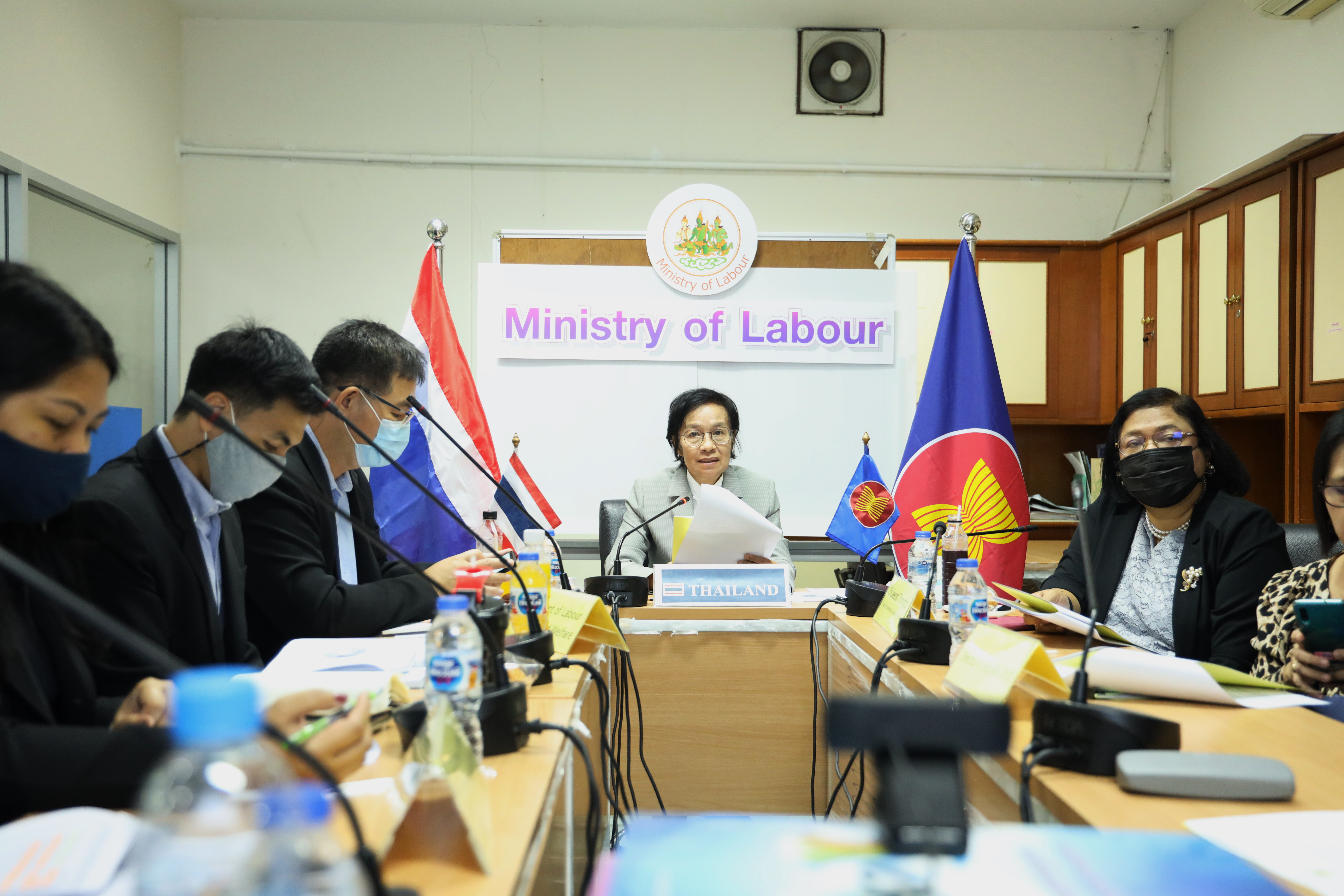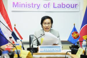 On December 9, 2020, at 09.00 hours, Permanent Secretary of Labour Mr. Suthi Sukosol assigned Assistant to the Permanent Secretary of Labour Ms. Pattaraporn Samantarat, to represent Thailand’s Senior ASEAN Labour Officials participating in a workshop to determine opportunities for the development of multiple cooperation strategies in the ASEAN region on solving human trafficking and forced labour in the fishing sector. The meeting was conducted through a video conference system at the Office of International Cooperation’s meeting room, 12th floor, Ministry of Labour. The meeting participants consisted of the Ministry of Labour’s representatives and the relevant government sectors, including the United States Agency for International Development (USAID), the International Labour Organization, and ASEAN member countries. On this occasion, Ms. Pattaraporn Samantarat gave a speech on the second agenda to exchange information from regional partners. She presented the Ministry of Labour’s operations, plans, and activities related to solving human trafficking in the fishing sector.