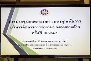 Today (September 29, 2020) at 13.30 hours, Permanent Secretary of Labour Mr. Suthi Sukosol chaired the meeting of the Management of the Foreign Workers Fund Committee Meeting No. 10/2020. The Department of Employment’s Director-General Mr. Suchat Pornchaiwiseskul and the Ministry of Labour’s executives attended the meeting at the Tien Achakul meeting room, 10th floor, Department of Employment. The meeting considered the extension period of disbursements from the 2020 fiscal year, to be disbursed in the 2021 fiscal year. The meeting also requested the fund allocation for the 2021 fiscal year, the Information Database System Development Plan, the Management of the Foreign Workers Fund for three years (2020 – 2022), the Information Database System Development Plan for 2020, the Strategic Plan for Human Resources Management Fund for the Management of the Foreign Workers for 2021 – 2023 and the Human Resource Management Action Plan for the 2021 fiscal year.