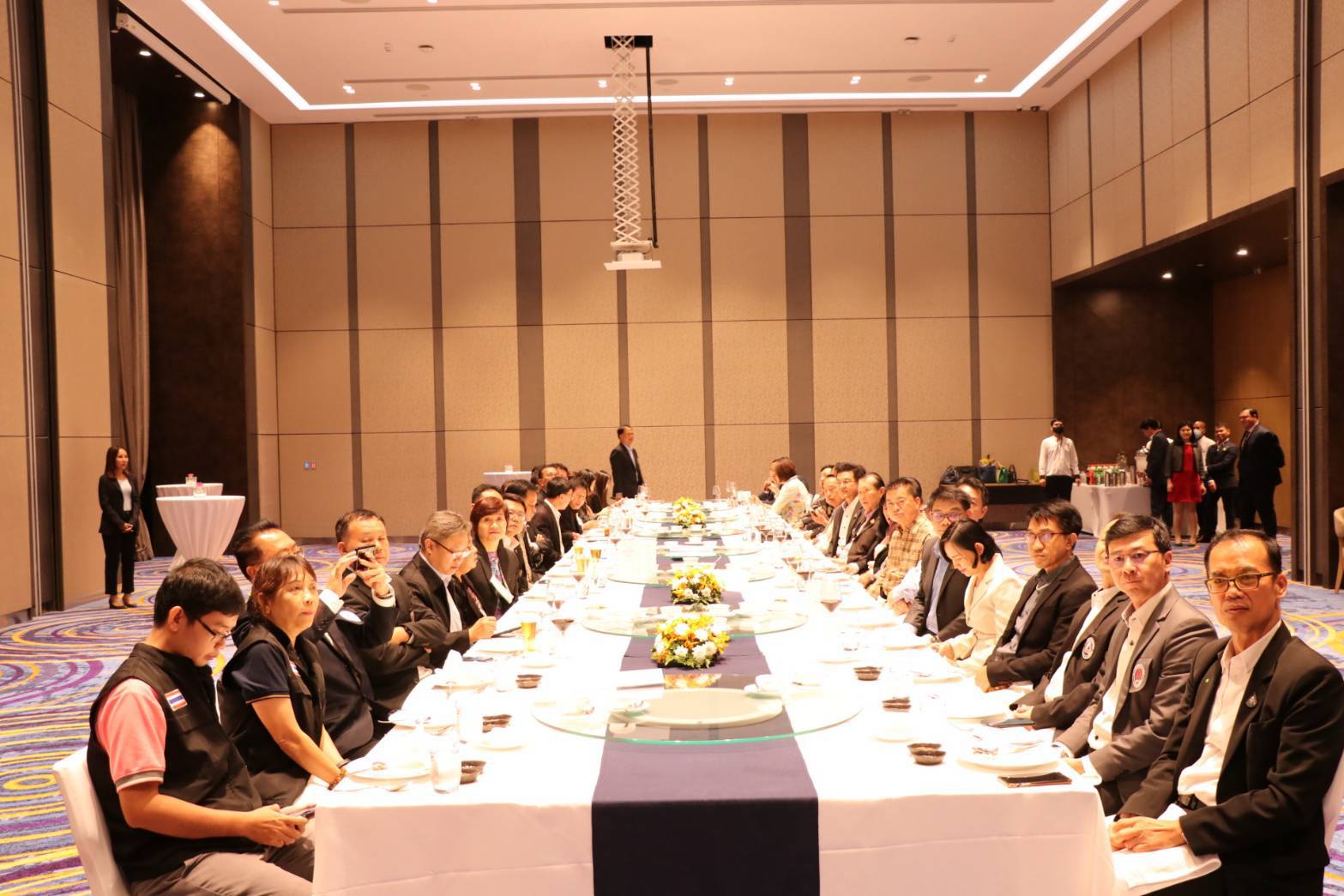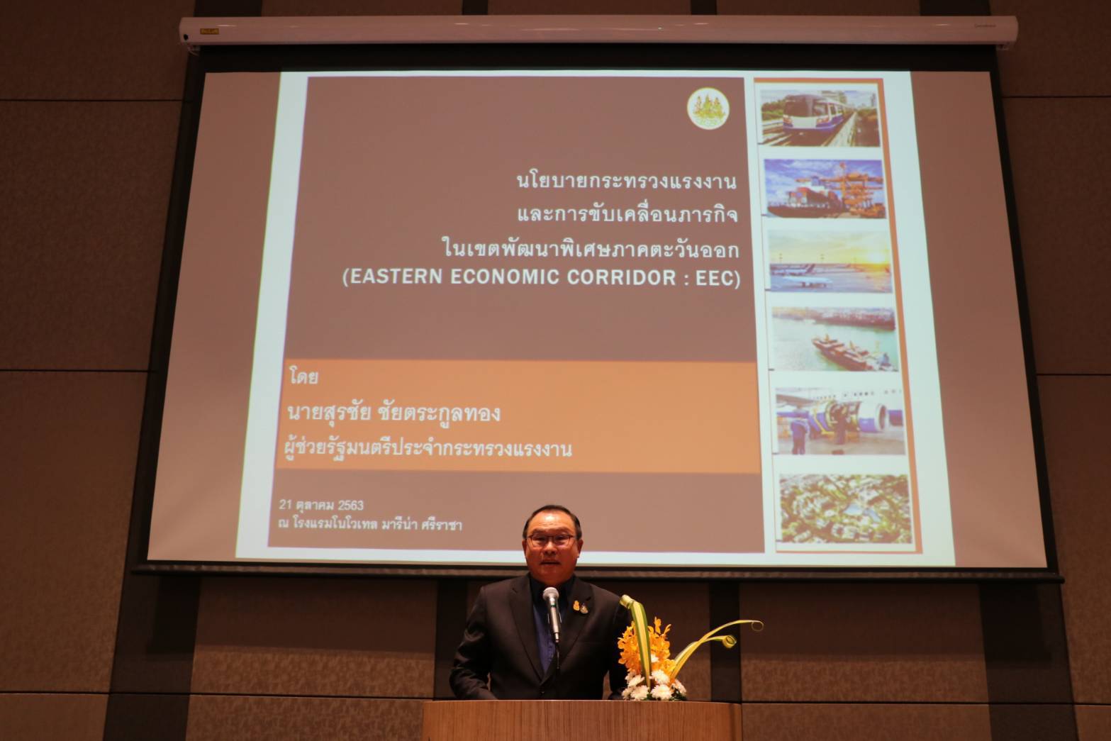 On October 21, 2020, at 18.00 hours, Assistant to the Labour Minister Mr. Surachai Chaitrakulthong, along with heads of government agencies under the Ministry of Labour in Chonburi, attended a meeting with members of the Eastern Federation of Thai Industries in the project meeting of the Eastern Federation of Thai Industries, scheduled to be held between October 21-22, 2020. The meeting took place at the Novotel Marina Sriracha, Chonburi. Participants consisted of members of the Eastern Federation of Thai Industries Council, heads of government agencies under the Ministry of Labour, and other relevant parties, totaling 40 people. In the meeting, Mr. Surachai presented the Minister of Labour’s urgent policies and missions, emphasizing proactive work, accessing local areas, and integrating the public and private sectors to drive the economy. The efforts ensure the enhancement of workers’ quality of life to be protected by law, employment, income, good welfare, and happiness at work, together with stability and sustainability. Mr. Surachai also introduced the Co-payment program (employment of new graduates). The government supports 50 percent of the wages by inviting the private sector to recruit new graduates to enhance skills and work experience, allowing new graduates to earn income and be self-sufficient. He also publicized the influenza vaccination program to employees aged 50 and over and insured by the Social Security Office. Eligible employees can get vaccinated at the affiliated hospitals from October 15, 2020, onwards, whereby all companies are encouraged to publicize, invite, and allow employees to get vaccinations during their work hours without deduction of wages being considered as a vacation.