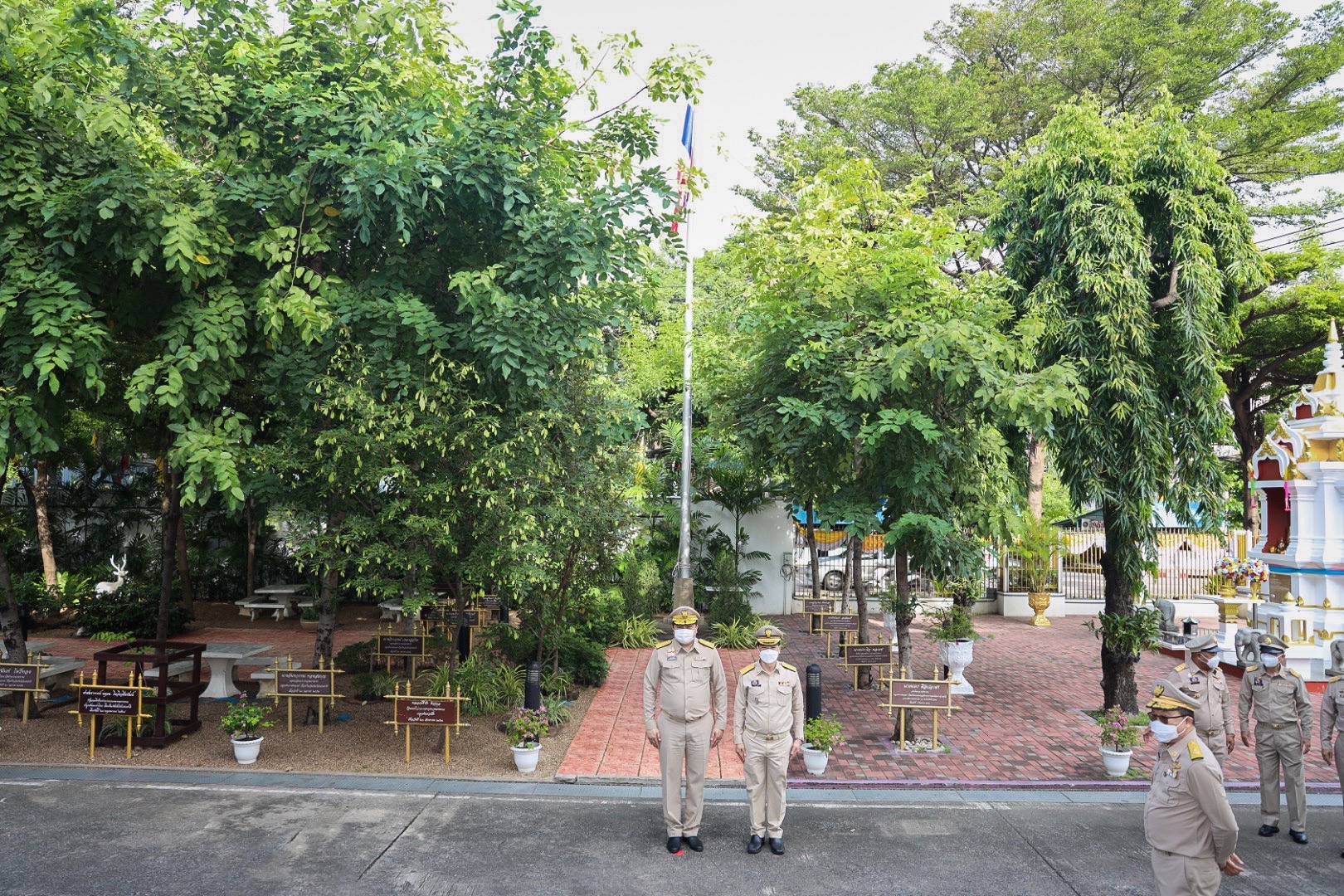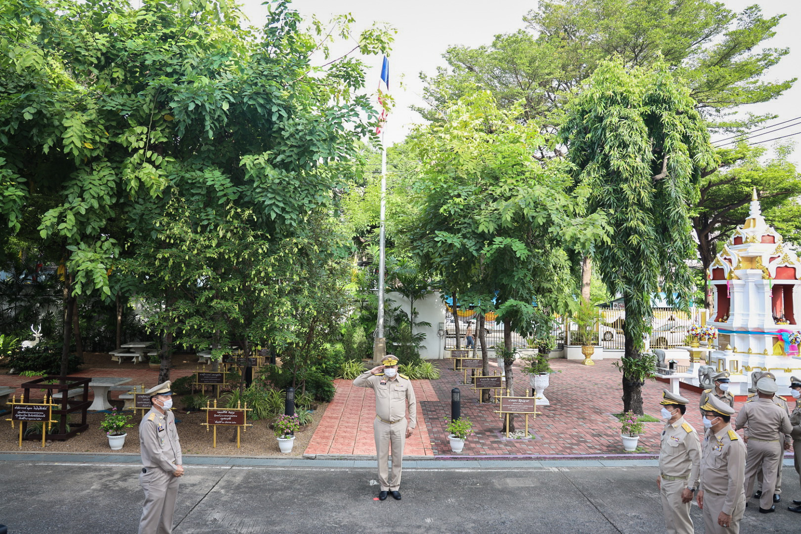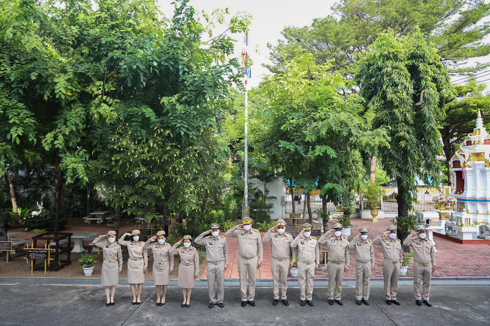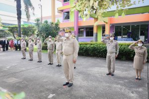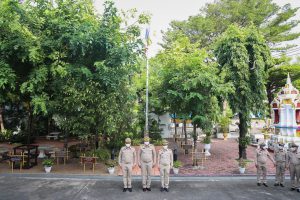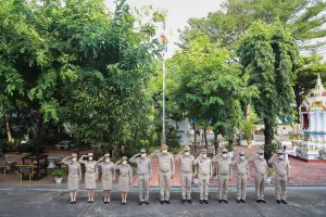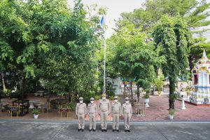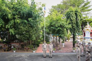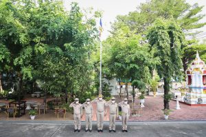 “The national flag is the highest symbol of the nation. The Thai flag originally came in many forms until the reign of King Rama VI, who was graciously pleased to enact a new Flag Act in B.E. 2460. At that time, Thailand joined World War I with the allied nations. Most of the flags had three colors. The Thai flag at that time was an oval shape, two parts wide, three parts long. It had a dark blue stripe, 1 part wide, which divided three parts of the flag’s width in the middle. There was a white stripe 1 part wide divided 6 of the flag’s width on each side, and there was a red stripe as wide as the white stripe on each side of the outer layer. The flag was called the “Tricolor flag.” Each of the flag’s colours had a meeting. Red meant the nation, that is, the people. White means religion, and blue means the King. The tricolor flag or Thai flag is considered the highest symbol of the nation. It is a reminder for young people to remember the sacrifice of their ancestors, to preserve the land and the hearts of the whole nation to be one. It symbolizes love and unity to promote pride in the nation and creates a great power for the development of the Thai nation,” concluded Mr. Suchart.