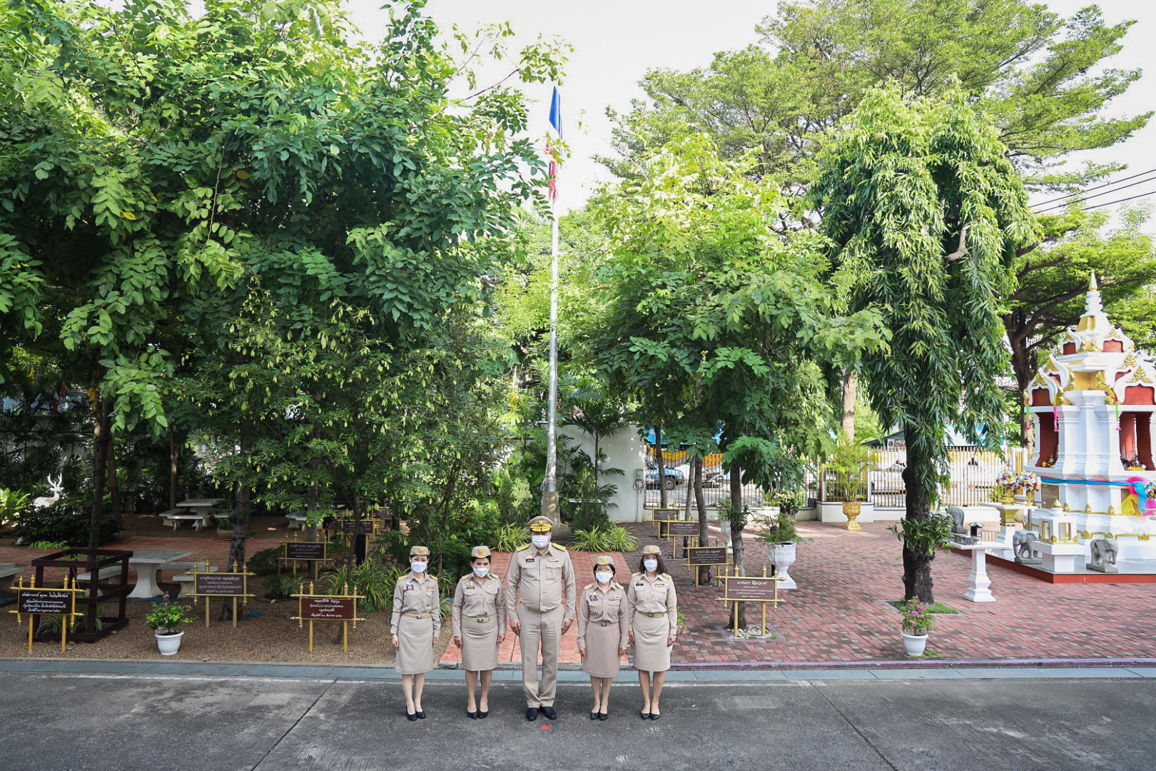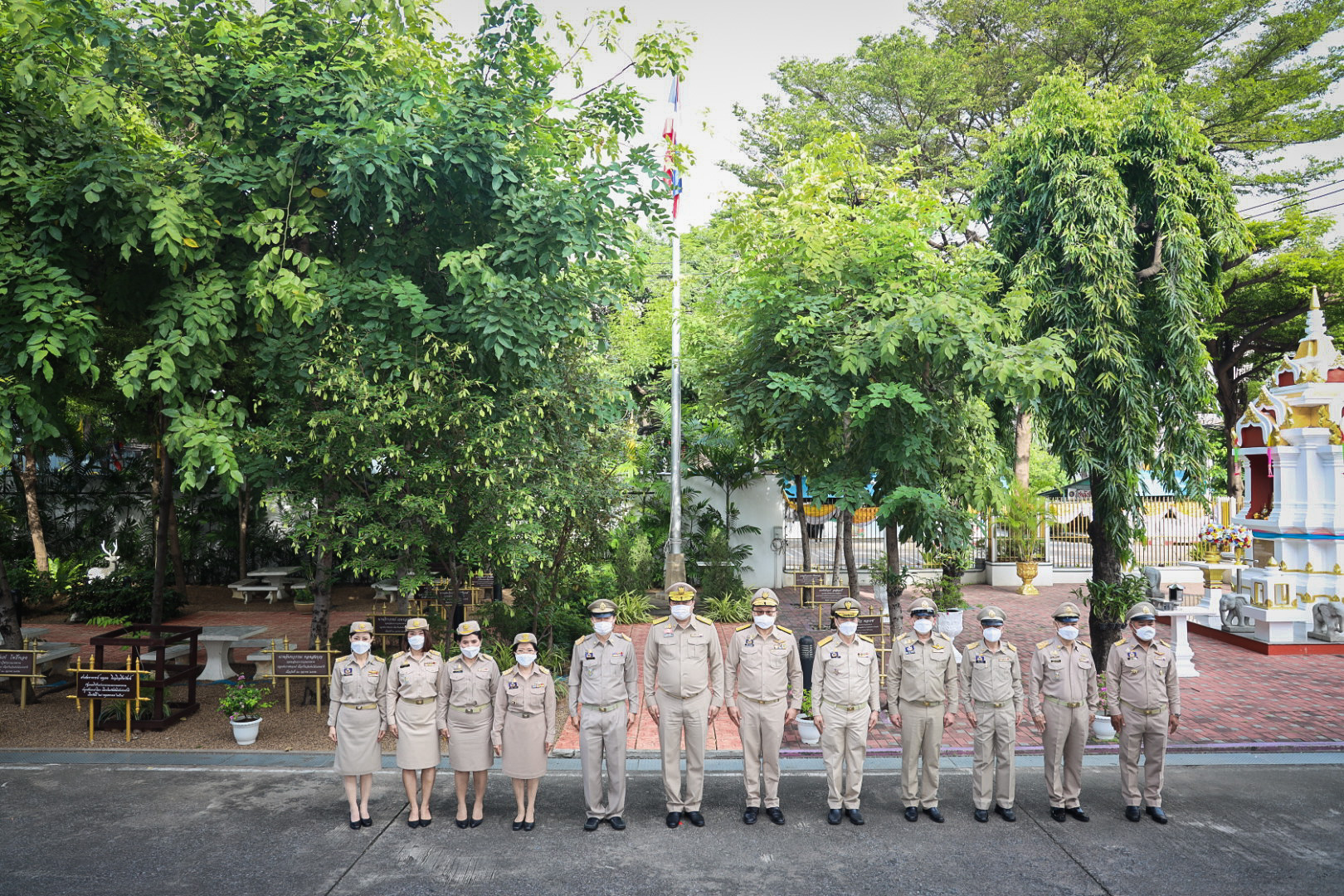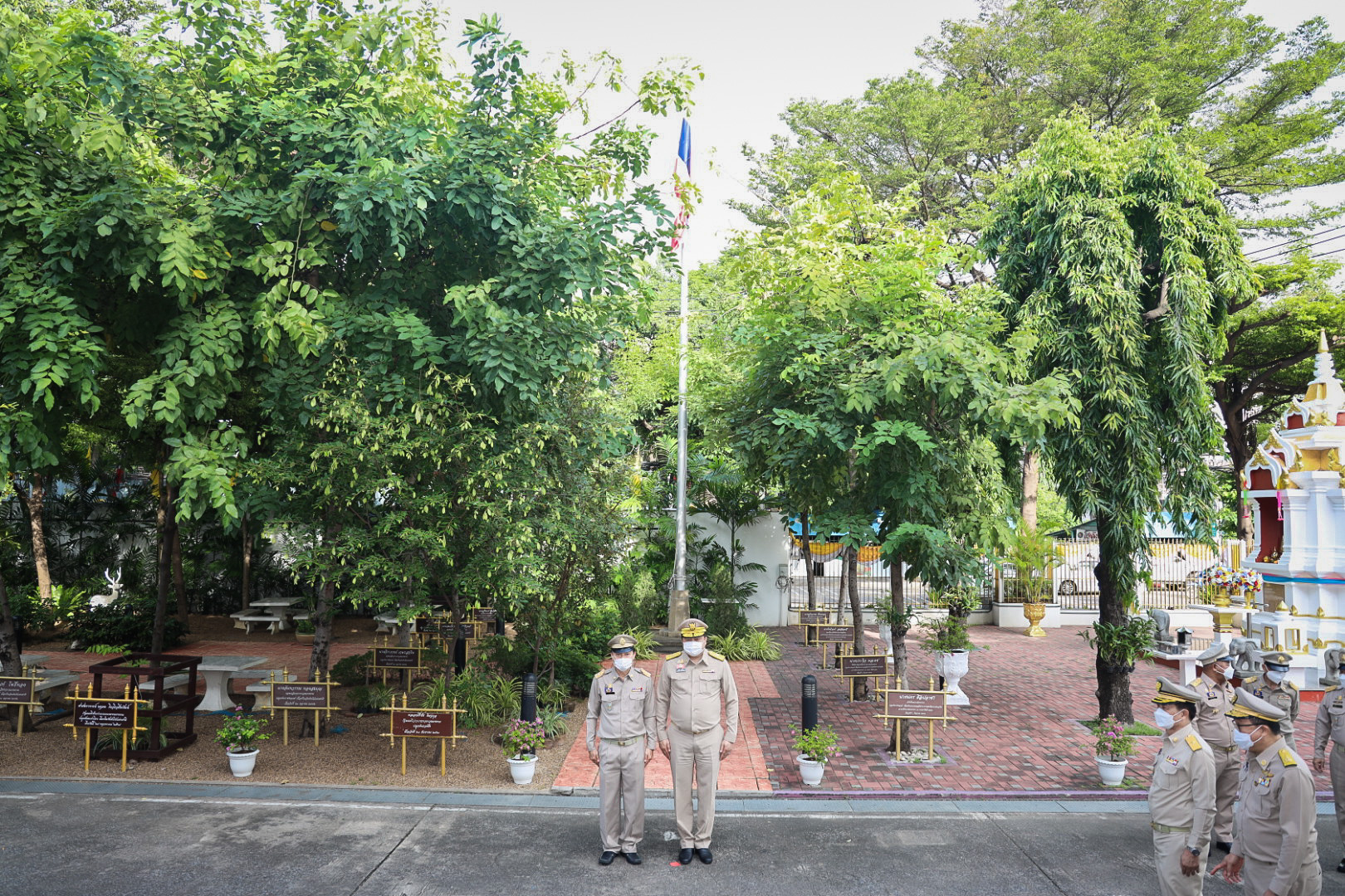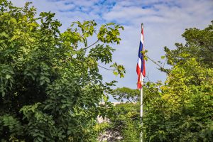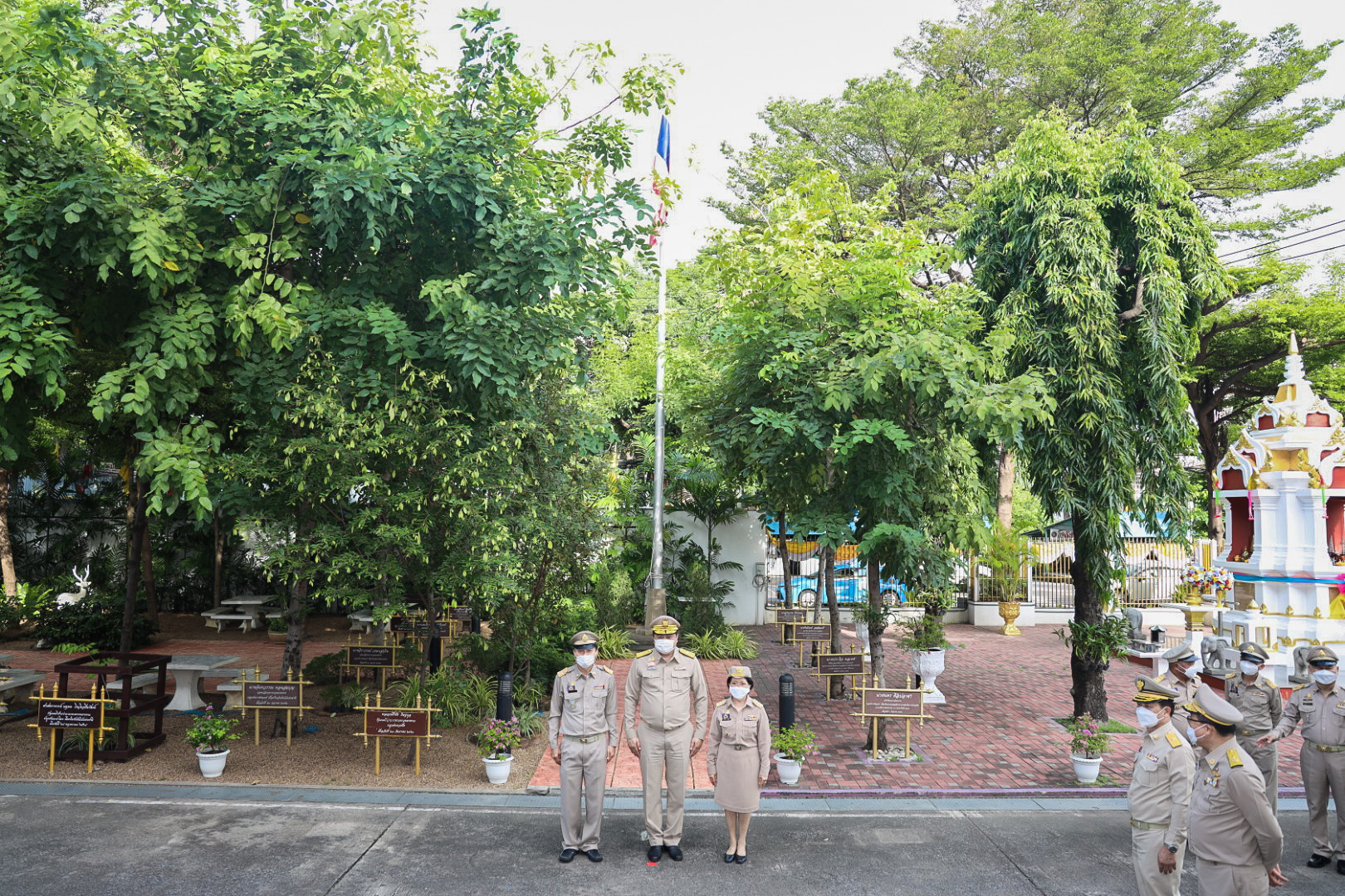 “The national flag is the highest symbol of the nation. The Thai flag originally came in many forms until the reign of King Rama VI, who was graciously pleased to enact a new Flag Act in B.E. 2460. At that time, Thailand joined World War I with the allied nations. Most of the flags had three colors. The Thai flag at that time was an oval shape, two parts wide, three parts long. It had a dark blue stripe, 1 part wide, which divided three parts of the flag’s width in the middle. There was a white stripe 1 part wide divided 6 of the flag’s width on each side, and there was a red stripe as wide as the white stripe on each side of the outer layer. The flag was called the “Tricolor flag.” Each of the flag’s colours had a meeting. Red meant the nation, that is, the people. White means religion, and blue means the King. The tricolor flag or Thai flag is considered the highest symbol of the nation. It is a reminder for young people to remember the sacrifice of their ancestors, to preserve the land and the hearts of the whole nation to be one. It symbolizes love and unity to promote pride in the nation and creates a great power for the development of the Thai nation,” concluded Mr. Suchart.