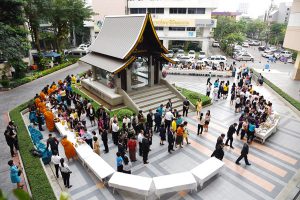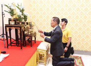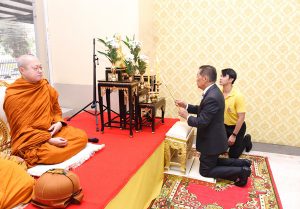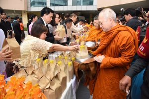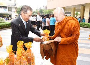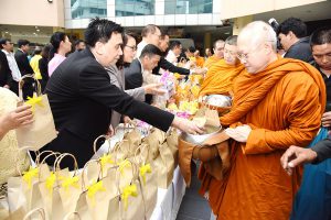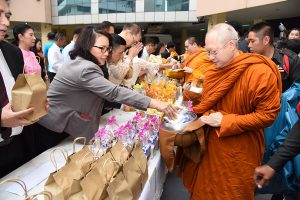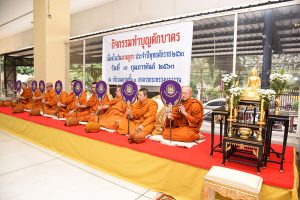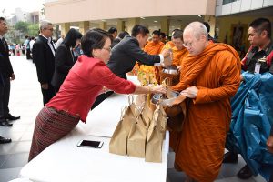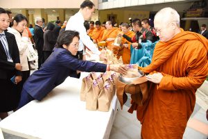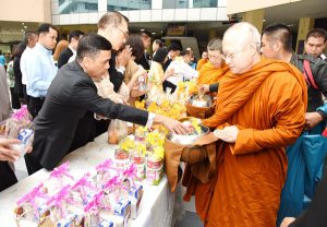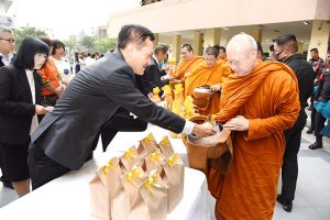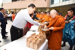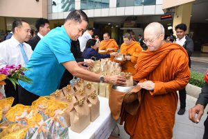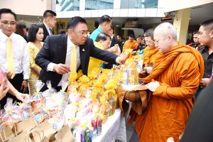 On February 7, 2020, at 07.30 hours, Labour Minister M.R. Chatumongol Sonakul, presided over the merit-making ceremony for February 2020. Permanent Secretary of Labour Mr. Suthi Sukosol and the Ministry of Labour’s executives, civil servants and officials also participated in the merit-making activities to give alms to 9 the monks from Phraram 9 Temple, Kanchanaphisek, in front of the Phra Phutthasuttham Bophit Pavilion, Ministry of Labour.