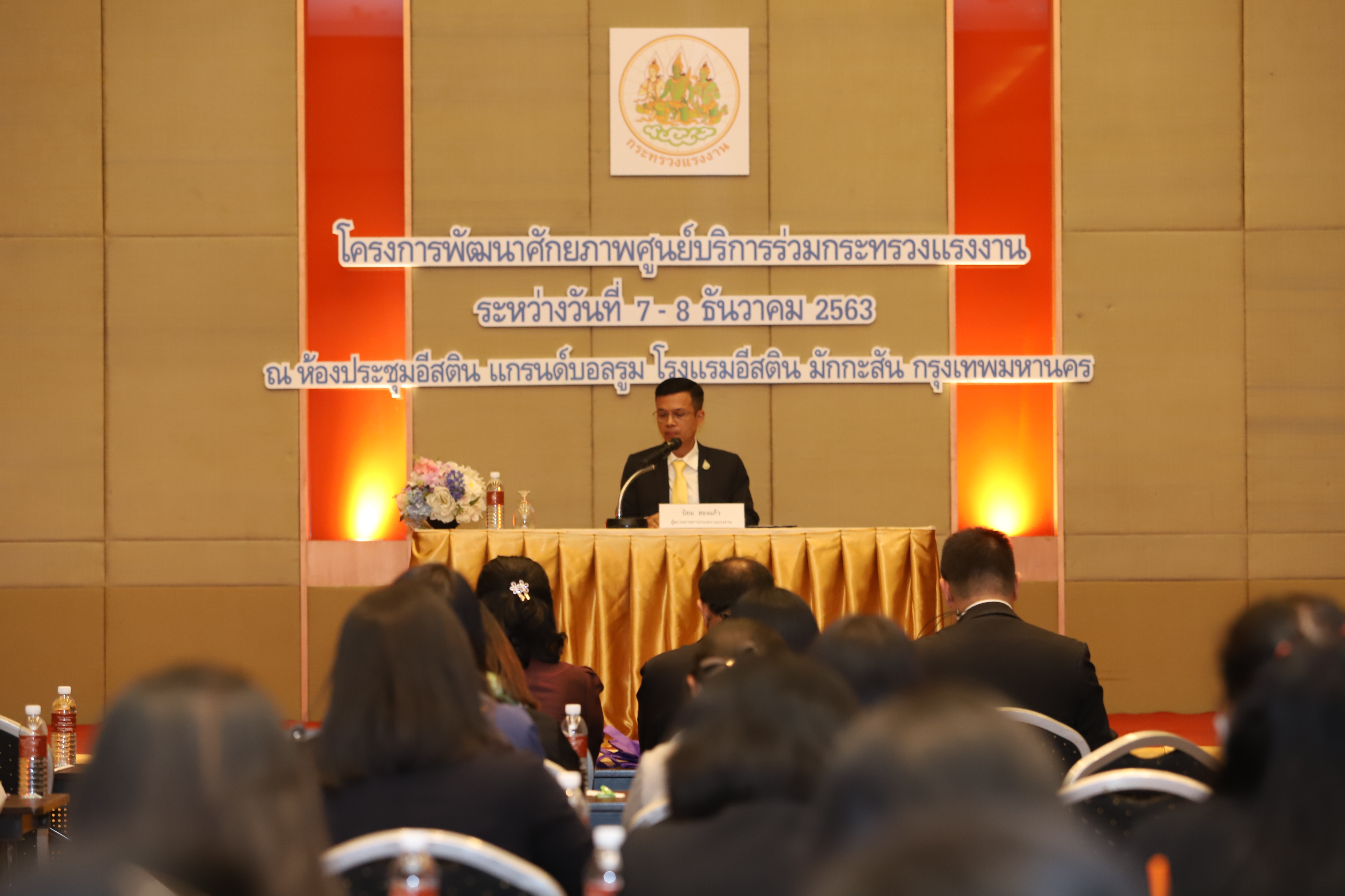 On December 7, 2020, at 15.30 hours, Permanent Secretary of Labour Mr. Suthi Sukosol assigned the Ministry of Labour’s Inspector-General Mr. Niyom Songkaew to preside over the opening of the “Ministry of Labour’s Joint Service Center Project” at the Grand Ballroom, 8th floor, Eastin Hotel Makkasan, Bangkok. The workshop was organized to create knowledge and understanding of serving people with the Ministry of Labour’s e-Service system to increase labour knowledge to develop public relations skills via online channels. The event was honoured by representatives of the Social Security Office to give lectures on missions provided through the e-Service system and speakers from the Rajamangala University of Technology Thanyaburi. The meeting took place from December 7-8, 2020. It was attended by 128 people, comprising of mentors from 62 Provincial Labour Offices, 64 workers at the Ministry of Labour’s Joint Service Center, and observers from the Songkhla and Narathiwat Provincial Labour Offices.