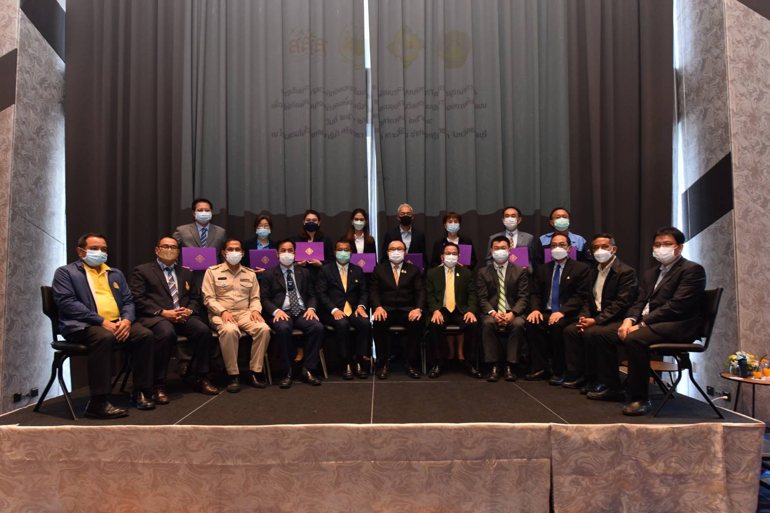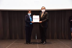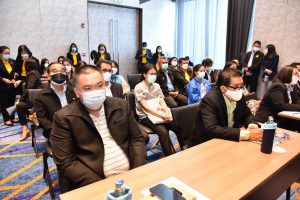 Project Executive Chairman, Mr. Arthit Ismo, said that today’s activities consisted of two parts. The first part was the lessons learned to develop the next lifestyle management system or Next Normal. Burapha University was assigned to be responsible for the implementation and research conclusions presented to the steering committee chaired by the Permanent Secretary of Labour, to consider as a policy guideline of strategic partners with the Thai Health Promotion Foundation as a policy coordinator. The second part was the awarding of certificates to 35 enterprises that have overcome the COVID-19 crisis, changing their working methods based on safety and health guidelines for workers to be disease-free and safe, ensuring secure workplaces. Their efforts promote morale among employers and employees to become a wellness organization. The organizations participating in the project to create a model wellness organization will enhance the quality of life of workers towards sustainability.