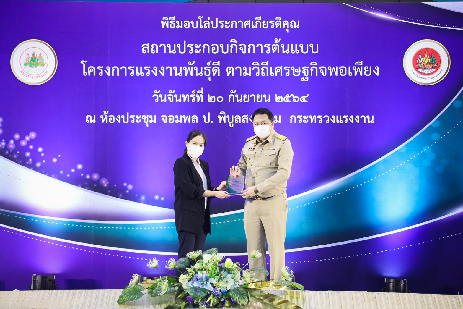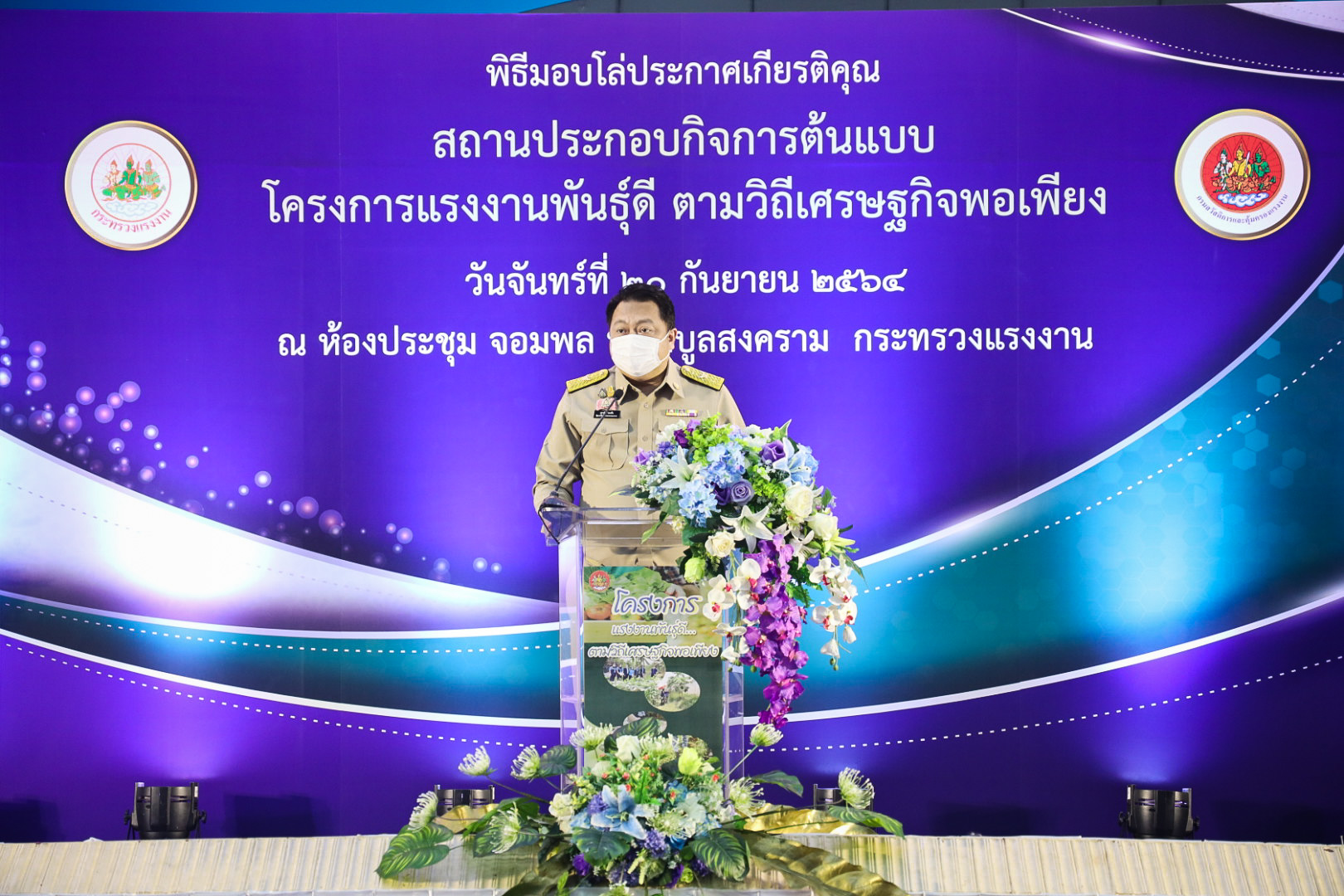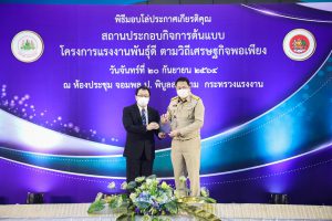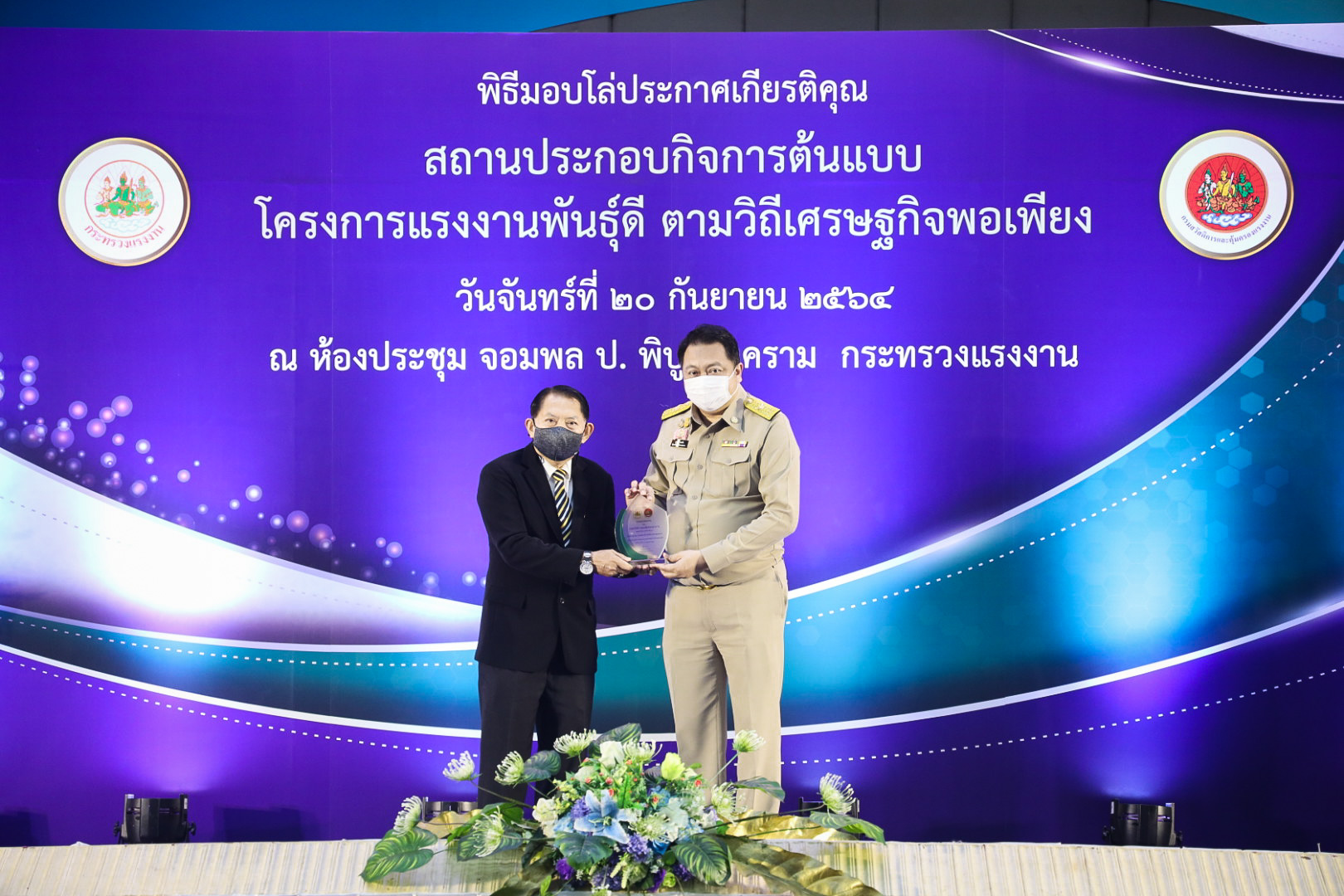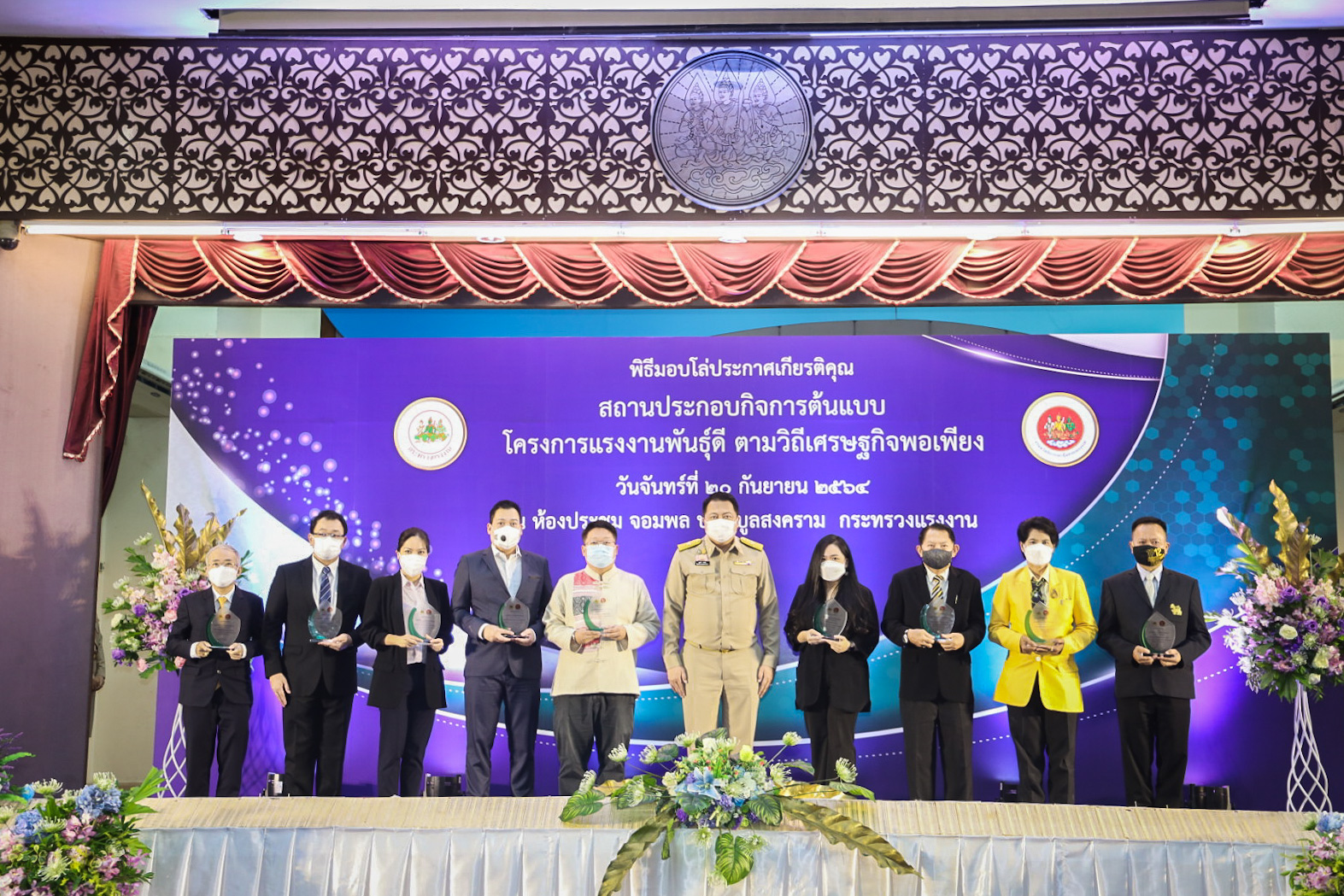 On September 20, 2021, Labour Minister Mr. Suchart Chomklin presided over the ceremony to award trophies to nine enterprises selected as models for labour projects according to the sufficiency economy. The occasion took place at the Jompol P. Pibulsongkram meeting room, 5th floor, Ministry of Labour. Assistant to the Labour Minister Mr. Surachai Chaitrakulthong, the Labour Minister’s Advisor, Mrs. Thiwalrat Angkinan, Secretariat to the Labour Minister Mr. Suthep Chitayawong, the Ministry of Labour’s Spokesperson (on politics) Mrs. Theanrat Nawamawat, Permanent Secretary of Labour Mr. Suthi Sukosol, and the Ministry of Labour’s senior executives also joined the occasion. Mr. Suchart said that the COVID-19 situation has greatly affected the employment and livelihood of employees. The Ministry of Labour considers that in such situations, the important thing that will lead employees to overcome obstacles and have a good quality of life is adopting the sufficiency economy philosophy as a solution to the problem. Thus, the Ministry of Labour designed the concept of a good labour project following the sufficiency economy philosophy, which aims to improve the quality of life of employees, that supports and encourages employers to provide welfare on top of statutory requirements for employees, so that establishments allocate existing resources for employees to use. For example, providing empty areas around the workplace for employees to use their free time after work to cultivate vegetable gardens and raise animals produced by employees to exchange and consume in the household. The remaining produce from consumption can be sold in the community. The initiative reduces the burden of expenses and increases income for employees. It also enhances the knowledge of new agricultural theory for employees, which is supplementary career development for employees entering retirement age, becoming self-reliant, and sharing happiness with their family, colleagues, employers, and community. It is considered a good foundation for improving the quality of life and the development of the economy and society of the nation.