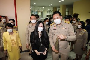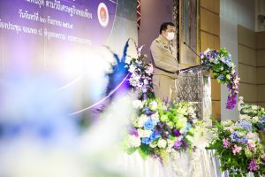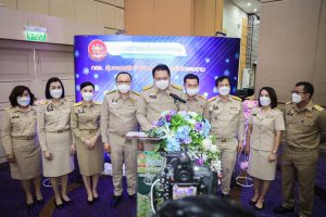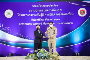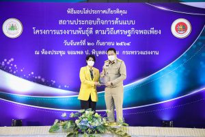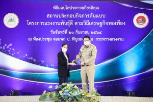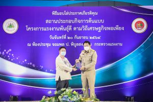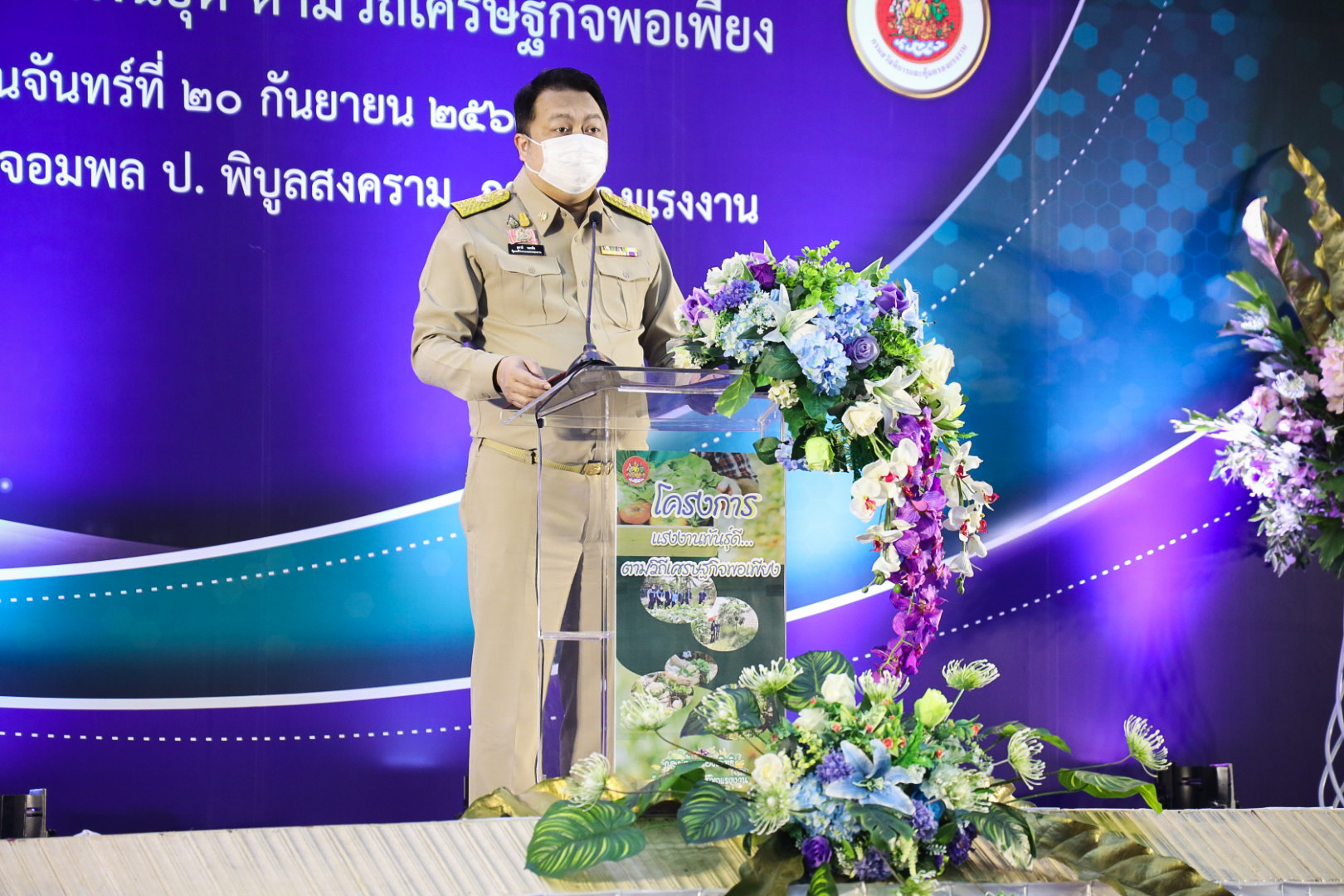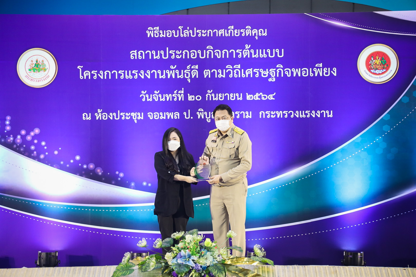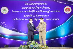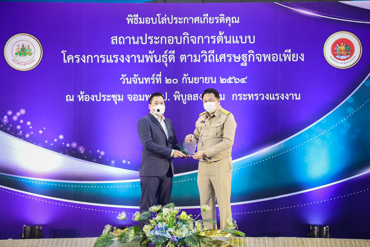 On September 20, 2021, Labour Minister Mr. Suchart Chomklin presided over the ceremony to award trophies to nine enterprises selected as models for labour projects according to the sufficiency economy. The occasion took place at the Jompol P. Pibulsongkram meeting room, 5th floor, Ministry of Labour. Assistant to the Labour Minister Mr. Surachai Chaitrakulthong, the Labour Minister’s Advisor, Mrs. Thiwalrat Angkinan, Secretariat to the Labour Minister Mr. Suthep Chitayawong, the Ministry of Labour’s Spokesperson (on politics) Mrs. Theanrat Nawamawat, Permanent Secretary of Labour Mr. Suthi Sukosol, and the Ministry of Labour’s senior executives also joined the occasion. Mr. Suchart said that the COVID-19 situation has greatly affected the employment and livelihood of employees. The Ministry of Labour considers that in such situations, the important thing that will lead employees to overcome obstacles and have a good quality of life is adopting the sufficiency economy philosophy as a solution to the problem. Thus, the Ministry of Labour designed the concept of a good labour project following the sufficiency economy philosophy, which aims to improve the quality of life of employees, that supports and encourages employers to provide welfare on top of statutory requirements for employees, so that establishments allocate existing resources for employees to use. For example, providing empty areas around the workplace for employees to use their free time after work to cultivate vegetable gardens and raise animals produced by employees to exchange and consume in the household. The remaining produce from consumption can be sold in the community. The initiative reduces the burden of expenses and increases income for employees. It also enhances the knowledge of new agricultural theory for employees, which is supplementary career development for employees entering retirement age, becoming self-reliant, and sharing happiness with their family, colleagues, employers, and community. It is considered a good foundation for improving the quality of life and the development of the economy and society of the nation.