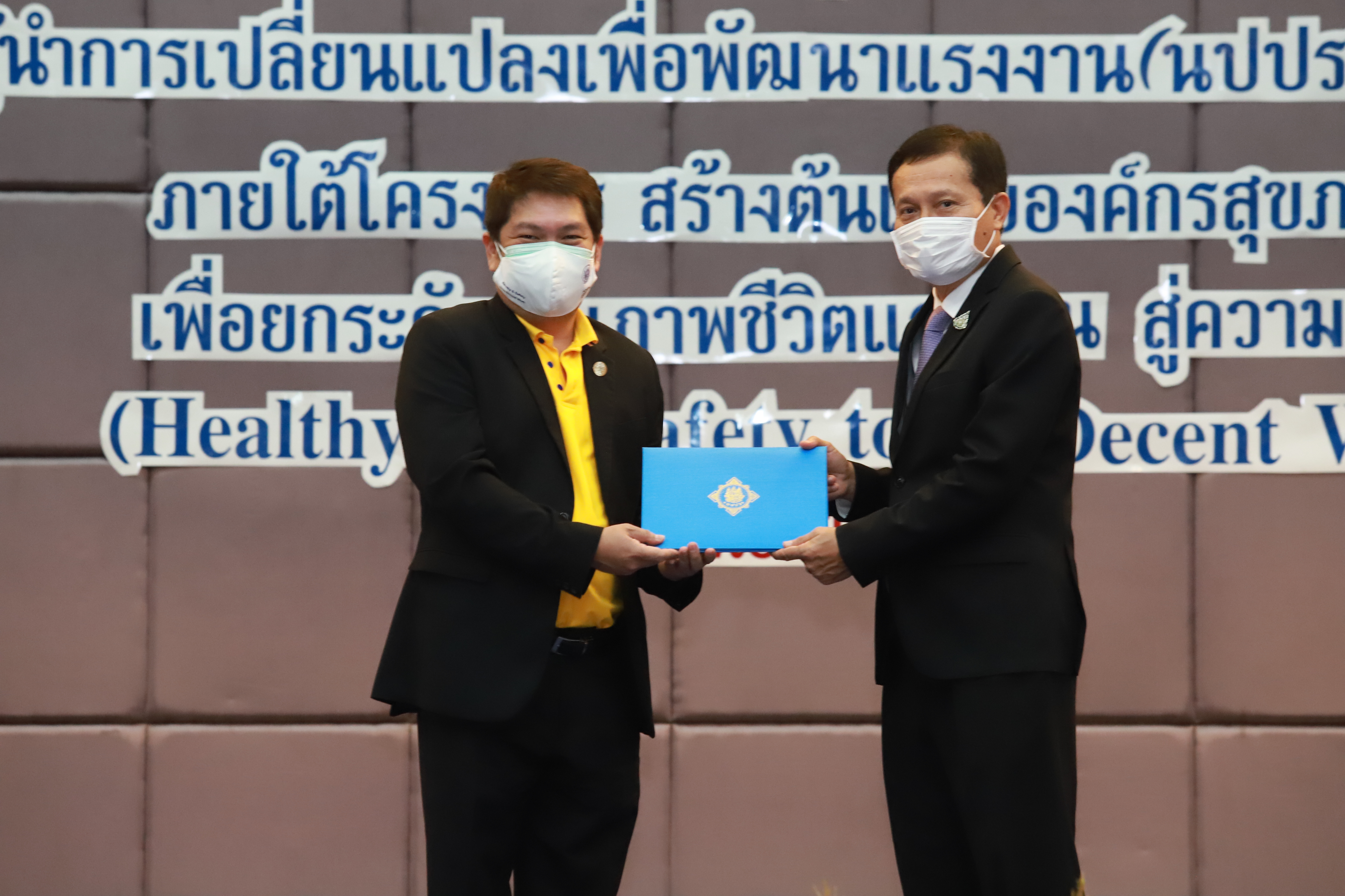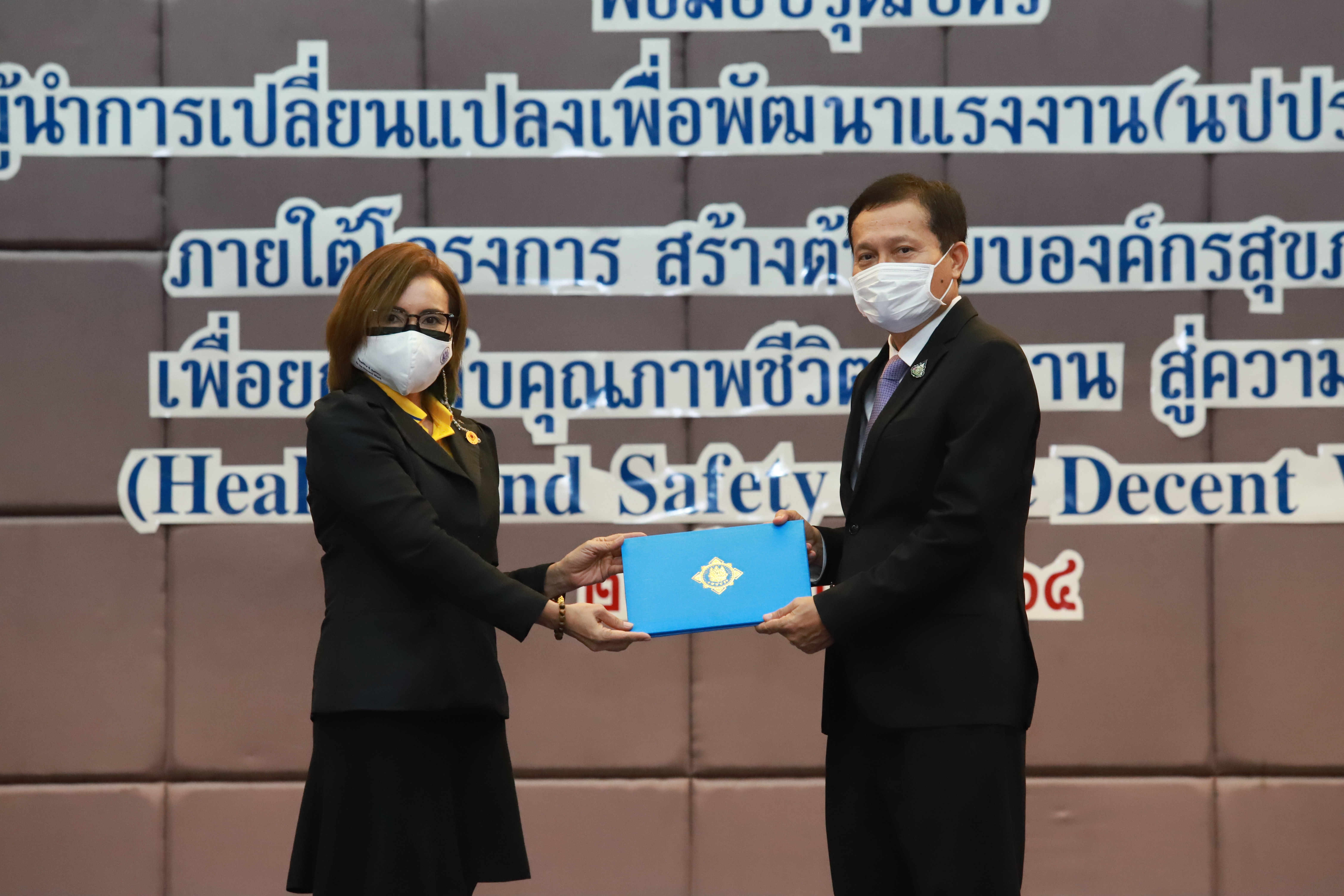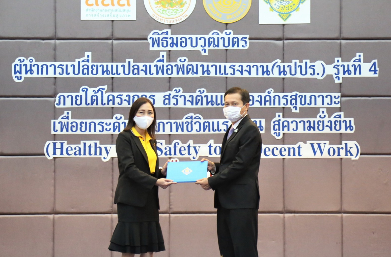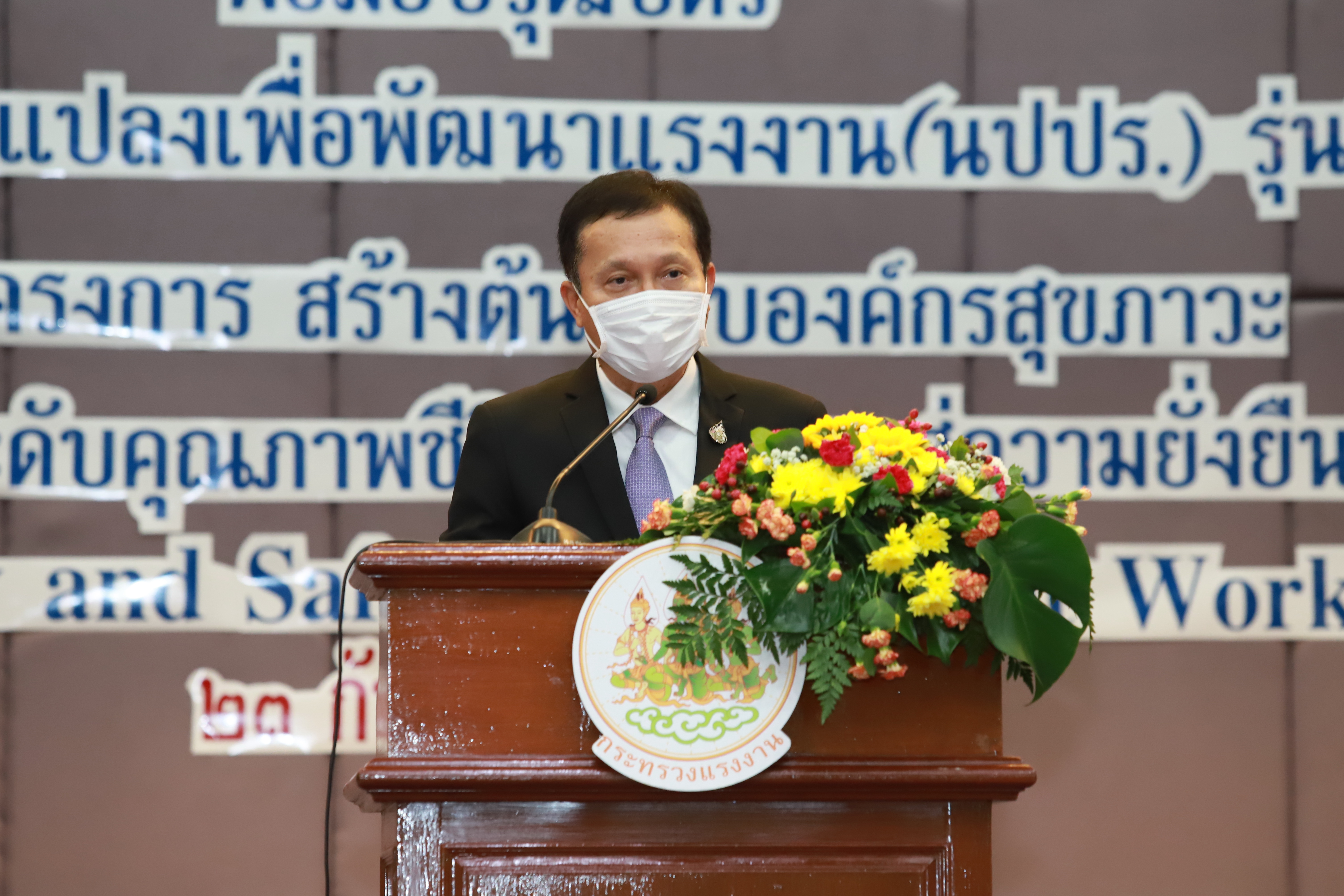 On September 23, 2021, Permanent Secretary of Labour Mr. Suthi Sukosol presided over the course certificate presentation ceremony for the “Leaders of Change for Labour Development, Class 4” at the Jompol P. Pibulsongkram meeting room, 5th floor, Ministry of Labour. Mr. Thapabutr Chomsevee, President of the Association for Leaders of Change for Labour Development, Mr. Arthit Ismo, Project Executive for the “Healthy and Safety to be Decent Work,” also participated in this event. Mr. Suthi said that he would like to congratulate those who have passed the course on “Leaders of Change for Labour Development, Class 4” under the “Healthy and Safety to be Decent Work” project which received the certificates today. The government attaches great importance to laying the foundation of the nation. A 20-year national strategy has been set as the direction of work. The Ministry of Labour’s main mission must be consistent with the changing situation as well. To drive such strategies, a visionary leader is essential. It also involves cooperation between related network partners. The Leaders of Change for Labour Development, Class 4, has participants from the government, the private sector, employers, employees, and academics. Therefore, it is suitable for a situation where the Ministry emphasizes co-thinking following bilateral, tripartite, and multilateral systems. These are important principles of modern administration that require leaders with new paradigms, understanding people, and understanding the world situation comprehensively. Leaders must encompass new knowledge and skills needed to work in a complex workforce and rapidly changing environment, including new leadership ready to lead the change. It requires a Change Agent who dares to think and dares to act to drive the development strategy to keep up with the changes and lead to the organization’s success to create valuable jobs, workers, good quality of life, and happiness.