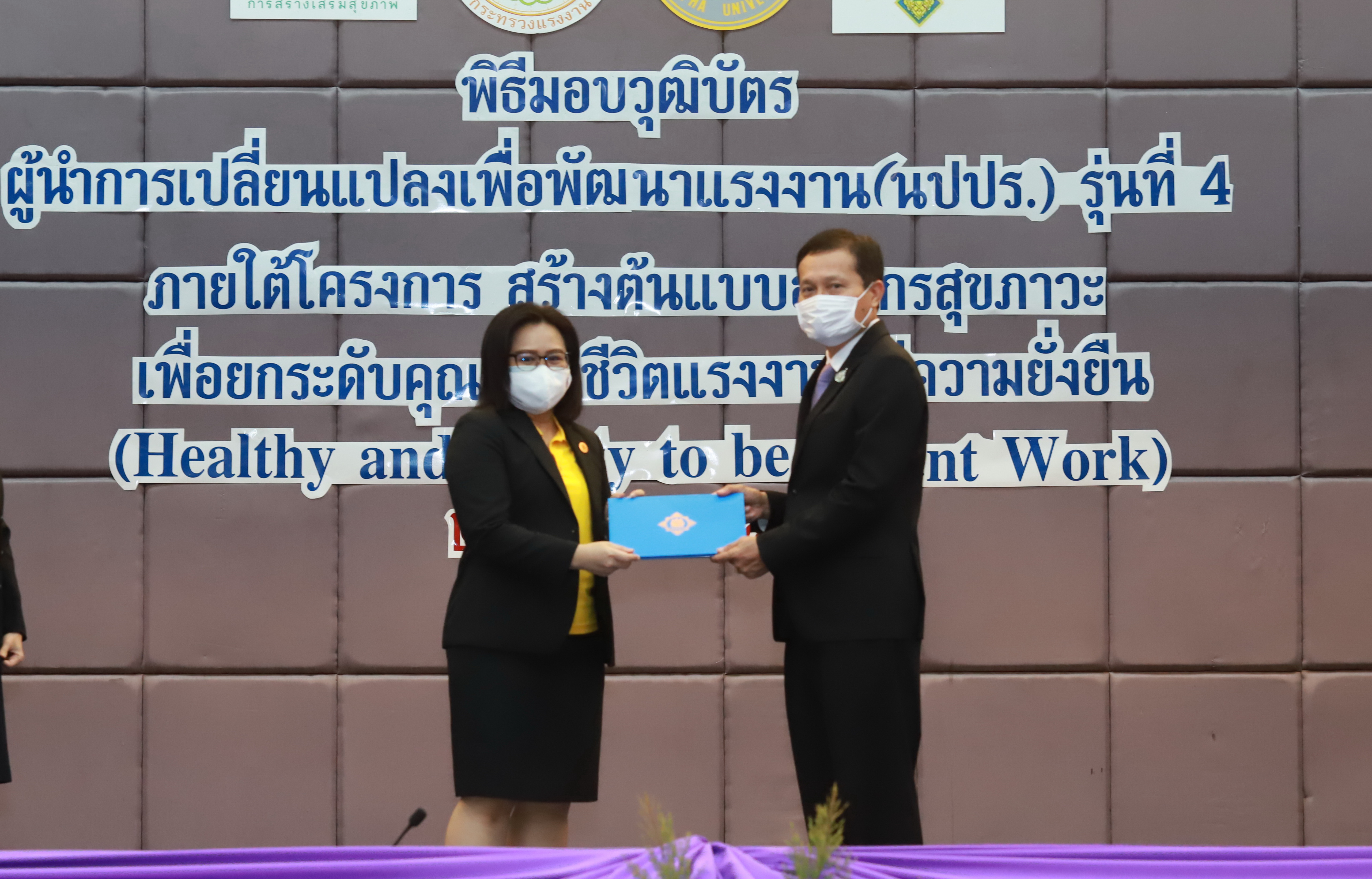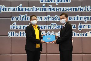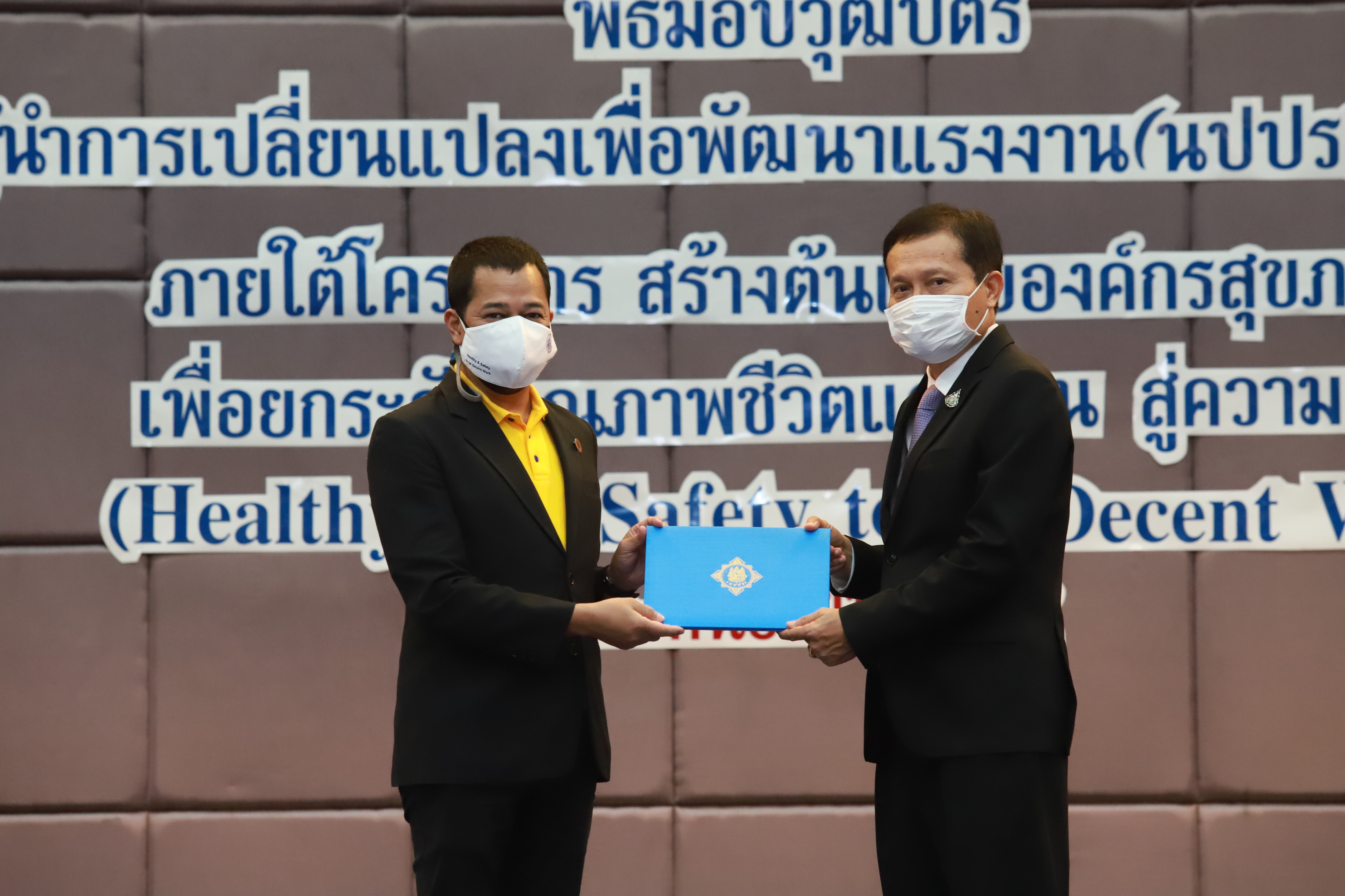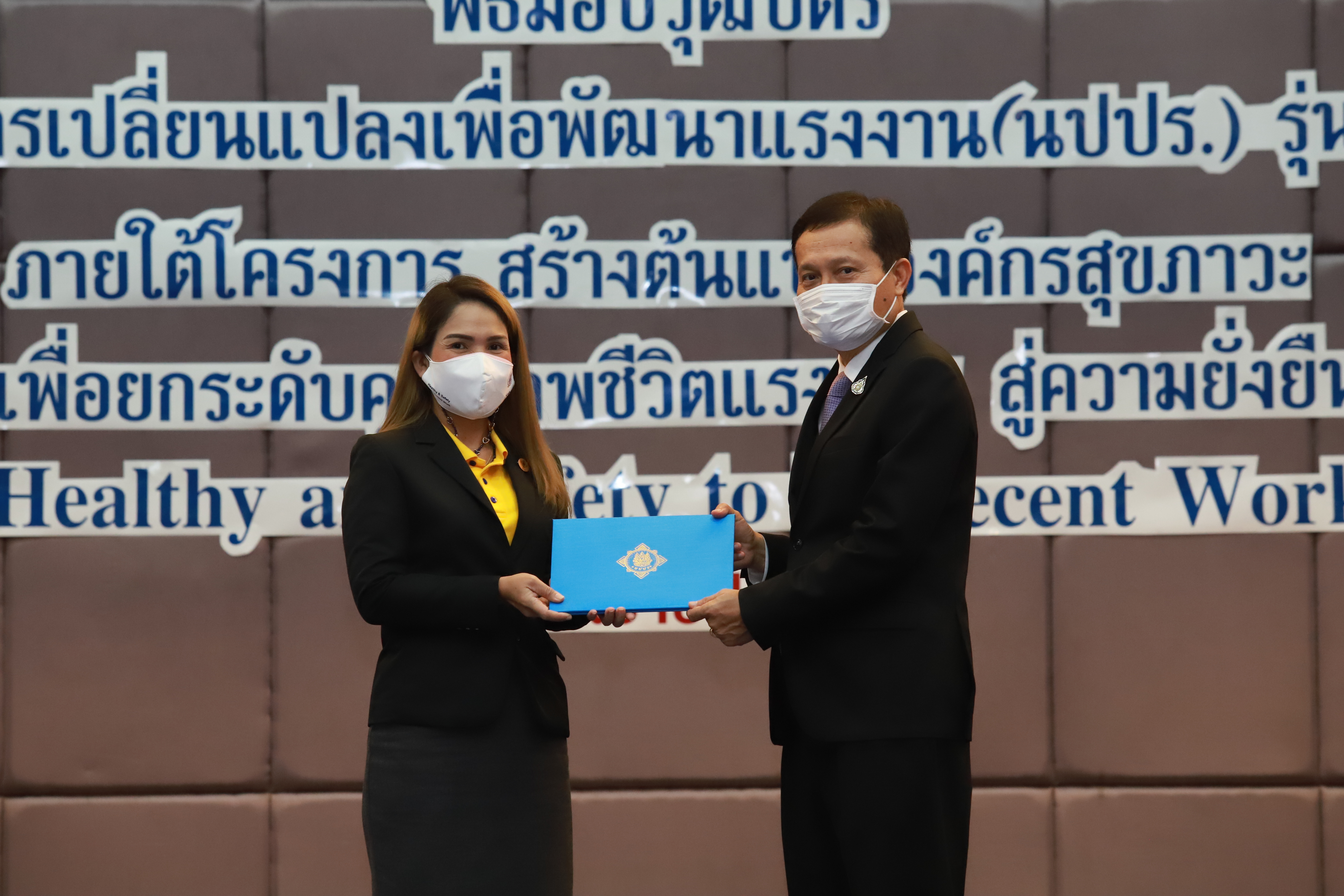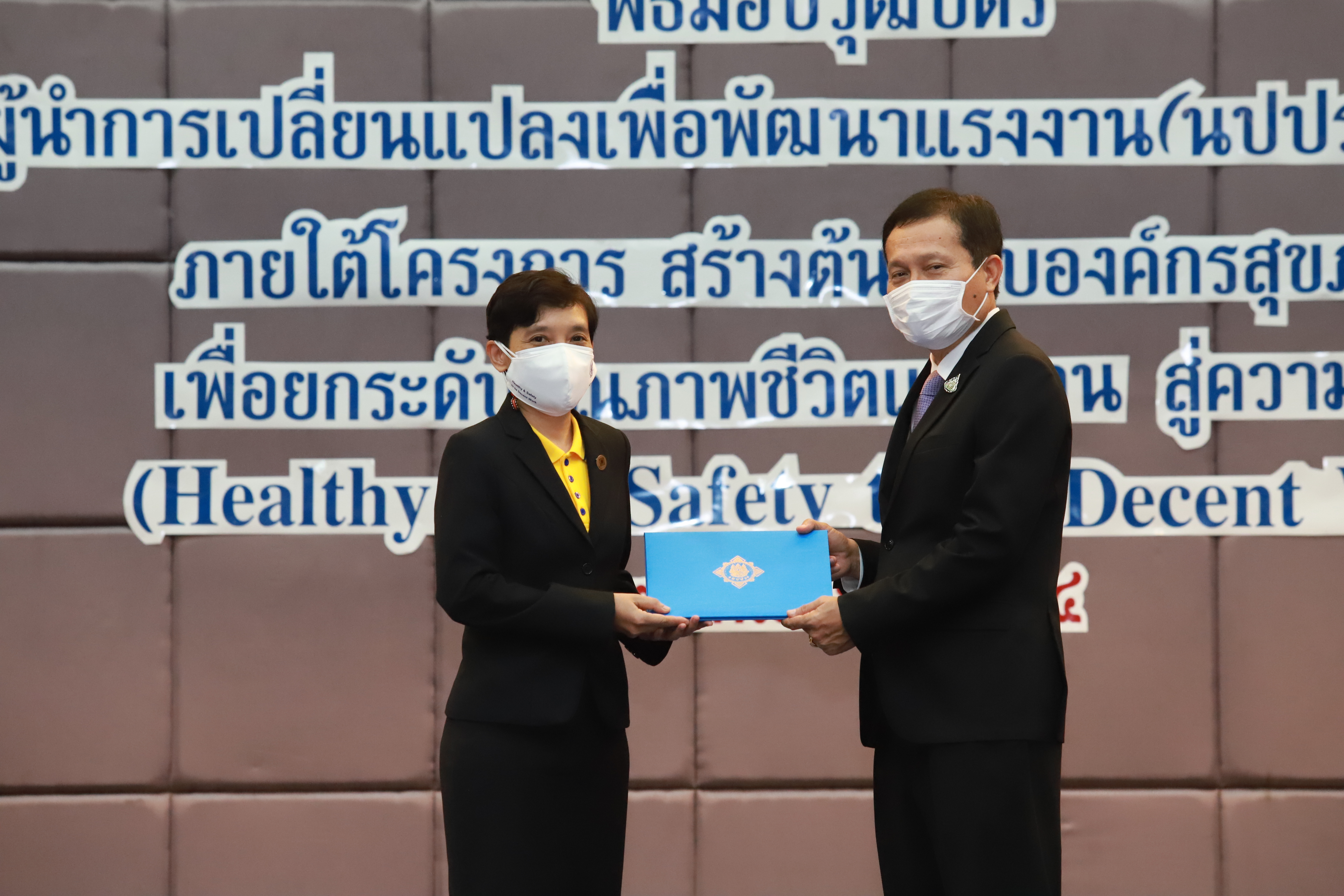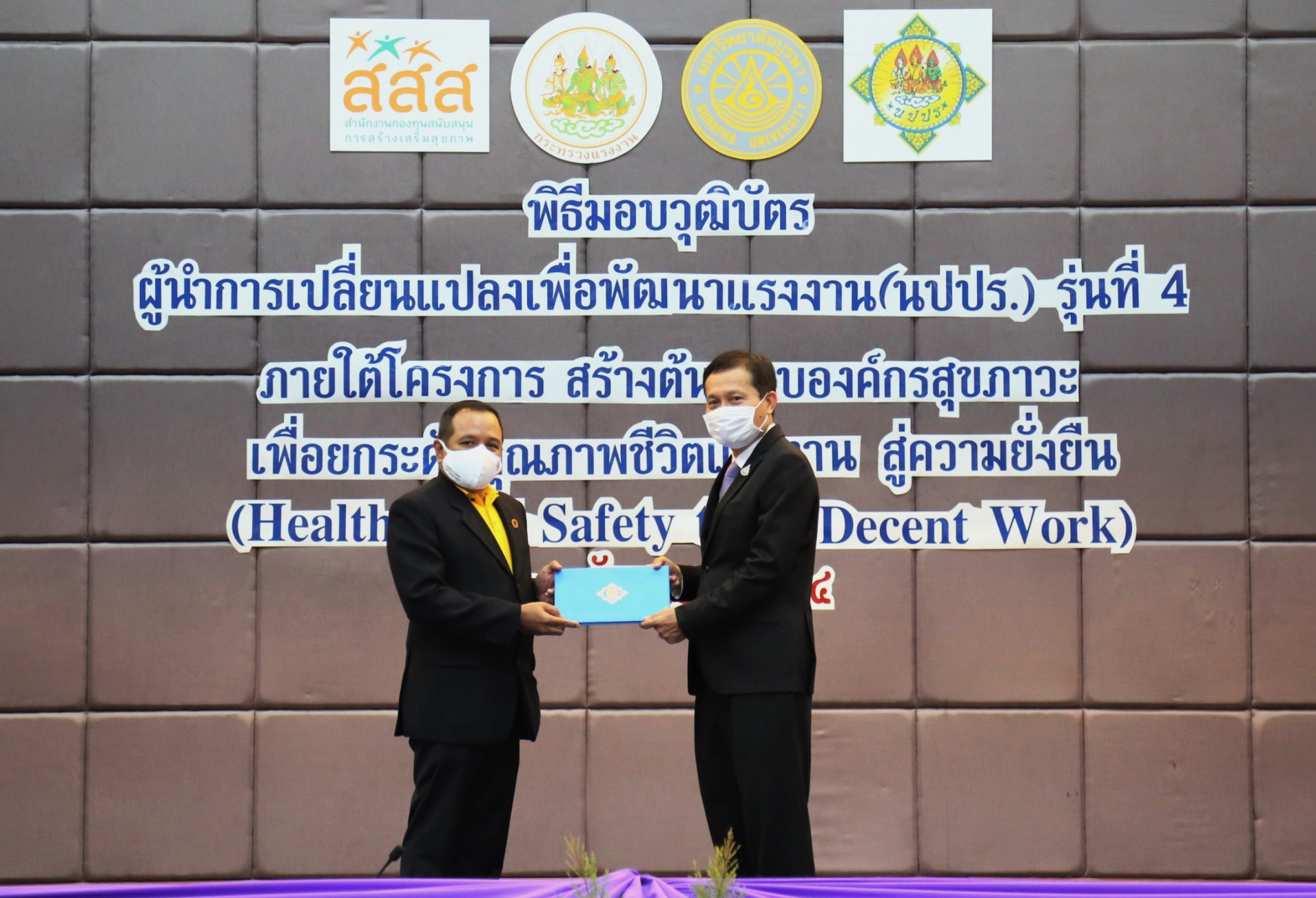 On September 23, 2021, Permanent Secretary of Labour Mr. Suthi Sukosol presided over the course certificate presentation ceremony for the “Leaders of Change for Labour Development, Class 4” at the Jompol P. Pibulsongkram meeting room, 5th floor, Ministry of Labour. Mr. Thapabutr Chomsevee, President of the Association for Leaders of Change for Labour Development, Mr. Arthit Ismo, Project Executive for the “Healthy and Safety to be Decent Work,” also participated in this event. Mr. Suthi said that he would like to congratulate those who have passed the course on “Leaders of Change for Labour Development, Class 4” under the “Healthy and Safety to be Decent Work” project which received the certificates today. The government attaches great importance to laying the foundation of the nation. A 20-year national strategy has been set as the direction of work. The Ministry of Labour’s main mission must be consistent with the changing situation as well. To drive such strategies, a visionary leader is essential. It also involves cooperation between related network partners. The Leaders of Change for Labour Development, Class 4, has participants from the government, the private sector, employers, employees, and academics. Therefore, it is suitable for a situation where the Ministry emphasizes co-thinking following bilateral, tripartite, and multilateral systems. These are important principles of modern administration that require leaders with new paradigms, understanding people, and understanding the world situation comprehensively. Leaders must encompass new knowledge and skills needed to work in a complex workforce and rapidly changing environment, including new leadership ready to lead the change. It requires a Change Agent who dares to think and dares to act to drive the development strategy to keep up with the changes and lead to the organization’s success to create valuable jobs, workers, good quality of life, and happiness.