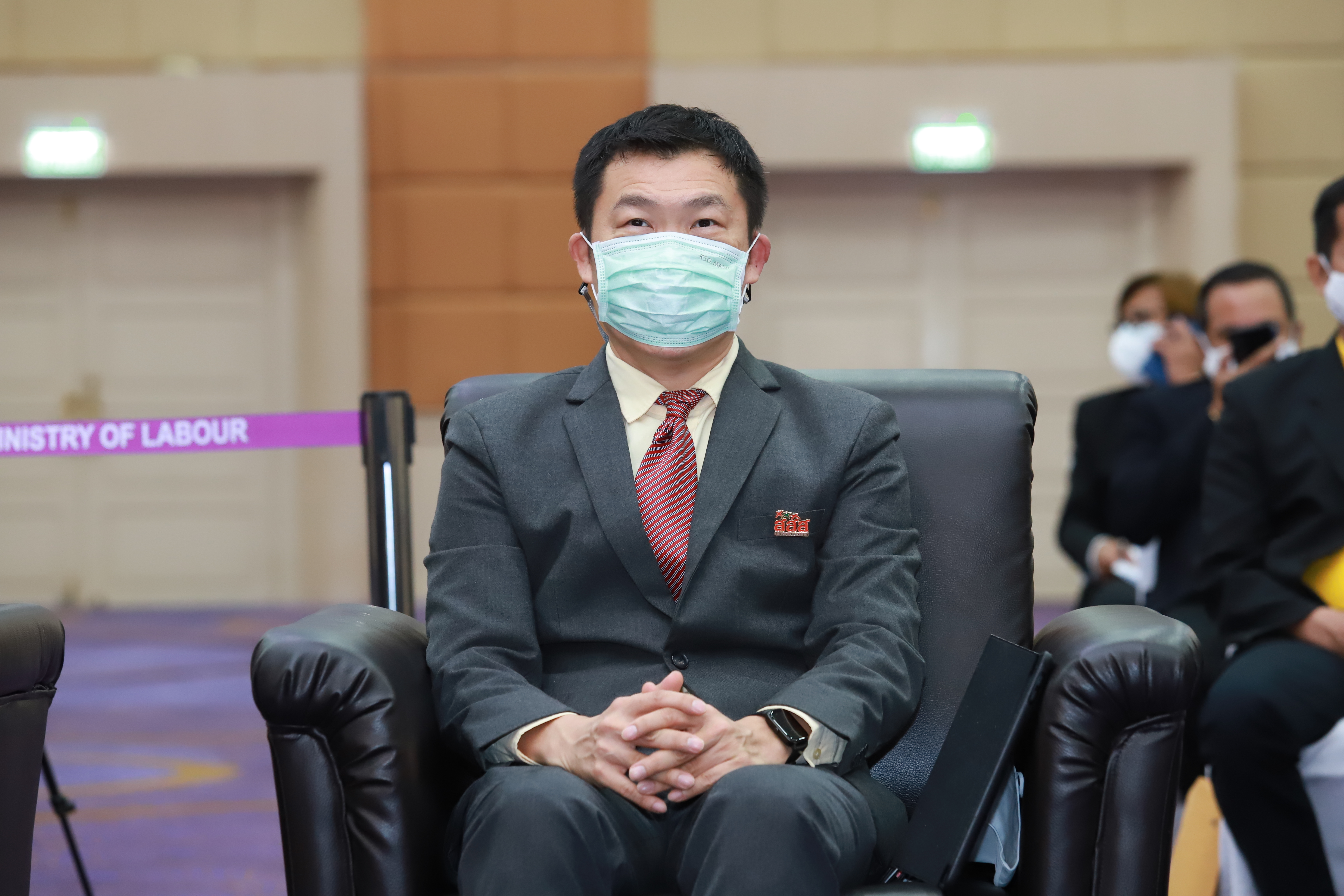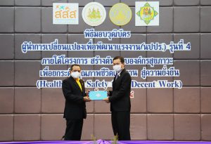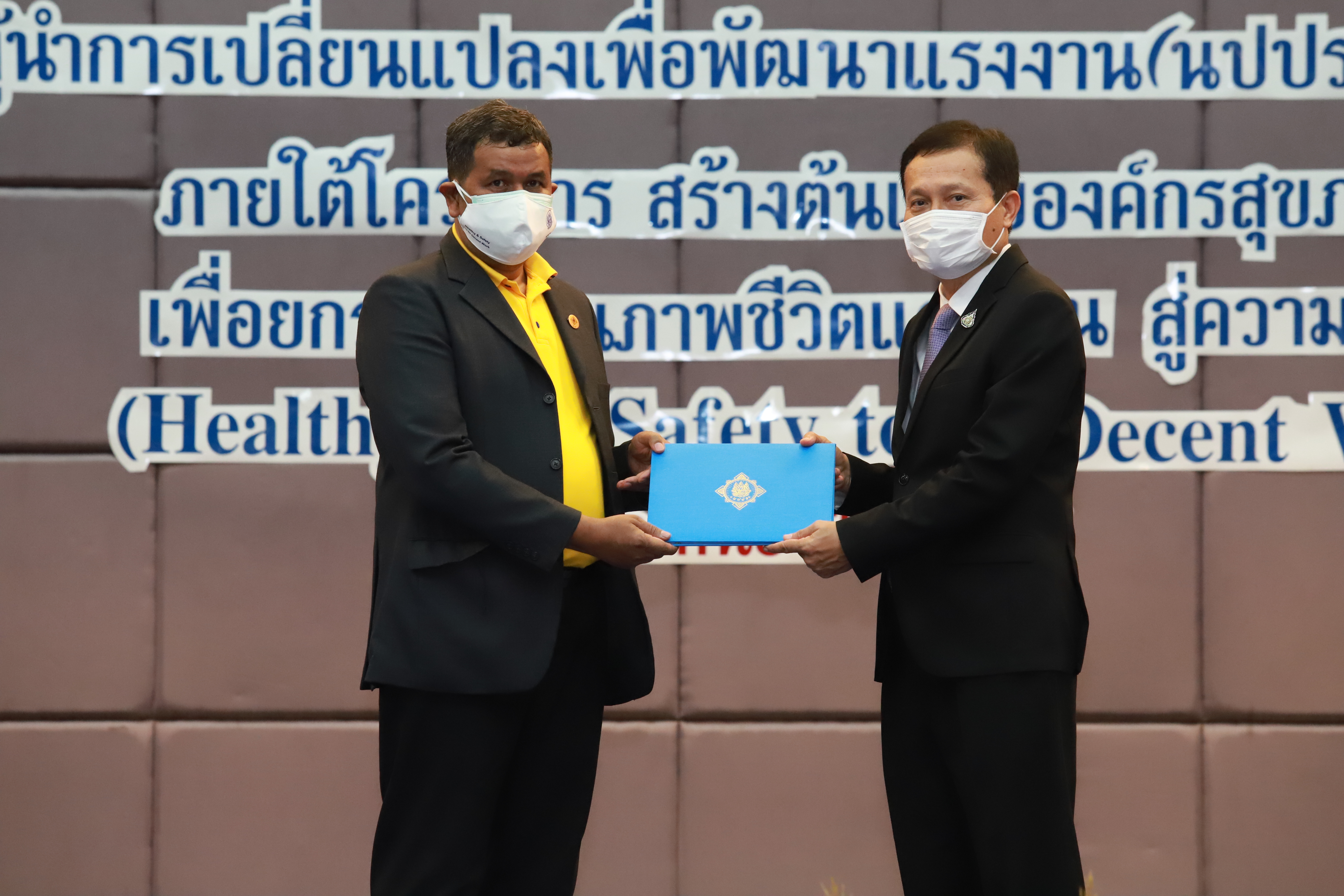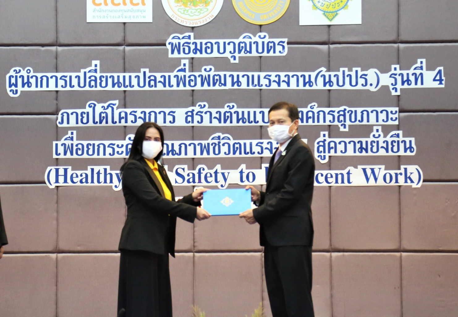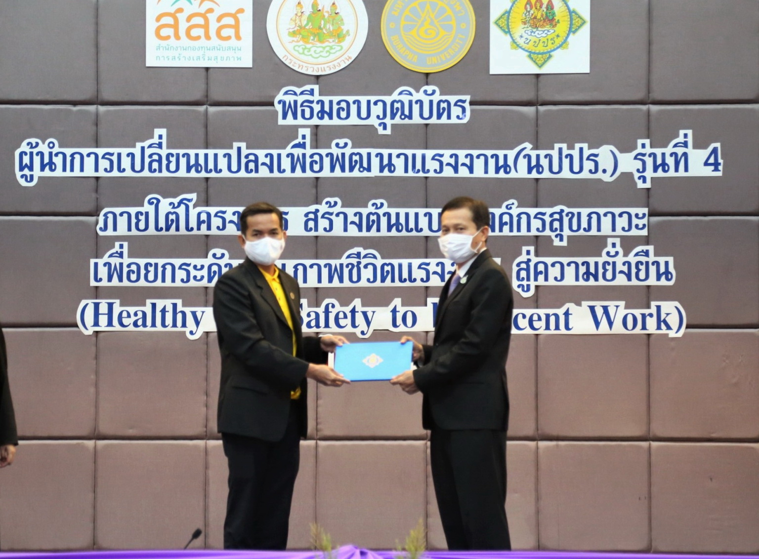 On September 23, 2021, Permanent Secretary of Labour Mr. Suthi Sukosol presided over the course certificate presentation ceremony for the “Leaders of Change for Labour Development, Class 4” at the Jompol P. Pibulsongkram meeting room, 5th floor, Ministry of Labour. Mr. Thapabutr Chomsevee, President of the Association for Leaders of Change for Labour Development, Mr. Arthit Ismo, Project Executive for the “Healthy and Safety to be Decent Work,” also participated in this event. Mr. Suthi said that he would like to congratulate those who have passed the course on “Leaders of Change for Labour Development, Class 4” under the “Healthy and Safety to be Decent Work” project which received the certificates today. The government attaches great importance to laying the foundation of the nation. A 20-year national strategy has been set as the direction of work. The Ministry of Labour’s main mission must be consistent with the changing situation as well. To drive such strategies, a visionary leader is essential. It also involves cooperation between related network partners. The Leaders of Change for Labour Development, Class 4, has participants from the government, the private sector, employers, employees, and academics. Therefore, it is suitable for a situation where the Ministry emphasizes co-thinking following bilateral, tripartite, and multilateral systems. These are important principles of modern administration that require leaders with new paradigms, understanding people, and understanding the world situation comprehensively. Leaders must encompass new knowledge and skills needed to work in a complex workforce and rapidly changing environment, including new leadership ready to lead the change. It requires a Change Agent who dares to think and dares to act to drive the development strategy to keep up with the changes and lead to the organization’s success to create valuable jobs, workers, good quality of life, and happiness.