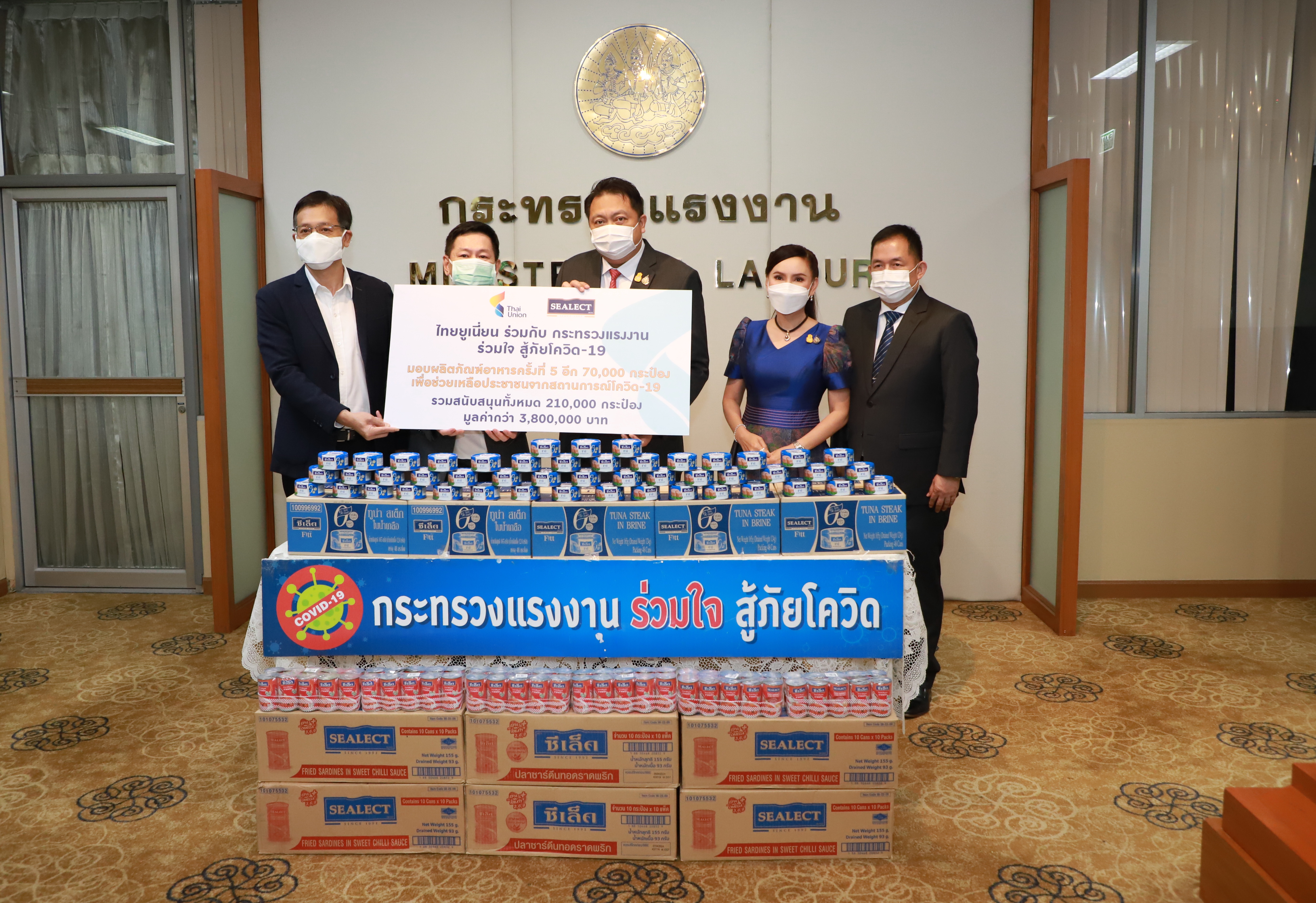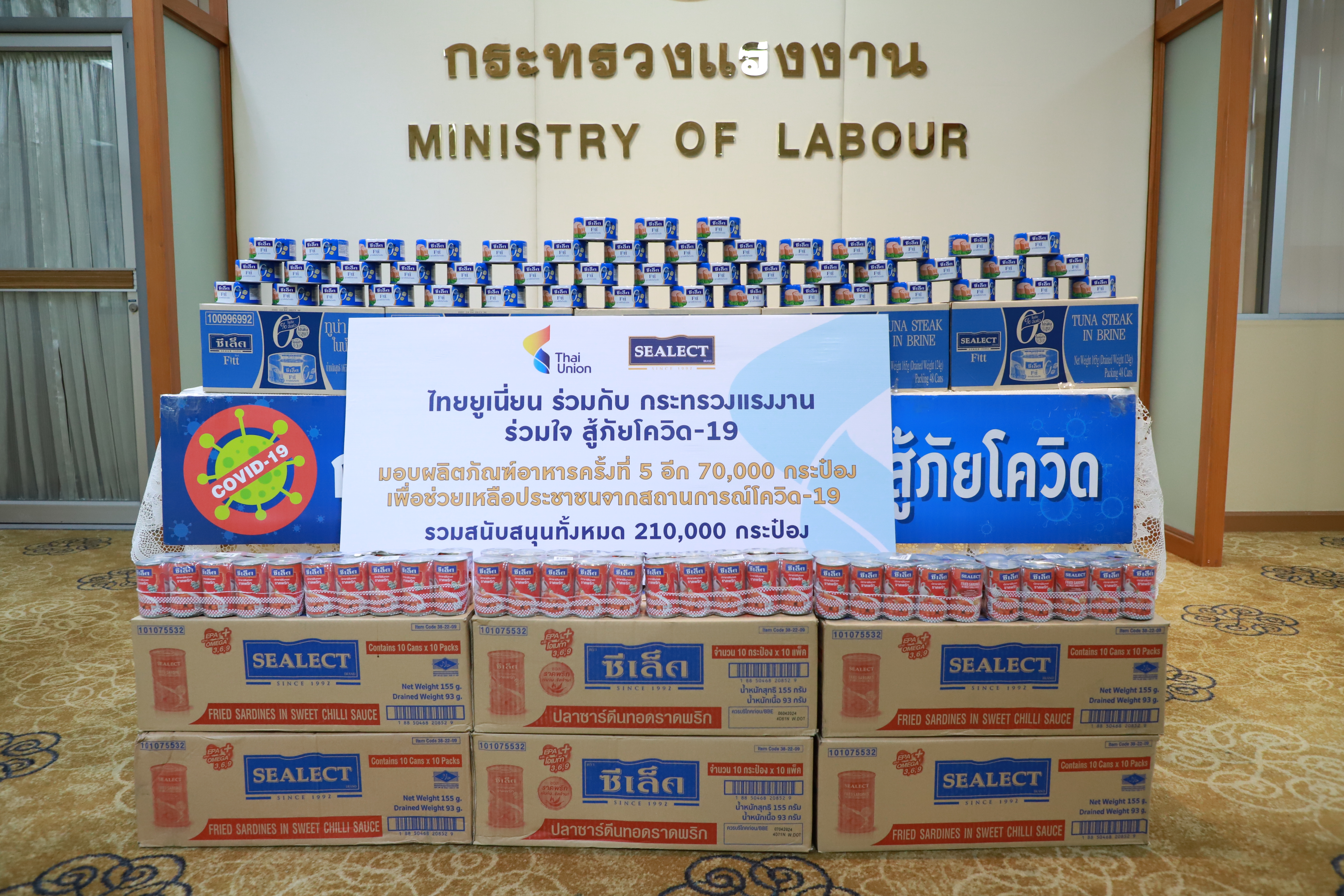 MOL Receives Canned Food to Support People Impacted by COVID-19The Labour Minister thanked the private sector, such as Thai Union Group PCL, for donating 70,000 cans of food to the Ministry of Labour to help workers in difficult times. The effort follows the intention of the Prime Minister and government policies without leaving anyone behind.