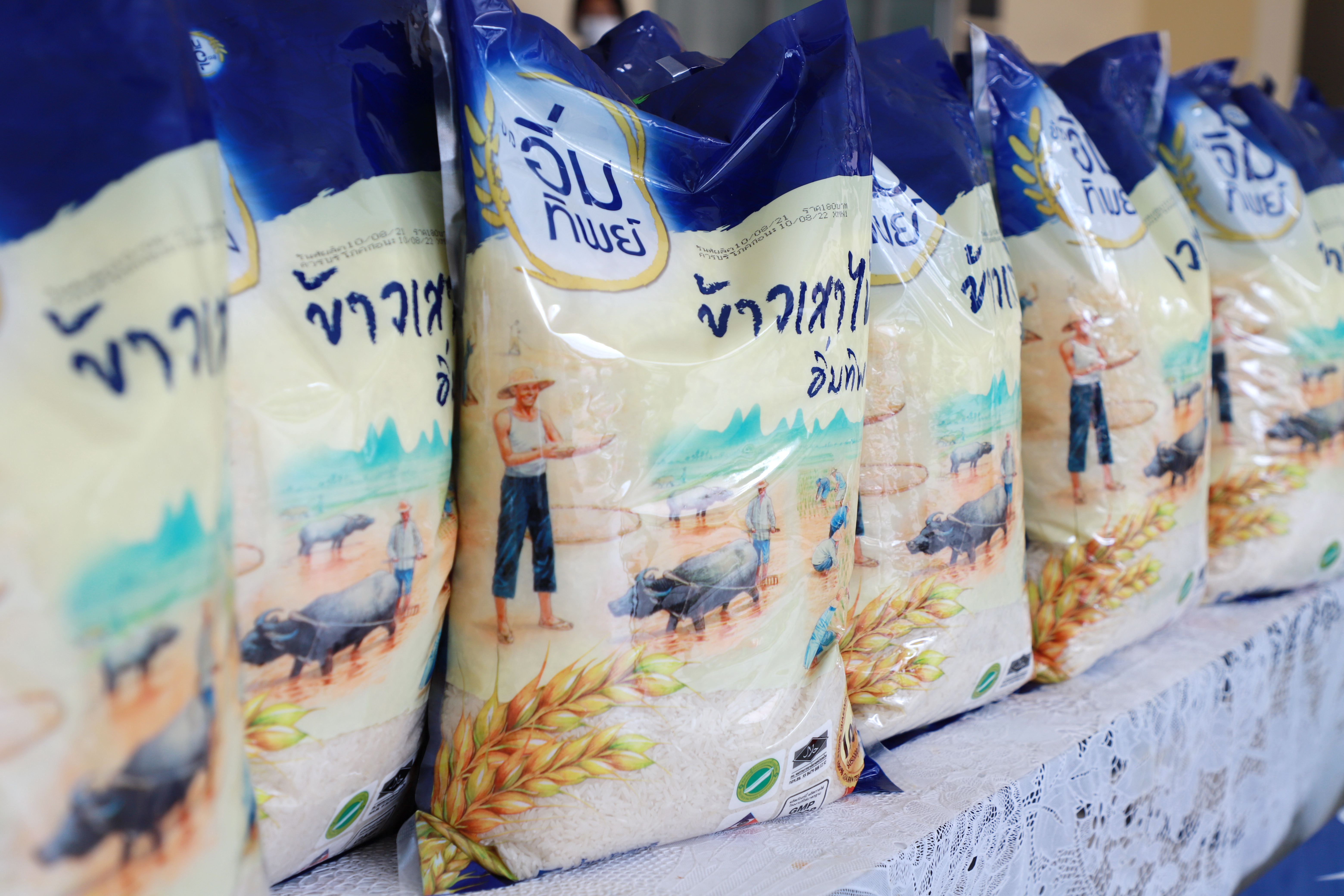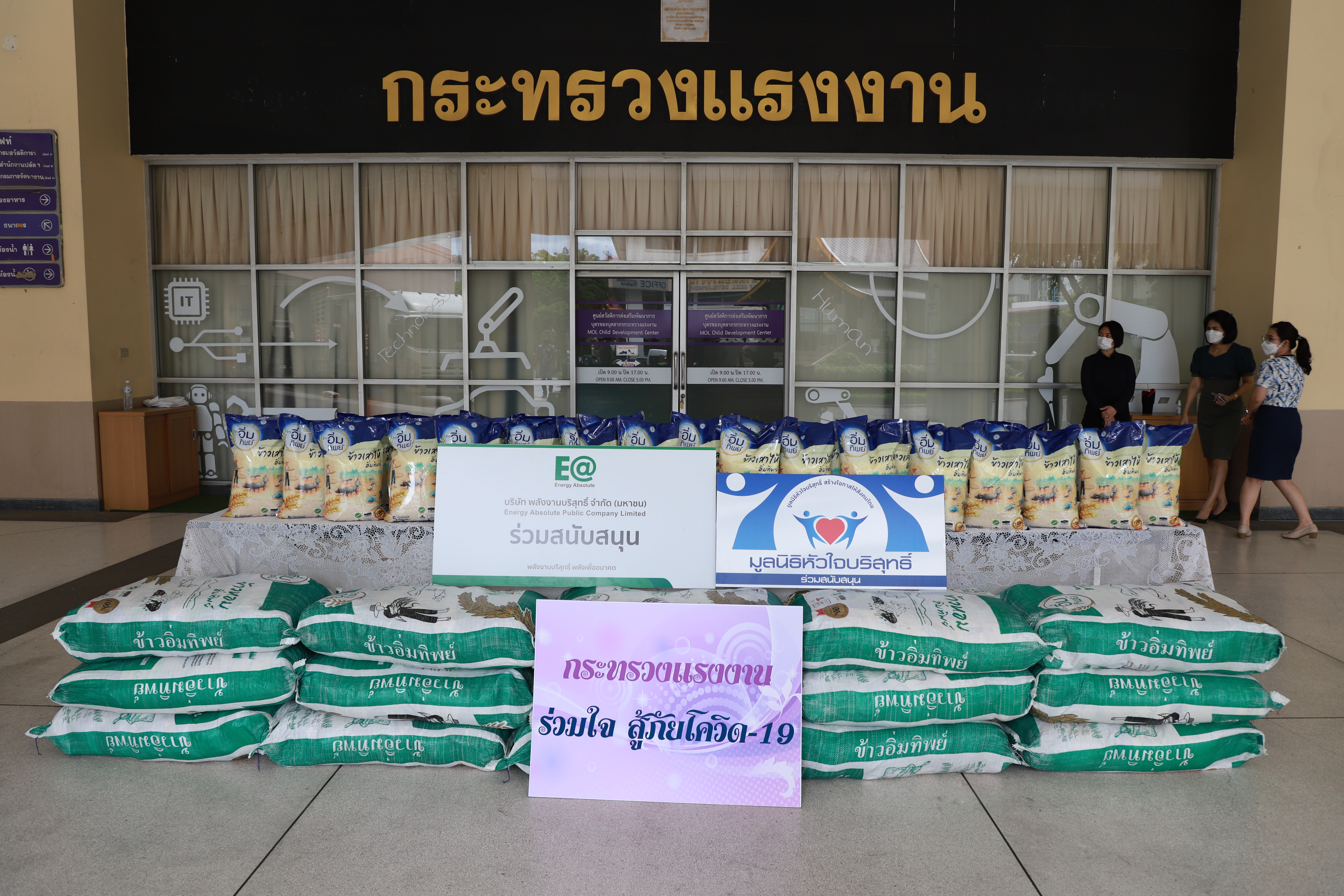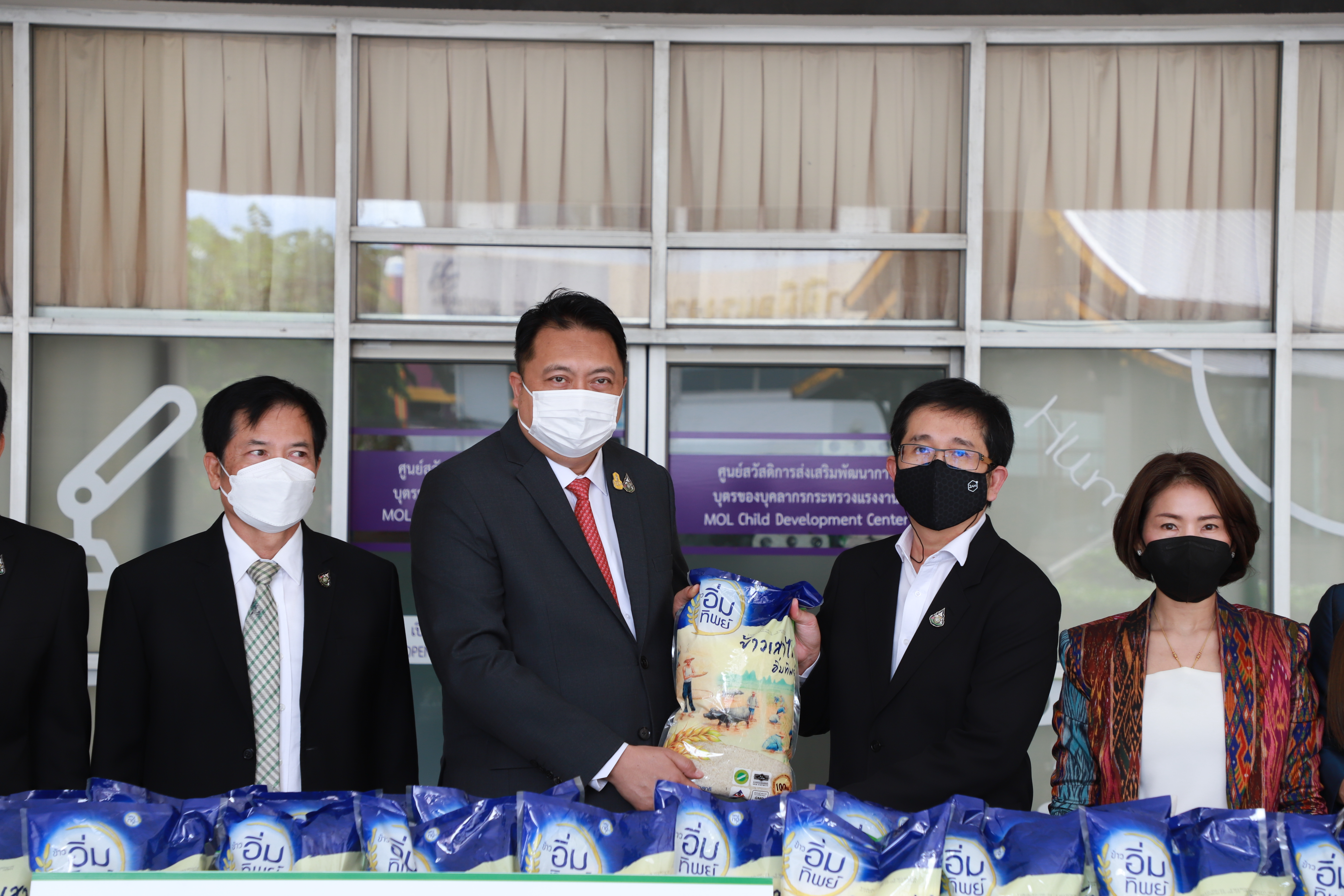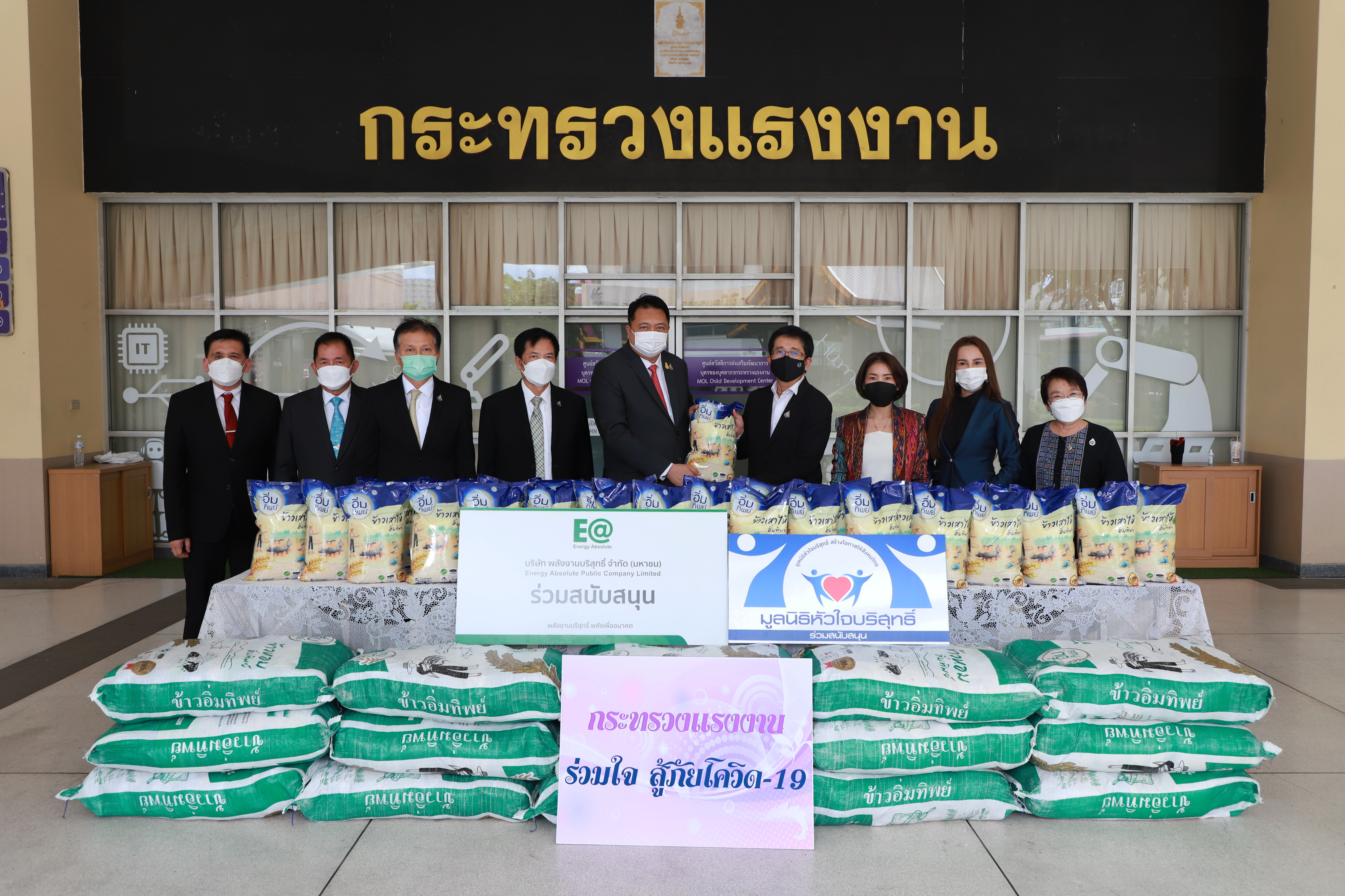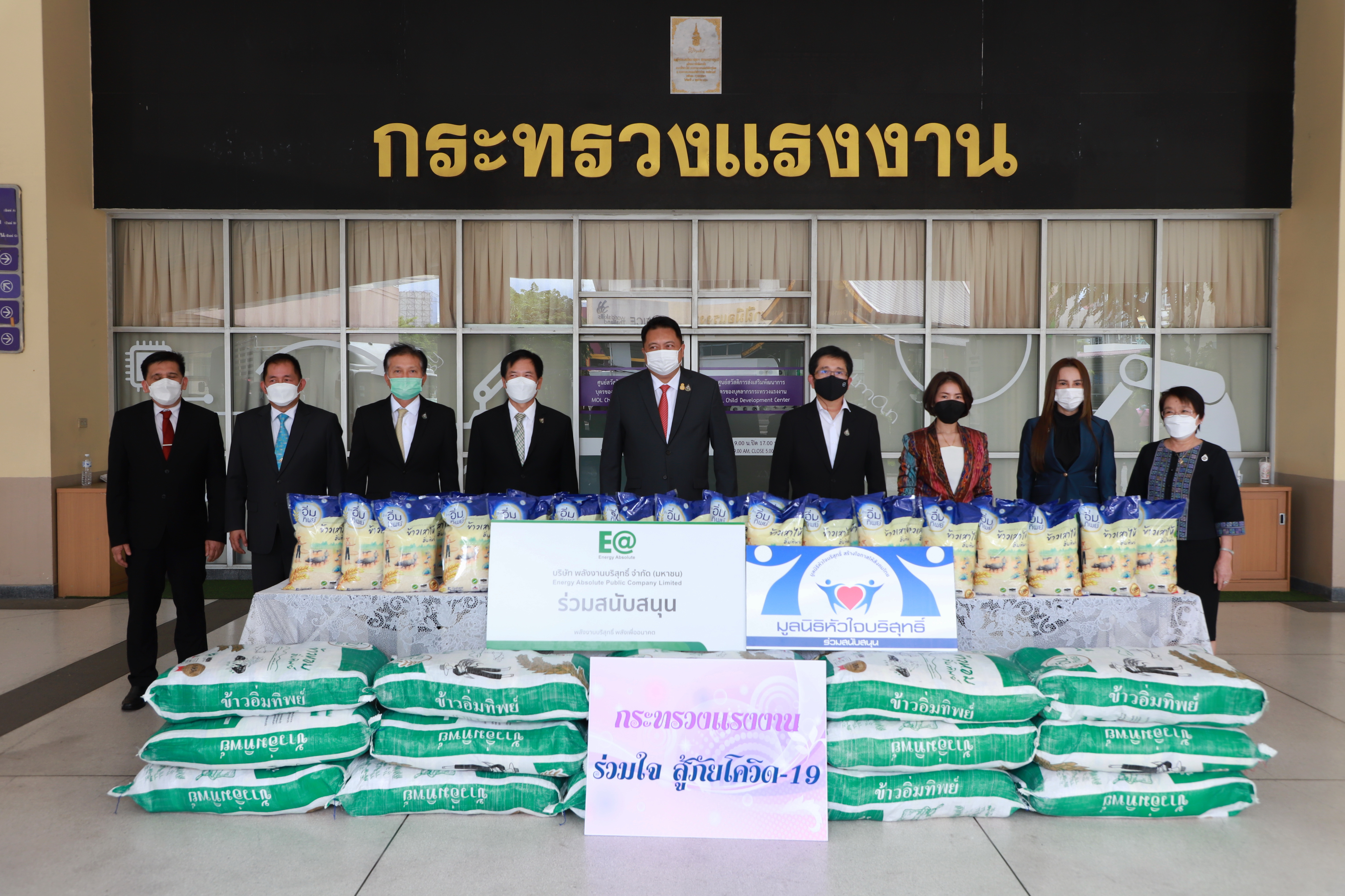 On August 11, 2021, at 13.30 hours, Labour Minister Mr. Suchart Chomklin received 3,000 bags of Immtip Rice from the Pure Heart Foundation, presented by Ms. Kulpornphat Wongmacharpinya, Chairperson of the Pure Heart Foundation, Khun Somphot Ahunai, Chief Executive Officer of Energy Absolute PCL, and Ms. Ananya Kreethapol, Honorary Advisor of the Pure Heart Foundation. The Labour Minister’s Secretariat Mr. Suthep Chitayawong, Pol.Maj.Gen. Nantachat Supamongkol from the Office of the Prime Minister’s Secretariat, performing duties for the Ministry of Labour, the Ministry of Labour’s Spokesperson (on politics) Mrs. Theanrat Nawamawat, Permanent Secretary of Labour Mr. Suthi Sukosol and the Ministry of Labour’s executives also joined the occasion at the foyer on the ground floor, Ministry of Labour.
