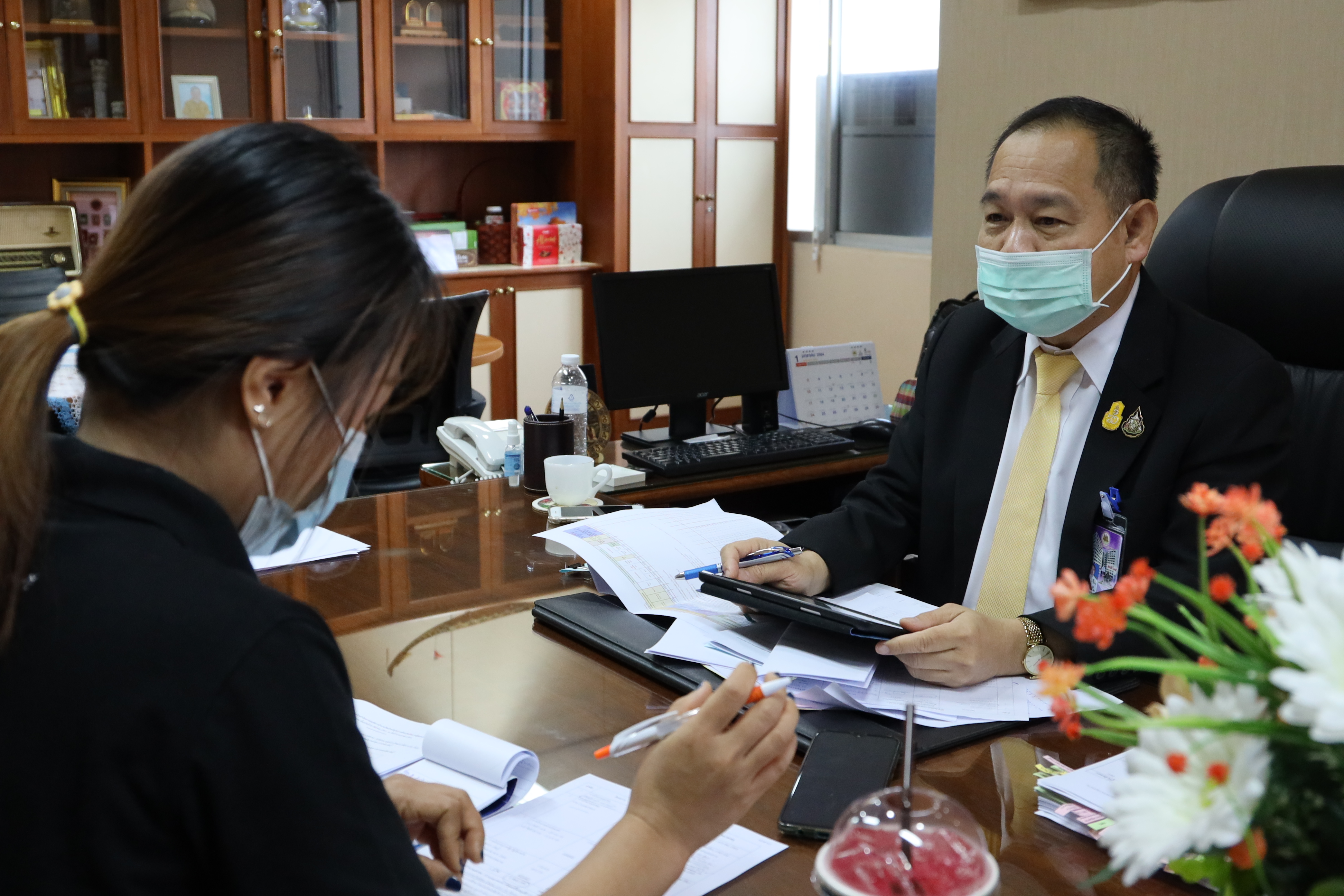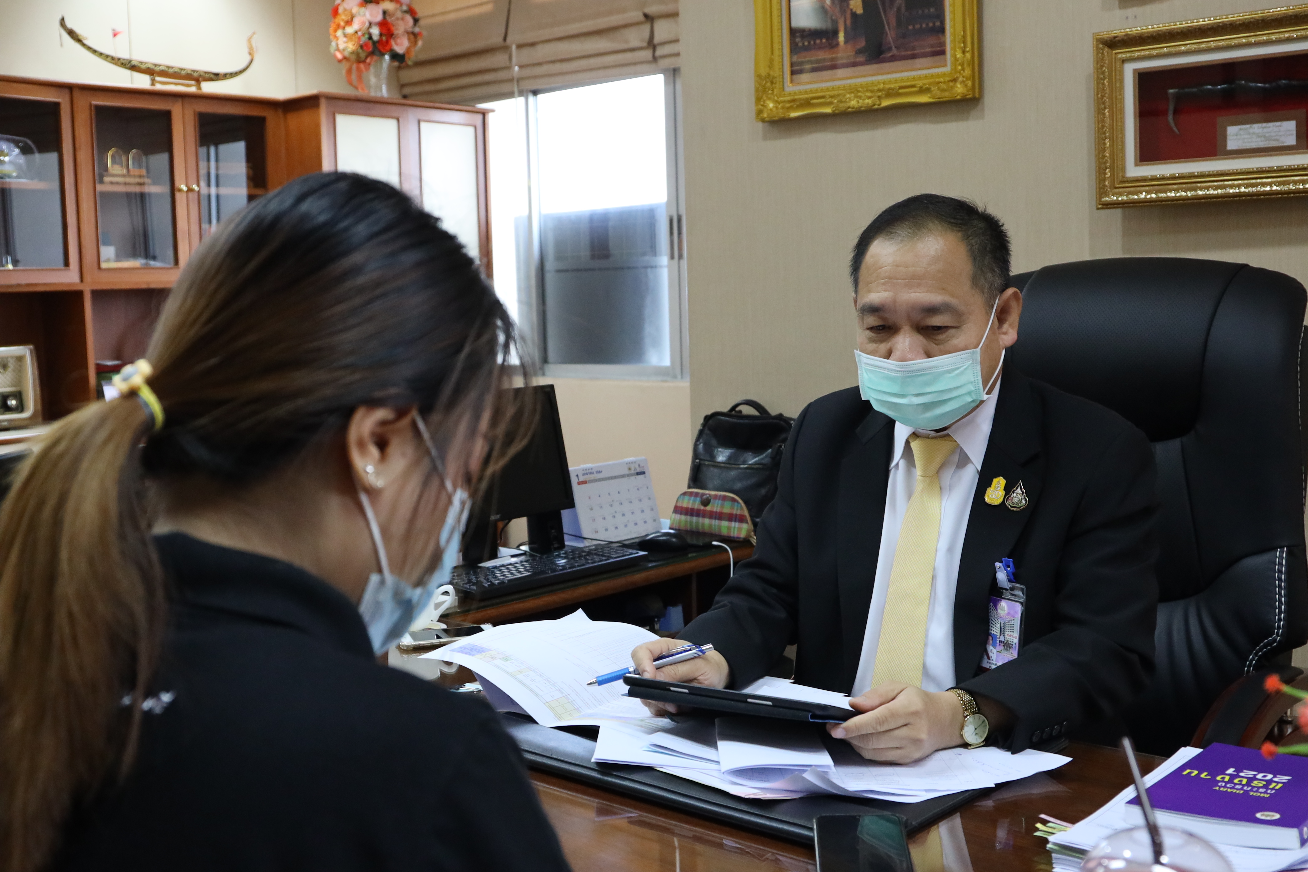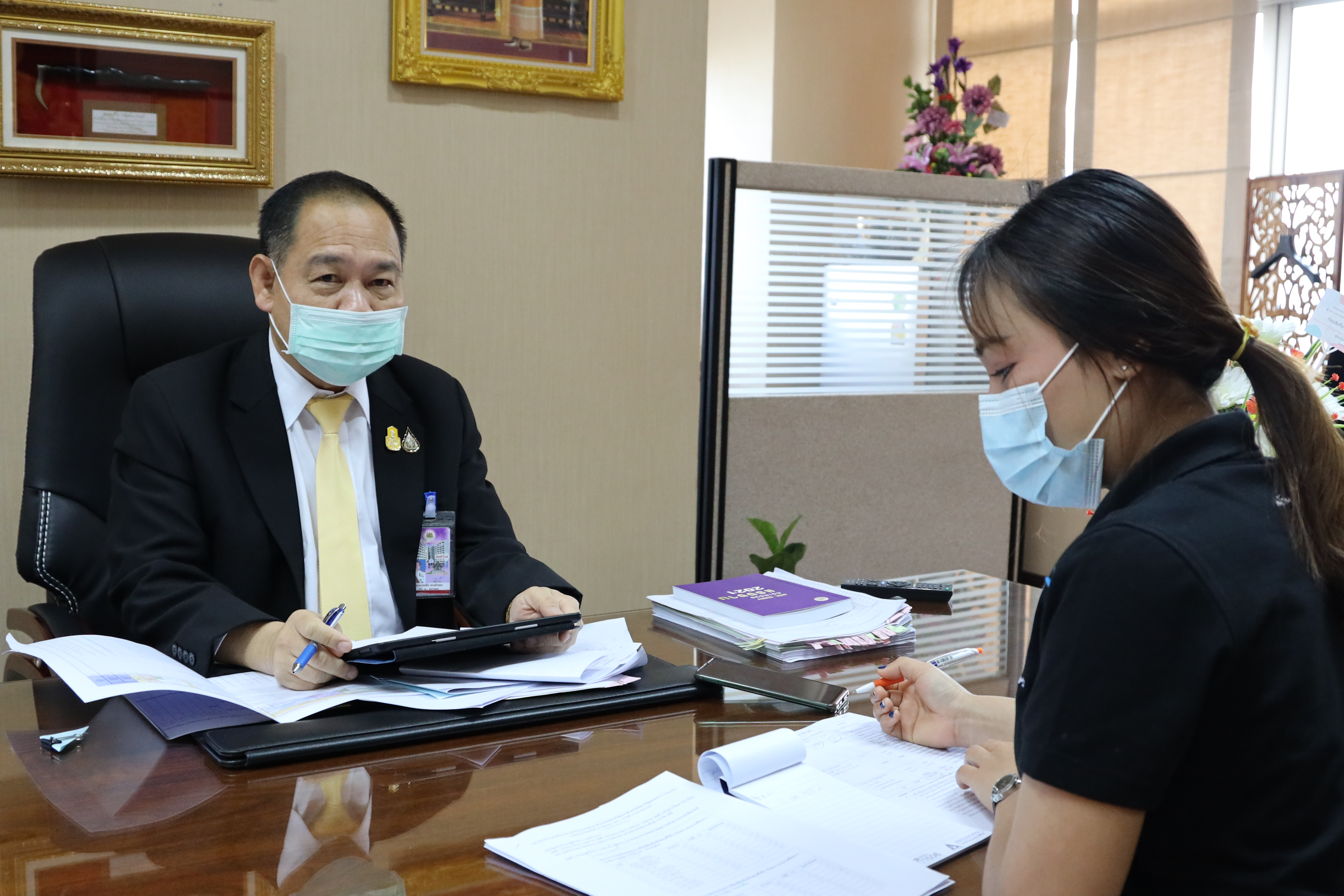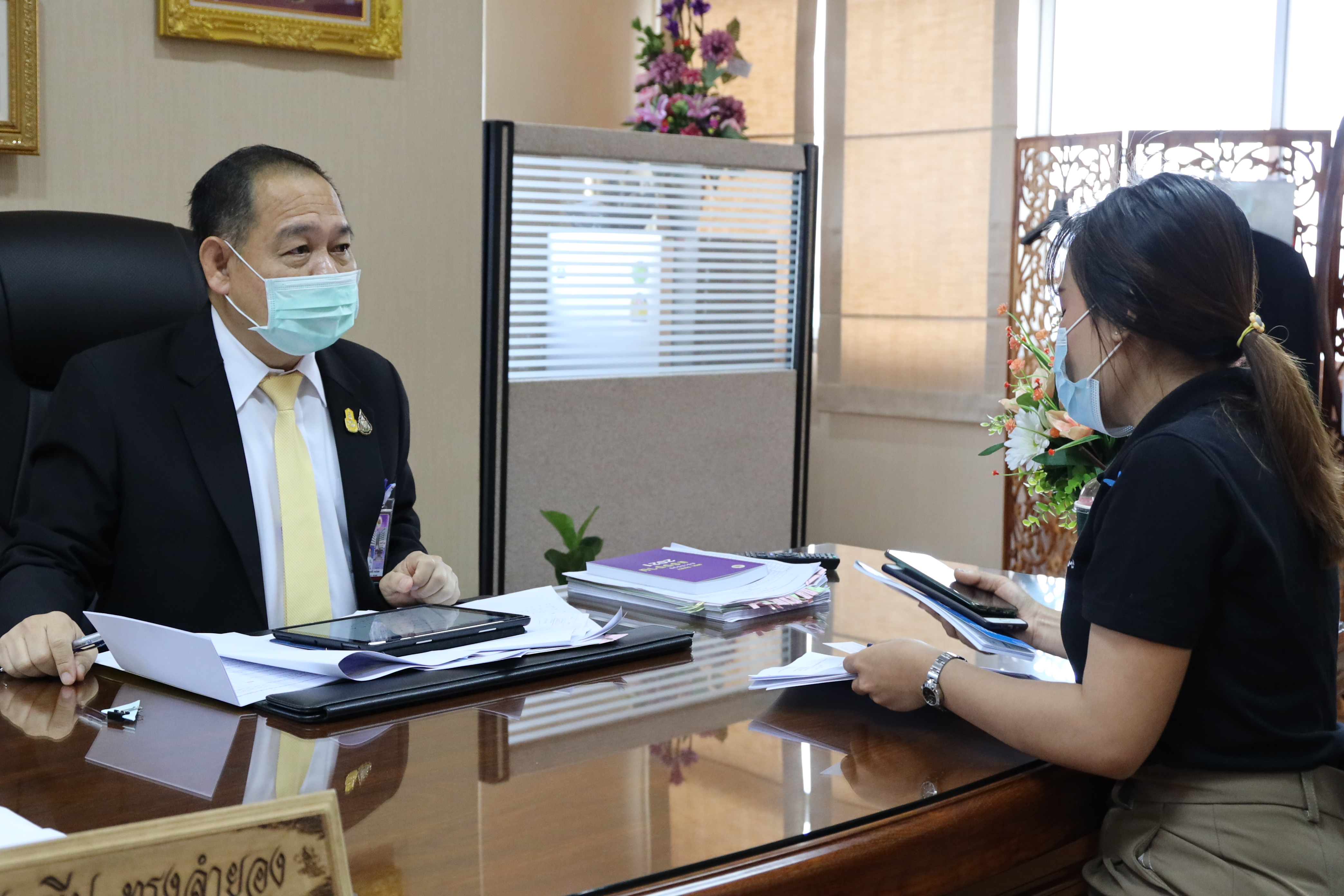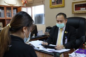 On January 20, 2021, at 13.30 hours, Labour Minister Mr. Suchart Chomklin assigned the Ministry of Labour’s Inspector-General Mr. Prateep Songlamyong as the Ministry of Labour’s spokesperson, gave an interview to Ms. Nittaya Khunsim, a reporter from the National Broadcasting Services of Thailand (NBT) regarding the budget for 2022, approved by the Cabinet. The government focuses on the development of a special master plan under the national strategy that needs to be accelerated to cope with and provide relief to those affected by Covid-19 and restore economic and social activities to normal as soon as possible. The meeting took place at the Ministry of Labour’s Inspector-General Office, 8th floor, Ministry of Labour.