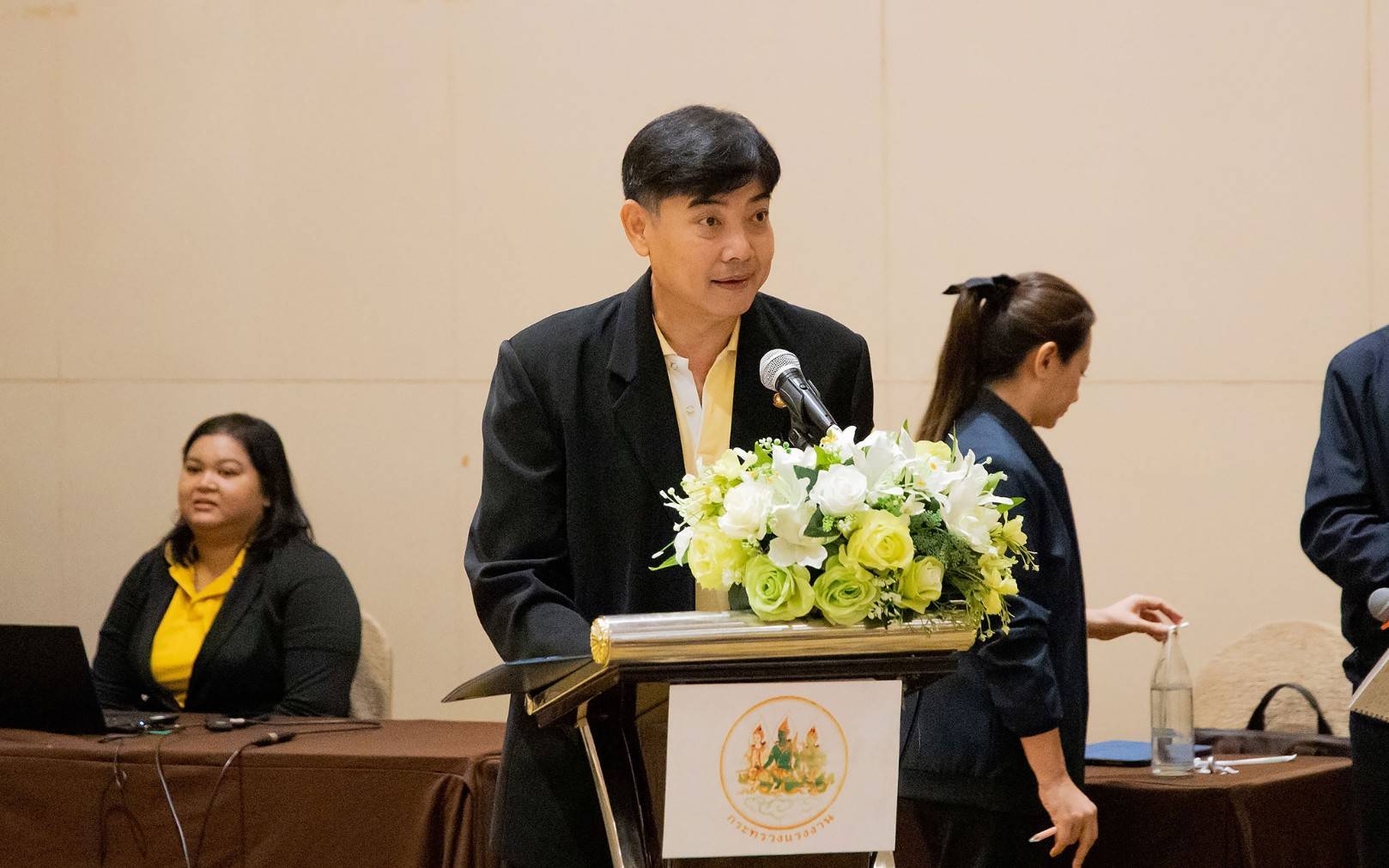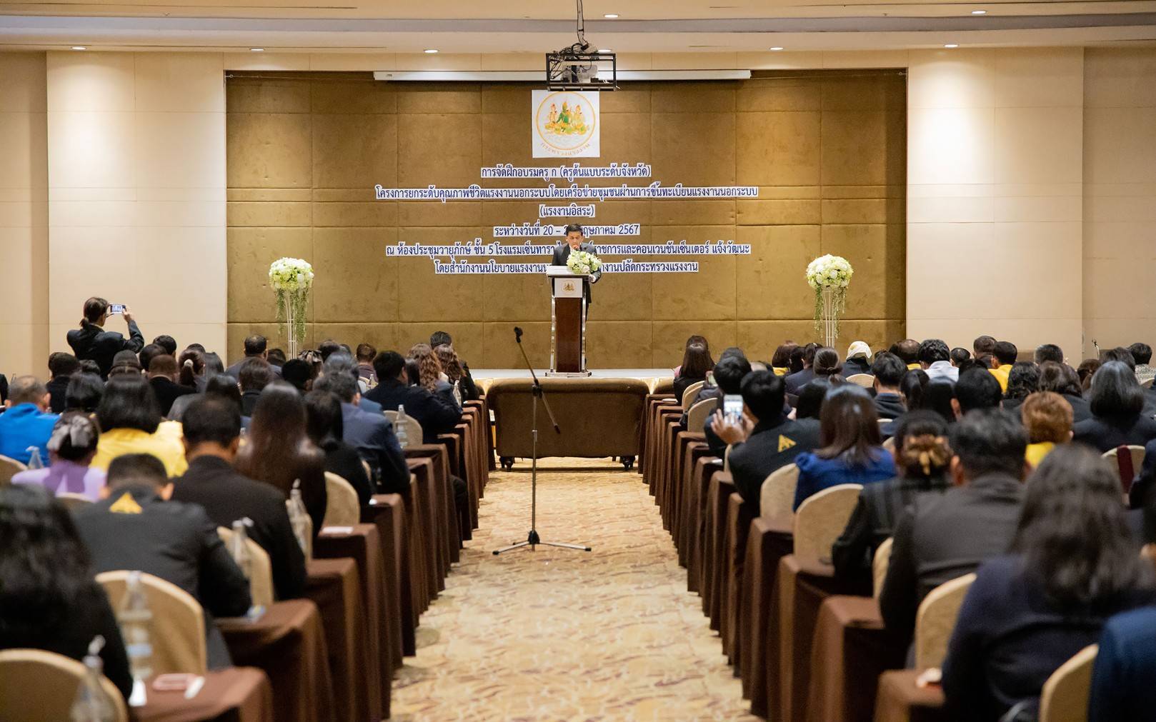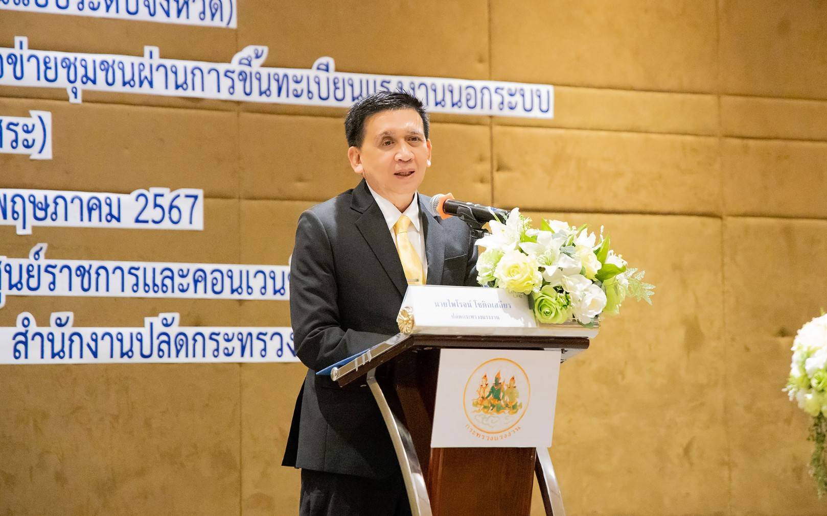 On May 20, 2024, at 09.00 hours, the Permanent Secretary of Labour, Mr. Pairoj Chotikasathien, chaired the opening ceremony of the training for Teacher A (a provincial model teacher) following the project to improve the quality of life of informal sector workers by community networks through registration of informal sector workers. The Deputy Permanent Secretary of Labour, Lieutenant Saroj Komkhai, the Academic Labour Advisor, Mrs. Napasorn Toongsooksai, the Ministry of Labour’s Inspector-Generals, Mr. Samat Pattamasukon, Mr. Sompot Kwangkaew, Ms. Bunyawee Khaipan, Mr. Santi Nantasuwan, and Assistants to the Permanent Secretary of Labour, Ms. Kornjirat Phongchansathorn and Mr. Sakdinart Sonthisakyotin joined in the honour of the opening ceremony at the Vayupak Room, 5th floor, Centara Life Hotel, Government Complex and Convention Center, Chaengwattana, Bangkok.