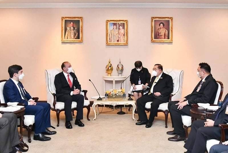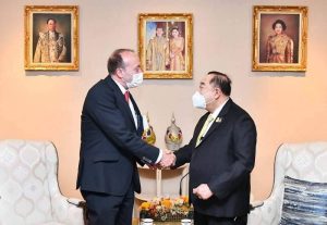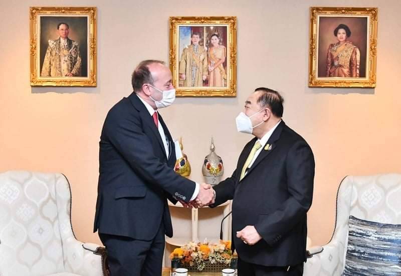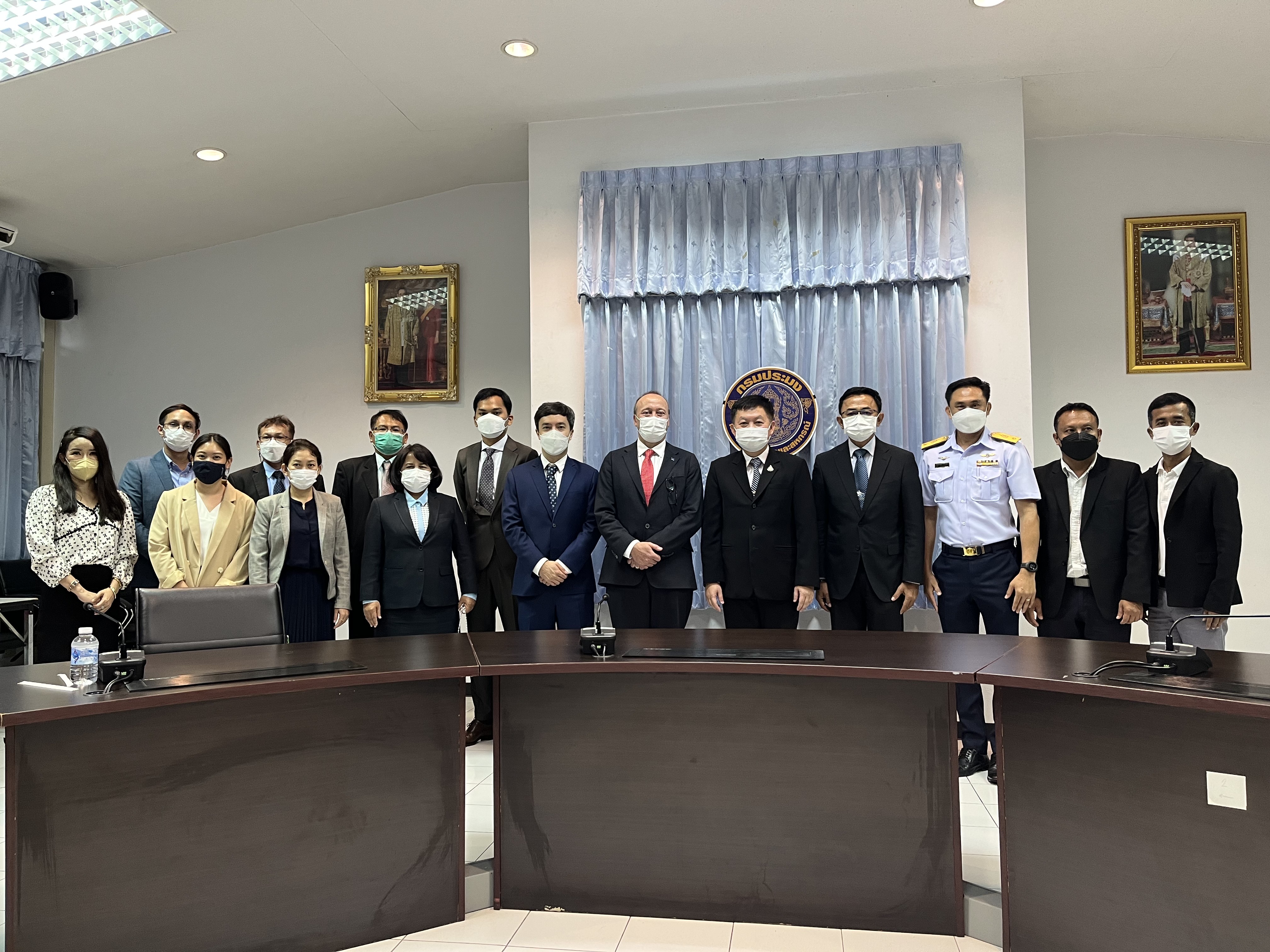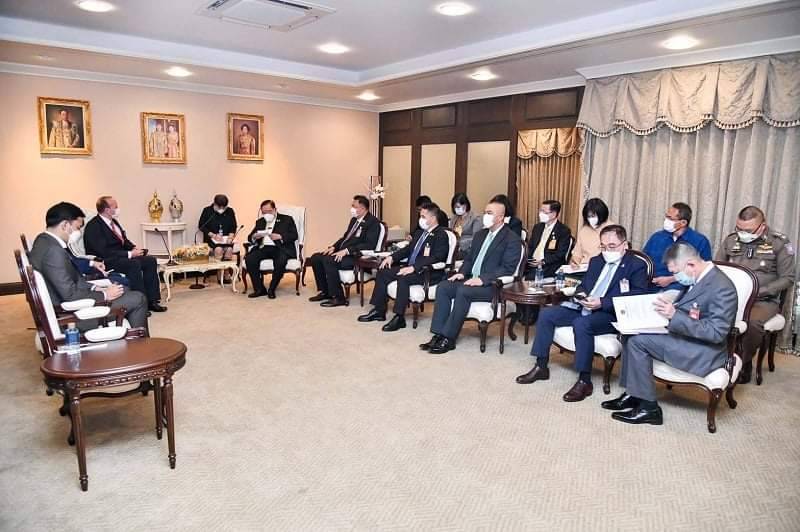 On May 18, 2022, at 09.30 hours, Labour Minister Mr. Suchart Chomklin and the Ministry of Labour’s executives and civil servants joined in the welcome for the courtesy call to Deputy Prime Minister General Prawit Wongsuwan by Mr. Steve Trent, Executive Director of the Environmental Justice Foundation. The meeting discussed labour and fisheries reforms in the Thai fishing industry. The Department of Employment assigned the Department of Employment’s Deputy Director-General Mr. Santi Nantasuwan, the Department of Labour Protection and Welfare assigned Deputy Director-General Ms. Kanchana Poolkaew, the Command Center of Prevention on Labour (CCPL), and the International Cooperation Bureau also joined the occasion at the Headquarters Building 1, Government Houses.