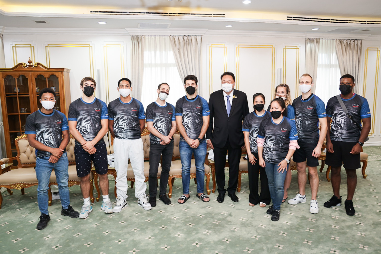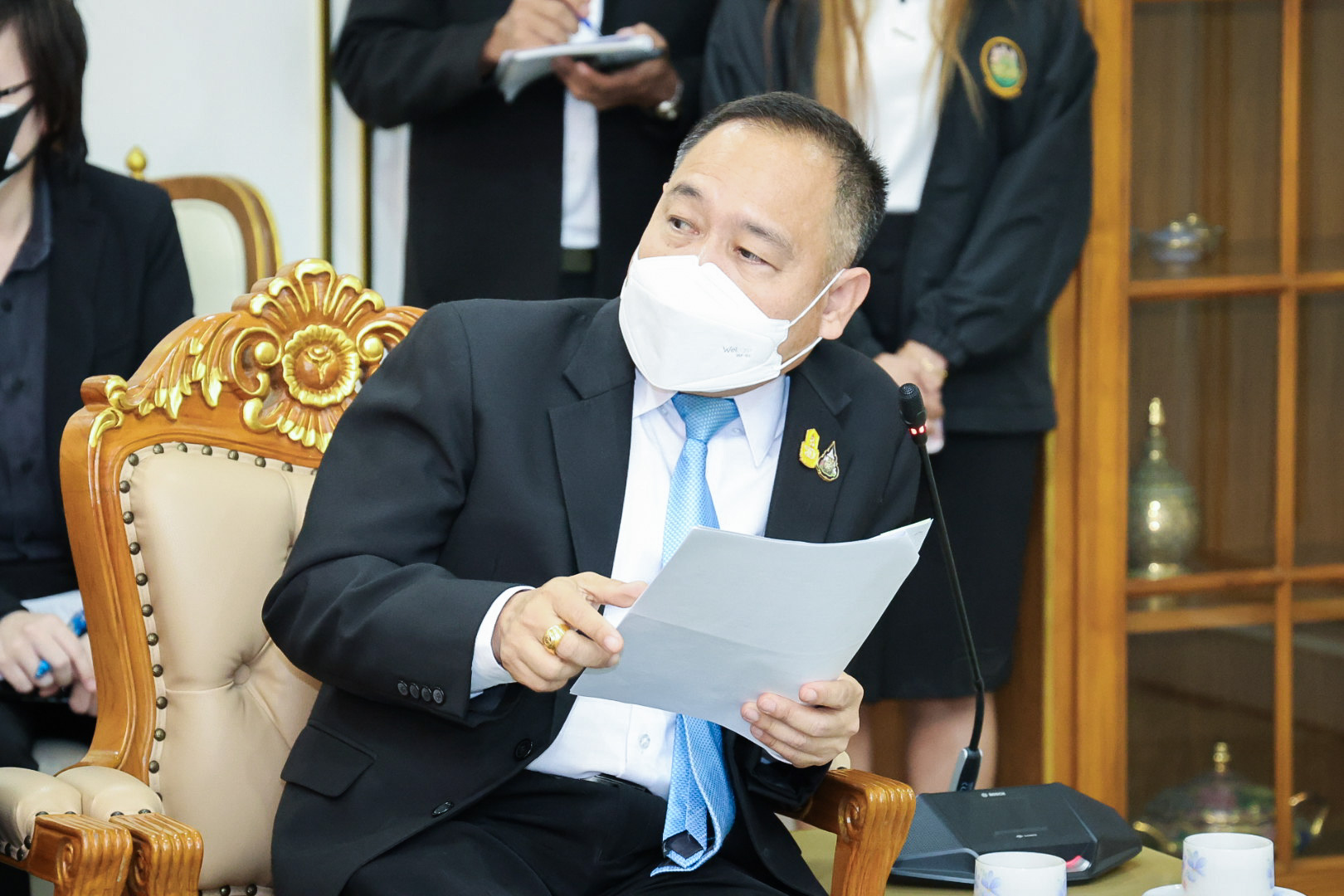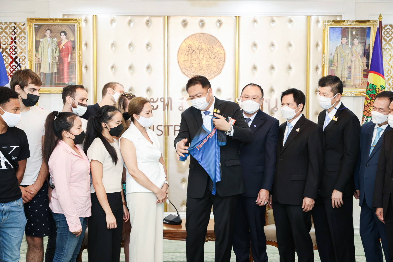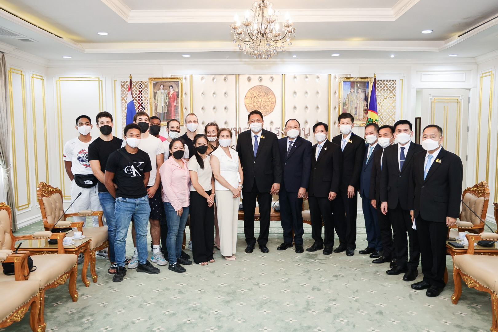 On August 10, 2022, Labour Minister Mr. Suchart Chomklin welcomed Ms. Mary Filippoux, owner of Chiang Mai Muay Thai Boxing Camp in Geneva, Switzerland, and daughters Ms. Supitcha and Ms. Supitchaya Filippoux, along with foreign boxers, on a courtesy call to meet the Labour Minister and discuss the support of the Muay Thai art exhibition and upgrading of skill standards in the field of Muay Thai trainers. The Ministry of Labour’s senior executives also joined the occasion at the Chatumongkol Room, 6th floor, Ministry of Labour.