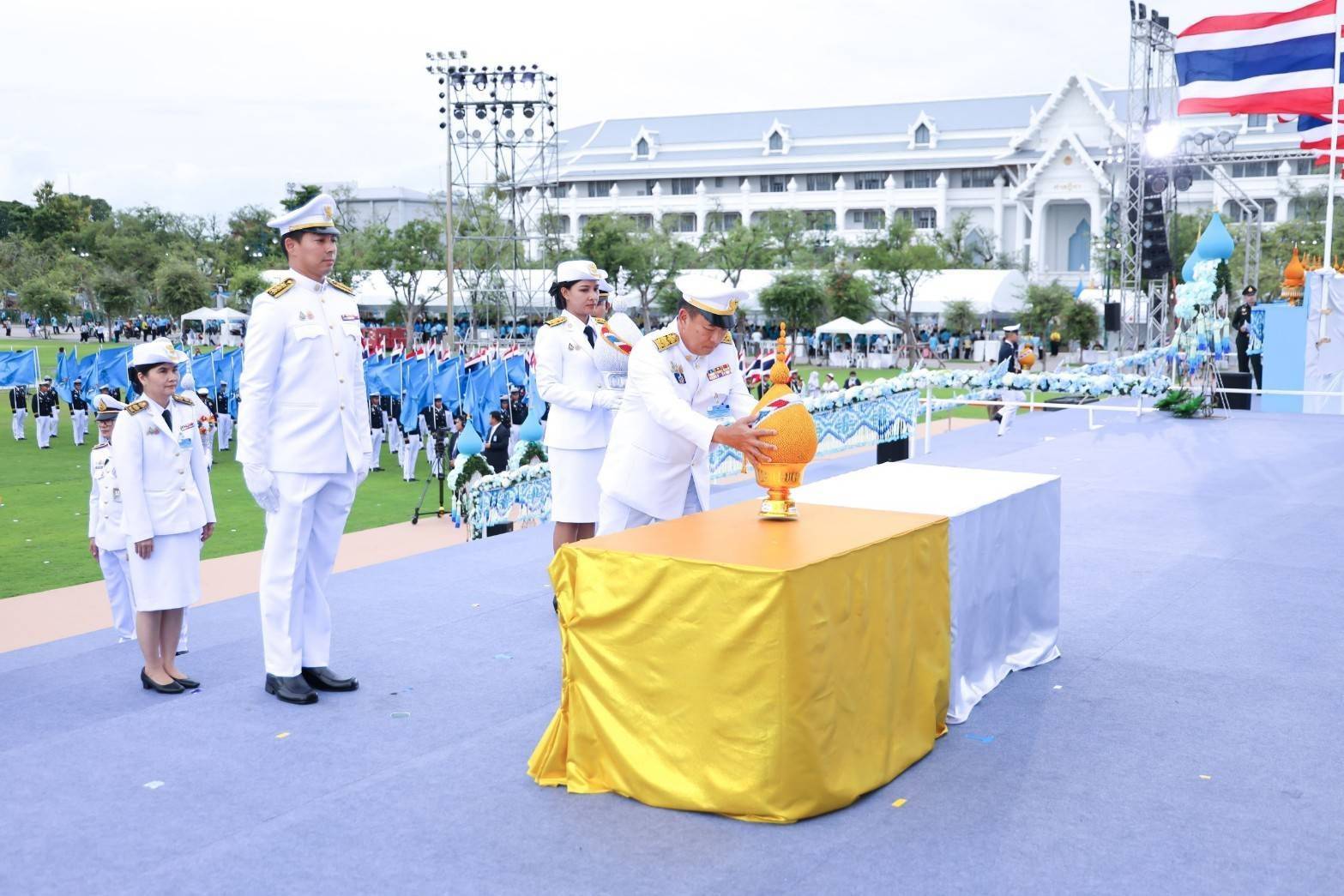 On August 13, 2024, at 07.00 hours, the Permanent Secretary of Labour, Mr. Pairoj Chotikasathien, assigned the Assistant to the Permanent Secretary of Labour, Mr. Sakdinart Sonthisakyotin as a representative in the ceremony to present royal offerings and flowers as blessings on the occasion of Her Majesty Queen Sirikit the Queen Mother’s birthday on August 12, 2024, to express loyalty and gratitude, The occasion took place at the Royal Plaza, Dusit Palace.