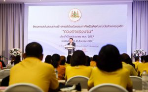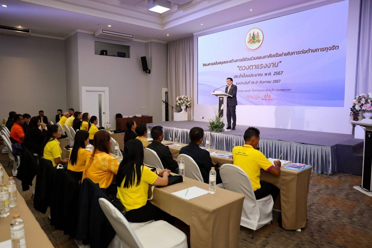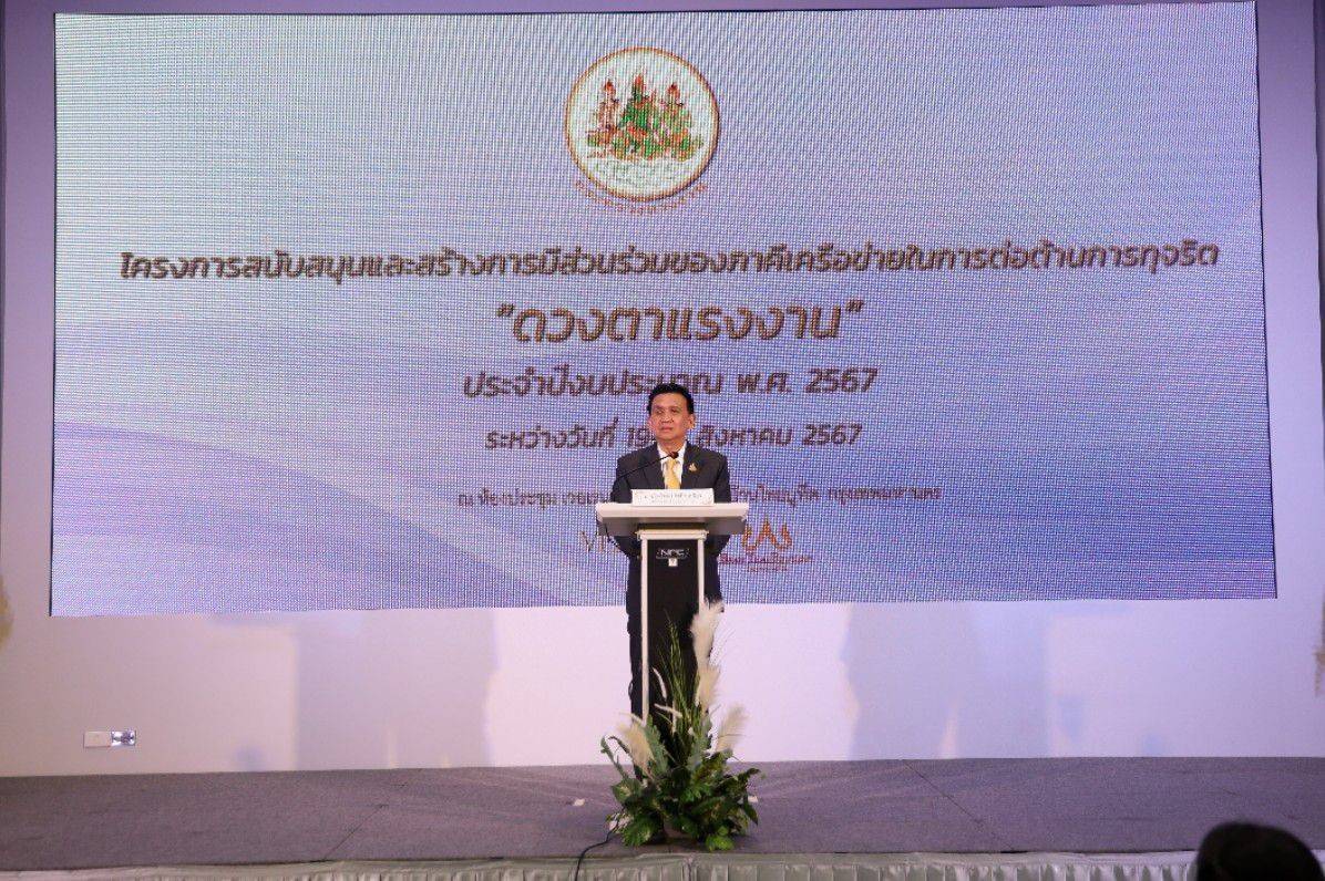 On August 19, 2024, at 09.00 hours, the Permanent Secretary of Labour, Mr. Pairoj Chotikasathien, chaired the opening ceremony of the project to support and create participation of network partners in fighting corruption, “Labour Eyes” for the 2024 fiscal year. He also led the declaration of intent against corruption, which took place at the Varanda Room, 4th floor, Baan Thai Boutique Hotel, Bangkok. The Ministry of Labour’s Inspector-General, Mr. Santi Nantasuwan, Academic Labour Advisor, Mrs. Napasorn Toongsooksai, the Assistant to the Permanent Secretary of Labour, Ms. Kornjirat Phongchansathorn, the Assistant to the Permanent Secretary of Labour, Mr. Sakdinart Sonthisakyotin, civil servants, provincial labour officer, labour volunteers and civil society networks in the northeastern region from 20 provinces joined the occasion, totaling 80 people, who are trainees and officers of the Ministry of Labour’s Anti-Corruption Operations Center, joined in giving a welcome.