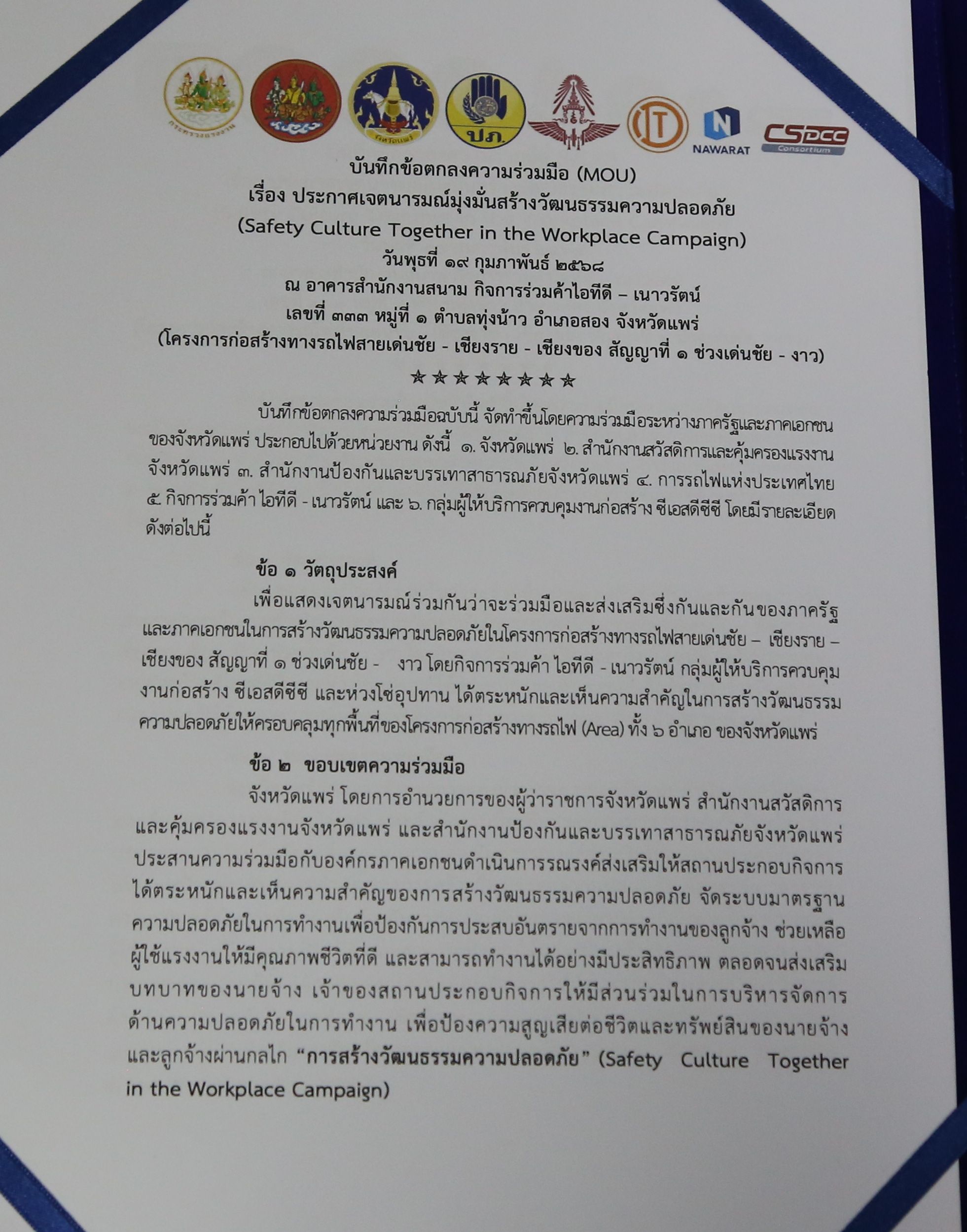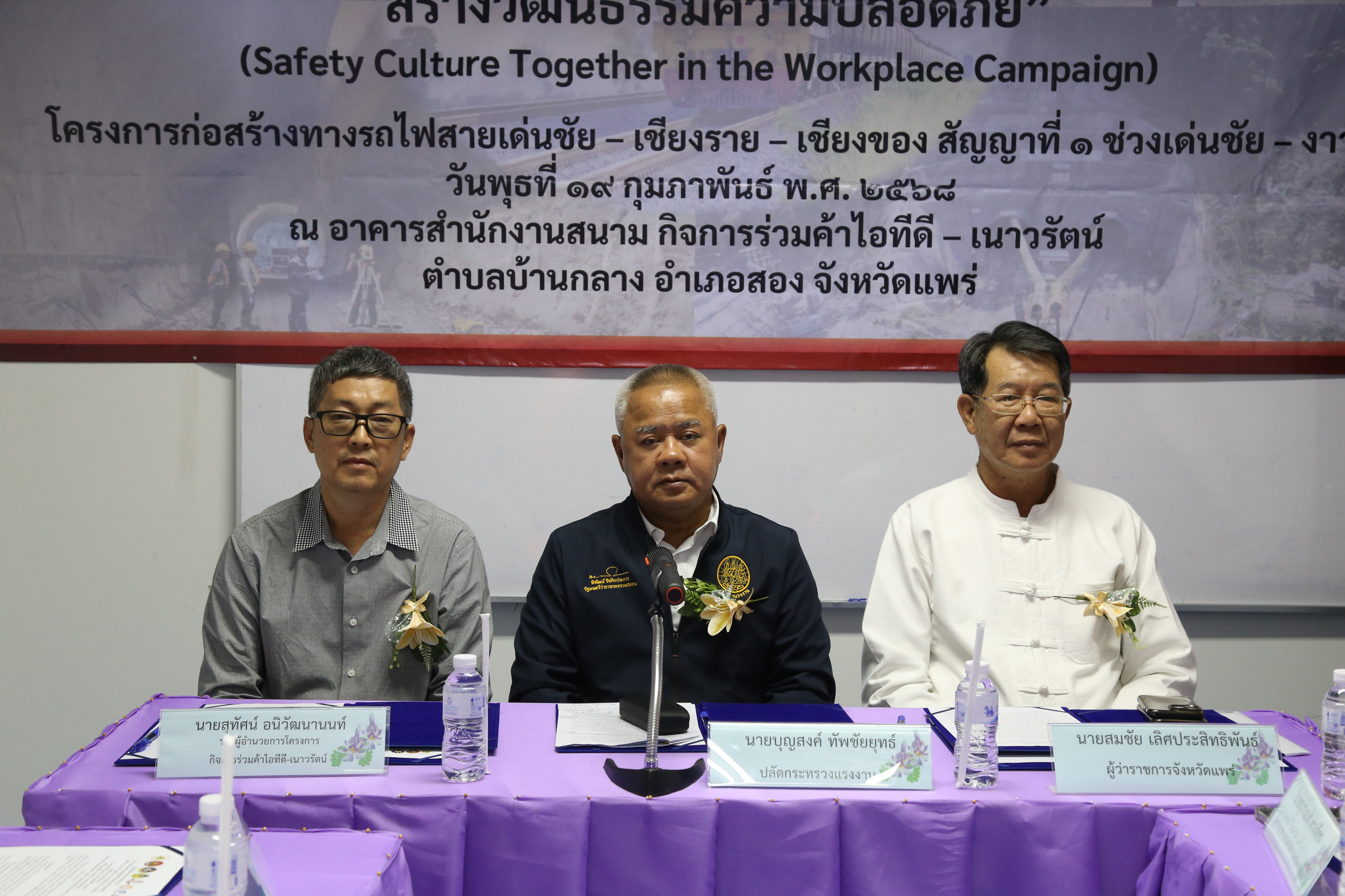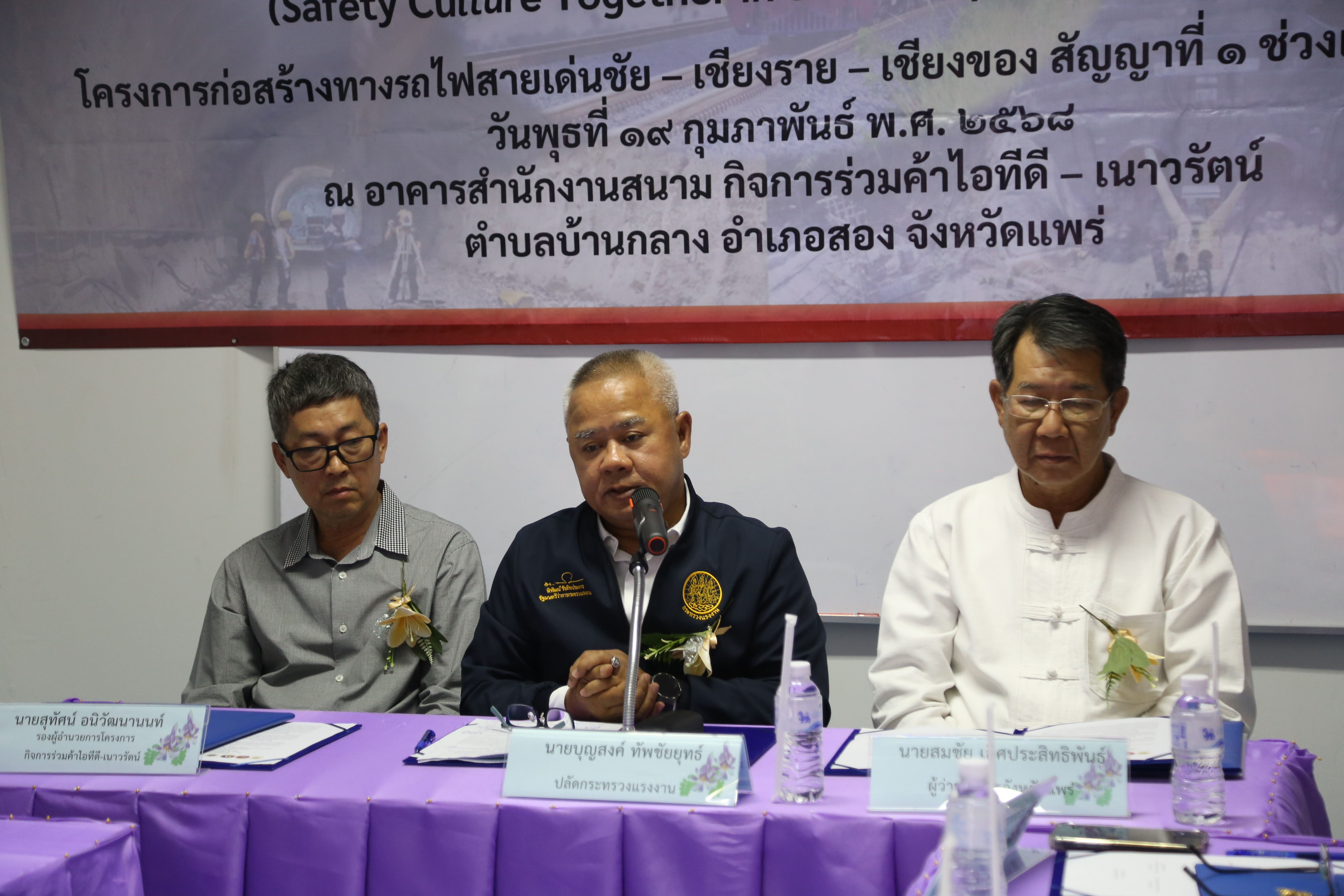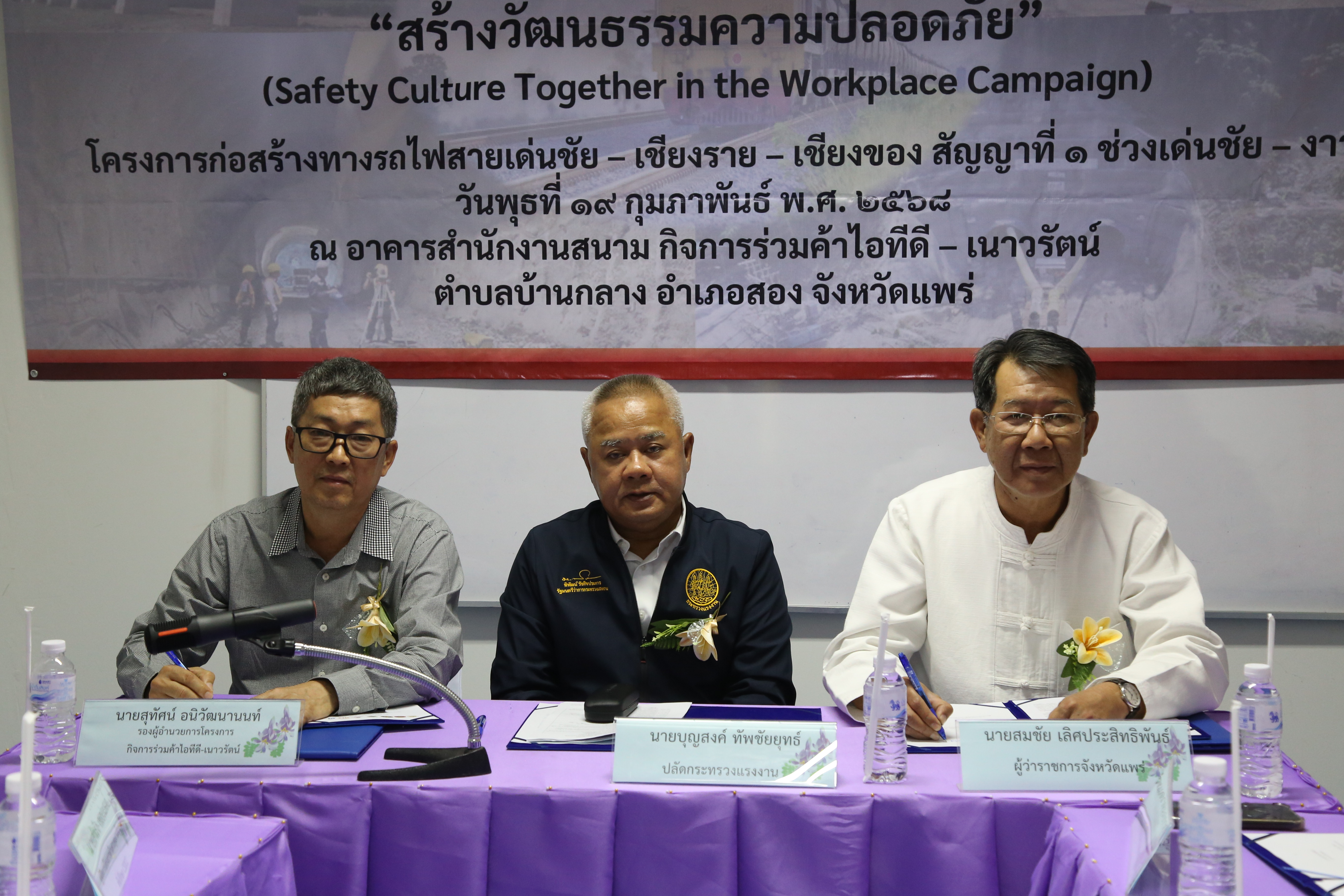 On February 19, 2025, Mr. Boonsong Thapchaiyut, the Permanent Secretary of Labour, chaired the opening ceremony of the campaign to boost participation for worker families, drive policies, and create a safety culture. He also witnessed the signing ceremony of the Memorandum of Understanding (MOU) to declare the “Safety Culture Together in the Workplace Campaign” the (Den Chai – Chiang Rai – Chiang Khong Railway Construction Project, Contract 1, Den Chai – Ngao Section). Mr. Somchai Lertprasitphan, Governor of Phrae Province, executives of the Ministry of Labour, heads of government agencies under the Ministry of Labour in Phrae Province, and private sector executives joined the welcome at the ITD – Nawarat Joint Venture Field Office Building, Thung Nao Subdistrict, Song District, Phrae Province.