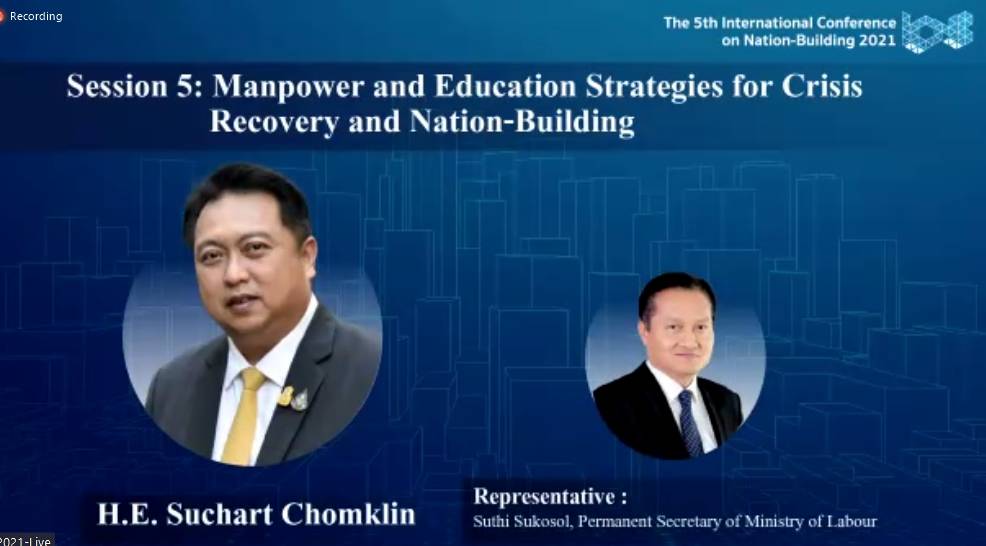 On September 8, 2021, at 16.45 hours, Permanent Secretary of Labour Mr. Suthi Sukosol represented the Labour Minister, participating in the discussion at the 5th International Conference for Building a Nation, which took place in an online meeting format. Over 1,000 people attended, including important figures from the public and private sectors and scholars in various fields from many countries. Participants exchanged knowledge and experience in important issues related to nation-building in various fields so that social stakeholders and national policymakers are aware of important issues and can work together to drive solutions together. The topic of this discussion was strategies and guidelines for recovering from the COVID-19 crisis. The meeting is scheduled between September 8 to 9, 2021, at King Mongkut’s Institute of Technology Ladkrabang.