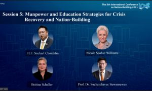 The Permanent Secretary of Labour participated in a panel discussion on Manpower Strategy and Education for Crisis Restoration and Nation Building. Ms. Nicole Scoble-Williams, Global Leader of the Future of Work from Deloitte, Japan, Ms. Bettina Schaller, President of the World Employment Federation, and Professor Dr. Suchachwee Suwansawat, President of King Mongkut’s Institute of Technology Ladkrabang, also joined the online discussion.