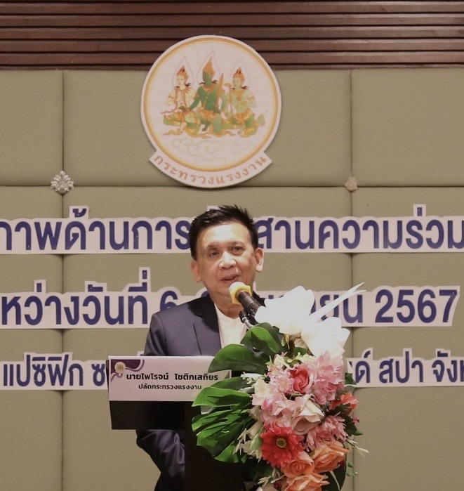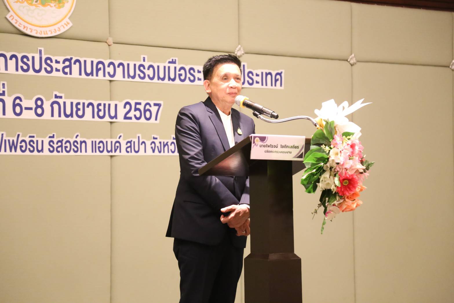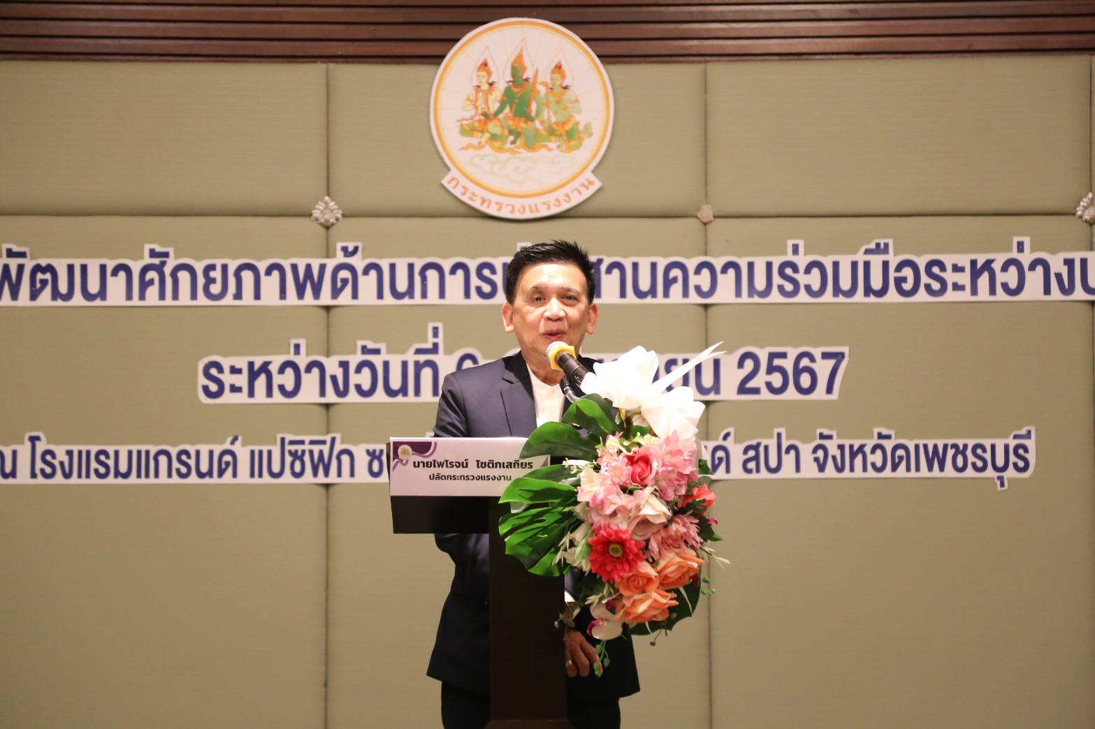 On September 8, 2024, at 09.30 hours, the Permanent Secretary of Labour, Mr. Pairoj Chotikasathien, chaired the opening ceremony of the project to develop potential in international cooperation. The Ministry of Labour’s Inspector-Generals, Mr. Samat Pattamasukon, Ms. Bunyawee Khaipan, Mrs. Marasri Jairangsi, Mr. Santi Nantasuwan, the Assistant to the Permanent Secretary of Labour, Mr. Sakdinart Sonthisakyotin, along with the Ministry of Labour’s executives, joined the occasion. The Director of the International Cooperation Bureau, Ms. Kaewjai Satchavet, reported on the objectives of the event at the Grand Pacific Sovereign Resort and Spa, Cha-am District, Phetchaburi Province.