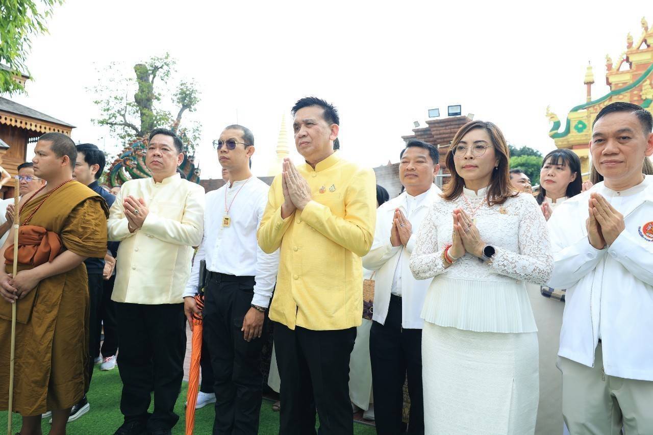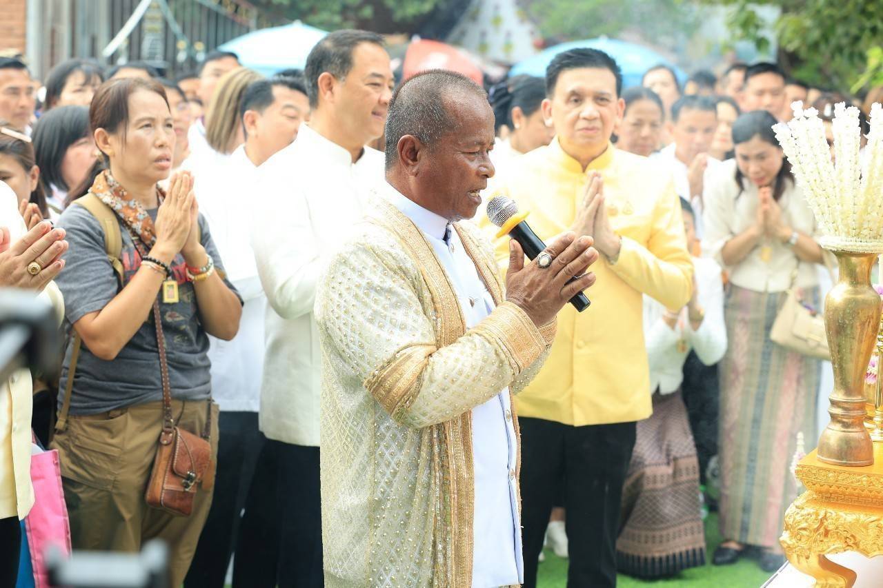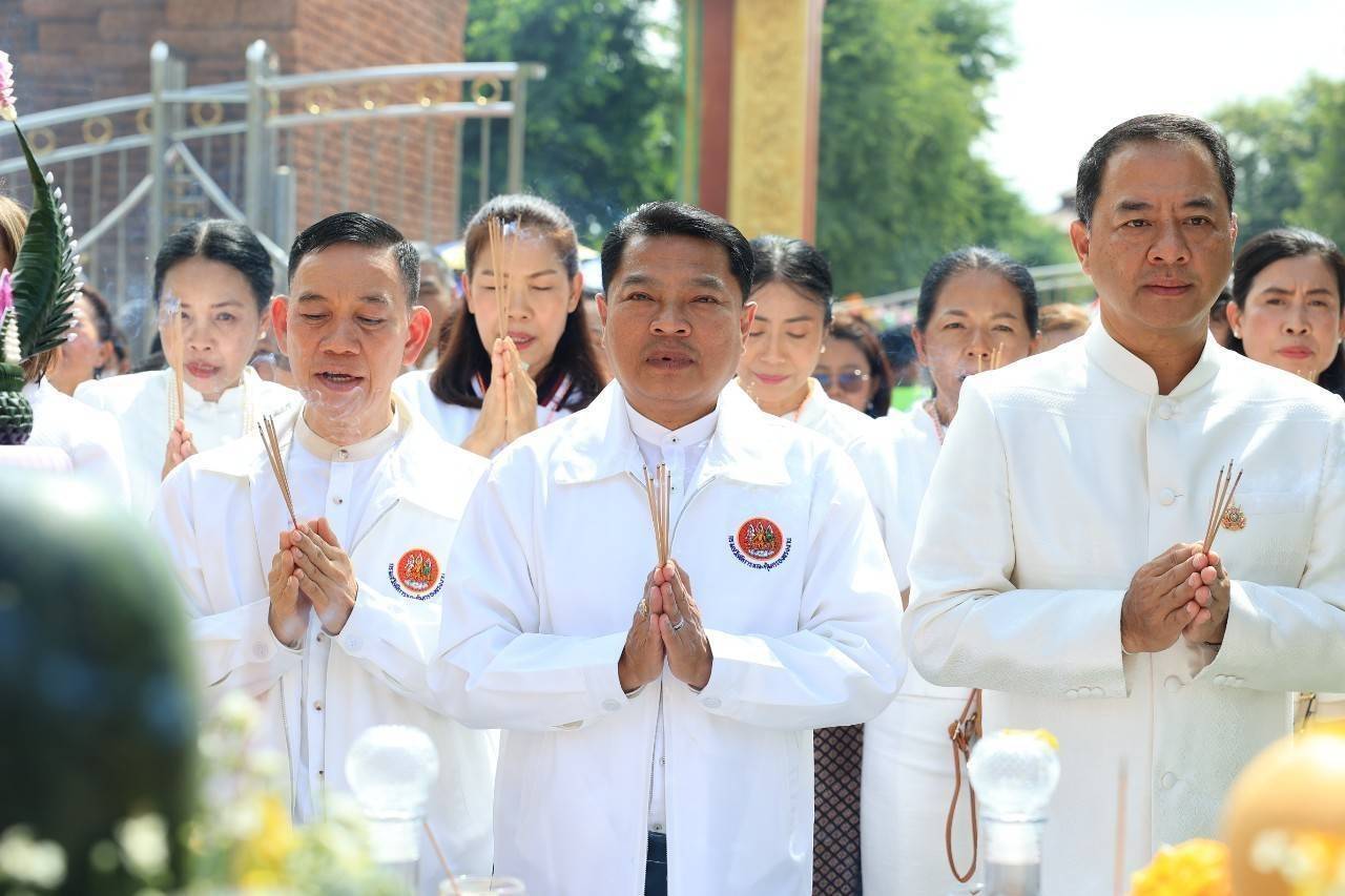 On September 7, 2024, at 09.09 hours, the Labour Minister, Mr. Phiphat Ratchakitprakarn, assigned the Permanent Secretary of Labour, Mr. Pairoj Chotikasathien, to preside over the laity in the grand Buddha consecration ceremony of the Luang Pu Thuat Treading on the Seawater, Ministry of Labour 2024. The Ministry of Labour’s Spokesperson, Mr. Phumiphat Mueanchan, the Ministry of Labour’s Inspector-General, Mr. Samat Pattamasukon and Mr. Somphon Kwangkaew, the Ministry of Labour’s executives, heads of government agencies under the Ministry of Labour in Maha Sarakham Province and local Buddhists joined the ceremony at the golden teakwood chapel of Wat Phutthawanaram (Wat Pa Wang Nam Yen), Koeng Subdistrict, Mueang Maha Sarakham District, Maha Sarakham Province.