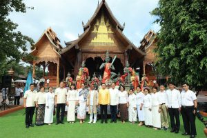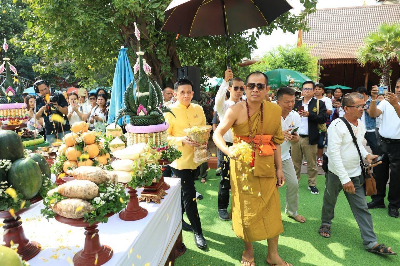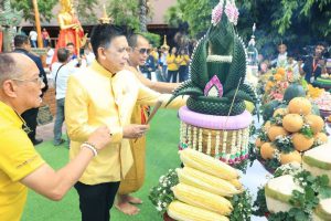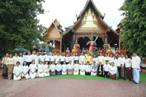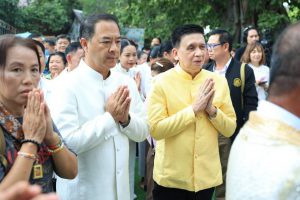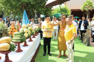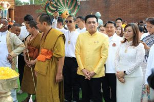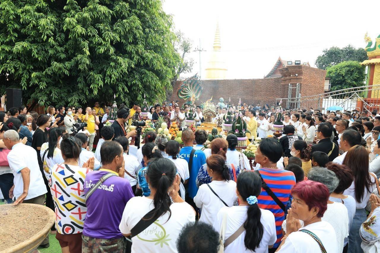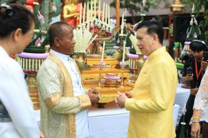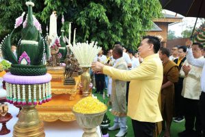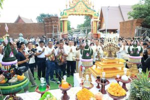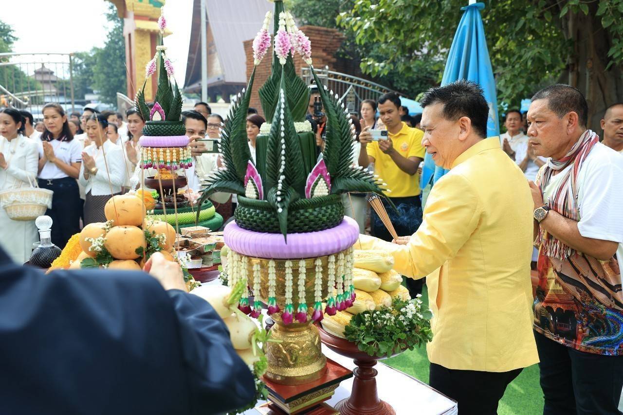 On September 7, 2024, at 09.09 hours, the Labour Minister, Mr. Phiphat Ratchakitprakarn, assigned the Permanent Secretary of Labour, Mr. Pairoj Chotikasathien, to preside over the laity in the grand Buddha consecration ceremony of the Luang Pu Thuat Treading on the Seawater, Ministry of Labour 2024. The Ministry of Labour’s Spokesperson, Mr. Phumiphat Mueanchan, the Ministry of Labour’s Inspector-General, Mr. Samat Pattamasukon and Mr. Somphon Kwangkaew, the Ministry of Labour’s executives, heads of government agencies under the Ministry of Labour in Maha Sarakham Province and local Buddhists joined the ceremony at the golden teakwood chapel of Wat Phutthawanaram (Wat Pa Wang Nam Yen), Koeng Subdistrict, Mueang Maha Sarakham District, Maha Sarakham Province.