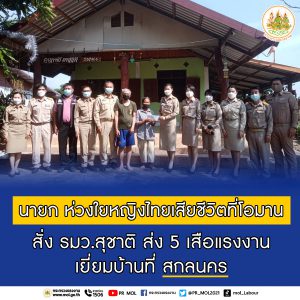 Mr. Suchart also assigned the Labour Office in Abu Dhabi, United Arab Emirates, which is responsible for the care of workers in Oman, to coordinate with the Ministry of Foreign Affairs to facilitate funeral arrangements following the wishes of the relatives. Today, he assigned agencies under the Ministry of Labour in Sakon Nakhon Province, which is the domicile of the deceased Thai woman, to visit the area with the District Chief, the Local Government Organization, and the Provincial Social Development and Human Security Office, paying a visit to the family to encourage them and to provide information on procedures for assistance. They also explained the benefit entitlement of Thai workers traveling to work abroad from the Ministry of Labour. They informed the process of handling the bodies under the Ministry of Foreign Affairs’ supervision.