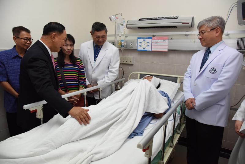 On December 28, 2018, at 10.00 hours, Labour Minister H.E. Police General Adul Sangsingkeo, Permanent Secretary of Labour Mr. Jarin Chakkaphark and the ministry’s executives met with an emergency insured patient, Mr. Amorn Thachai, 27 years old, a Social Security staff at the Bangkok Social Security Office Area 8, who suffered a car crash while working at the MOL Counter Service in Thanya Park Srinakarin. Mr. Amorn is currently undergoing treatment at Vibharam Pattanakarn Hospital, Suan Luang, Bangkok. The insured patient will receive medical treatment benefits from 3 funds (the Universal Health Coverage Fund, Social Security Fund and the Government Welfare Fund). The benefits were divided into: 1. UCEP rights in case of emergency crisis; 2. Car insurance act from the contestant; 3. Right to the compensation fund for medical expenses not exceeding 2 million Baht and 70 percent of monthly salary (according to the medical certificate as stated to stop for treatment).
