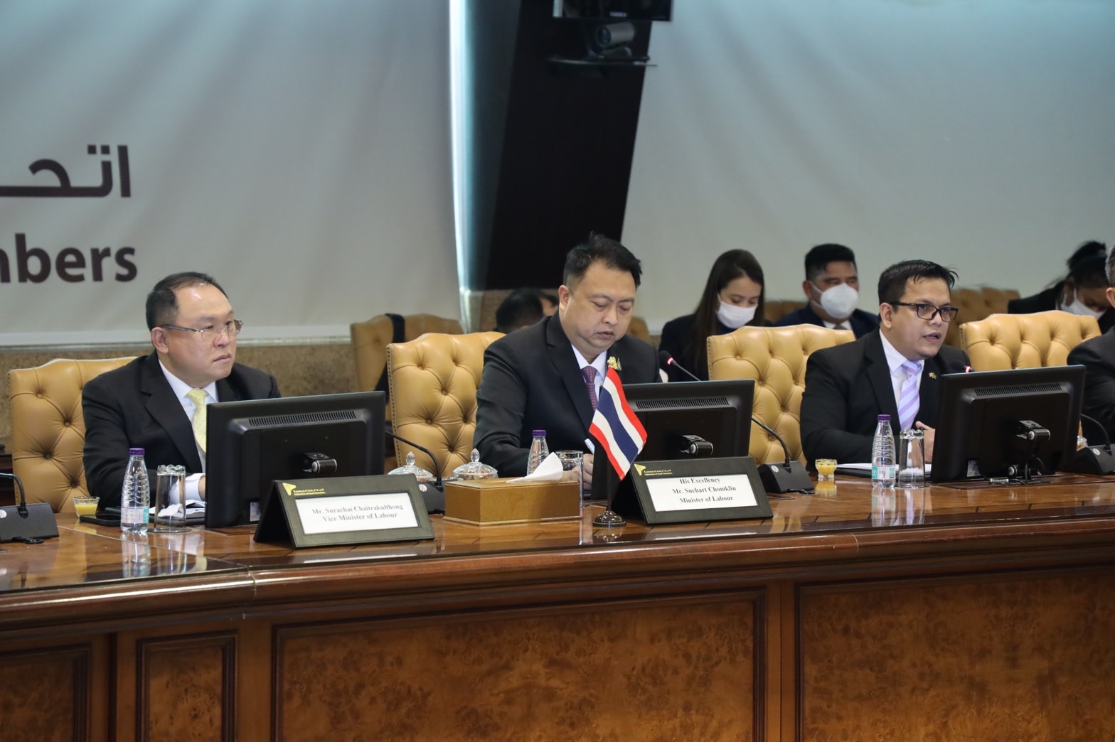 On March 28, 2022, Labour Minister Mr. Suchart Chomklin, Assistant to the Labour Minister Mr. Surachai Chaitrakulthong, the Ministry of Labour’s Spokesperson (on politics), Mrs. Theanrat Nawamawat, the Minister’s Advisor Sergeant Ekayossingh Liamlert, Permanent Secretary of Labour, Mr. Boonchob Suttamanaswong, the Department of Employment’s Director-General, Mr. Pairoj Chotikasathian, and delegation, met with Mr. Ajlan bin Abdulaziz Al-Ajlan, President of the Saudi Arabian Chamber of Commerce and Chairman of the Chamber of Commerce in Riyadh. The meeting negotiated cooperation in sending Thai workers to work in Saudi Arabia to support trade and investment according to the Saudi Arabian economic development guidelines. The effort is also in line with the labour agreement between the Ministry of Labour and the Ministry of Human Resources and Social Development. The occasion took place at the Saudi Arabian Chamber of Commerce.