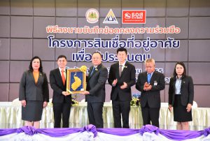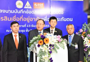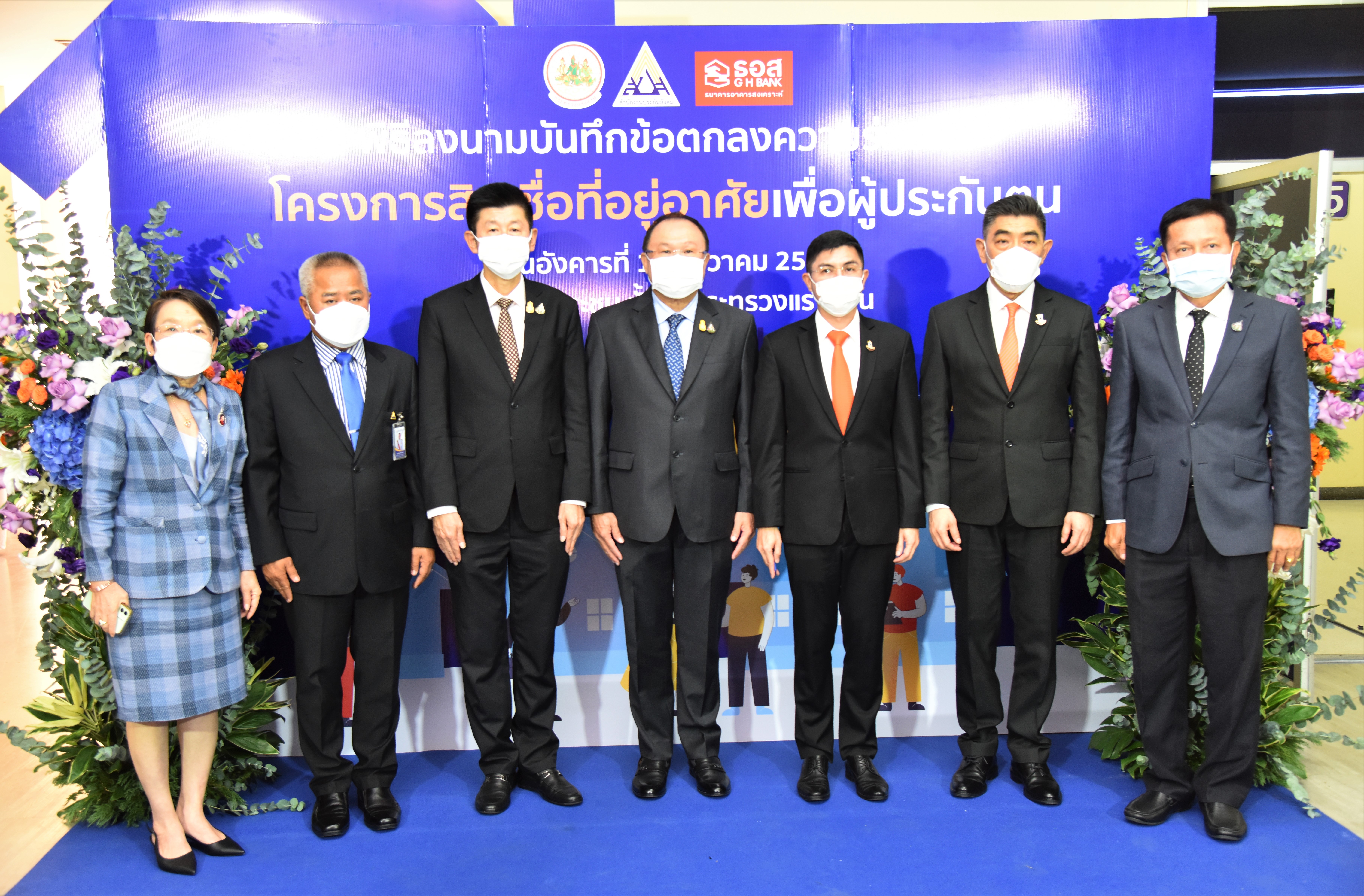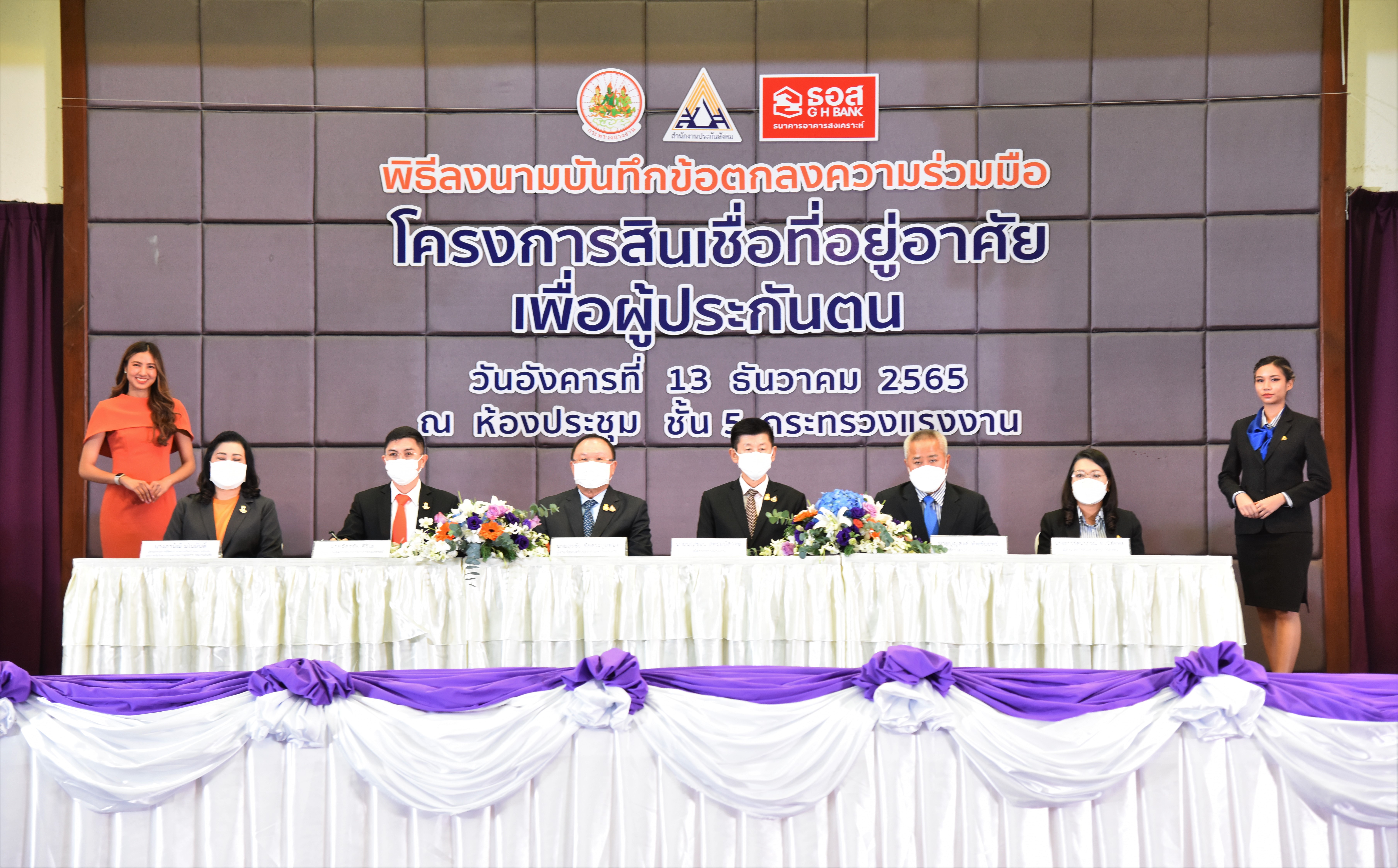 On December 13, 2022, the Labour Minister, Mr. Suchart Chomklin, assigned the Assistant to the Labour Minister, Mr. Surachai Chaitrakulthong, to preside over and witness the signing of the Memorandum of Understanding for Cooperation in the Mortgage Loan for Insured Persons Project, between the Social Security Office and the Government Housing Bank. The Social Security Office’s Secretary-General, Mr. Boonsong Thapchaiyut, from the Ministry of Labour, signed the Memorandum of Understanding with the Government Housing Bank’s Managing Director, Mr. Chatchai Sirilai. The Ministry of Labour’s executives witnessed the signing ceremony at the meeting room on the 5th floor, Ministry of Labour.