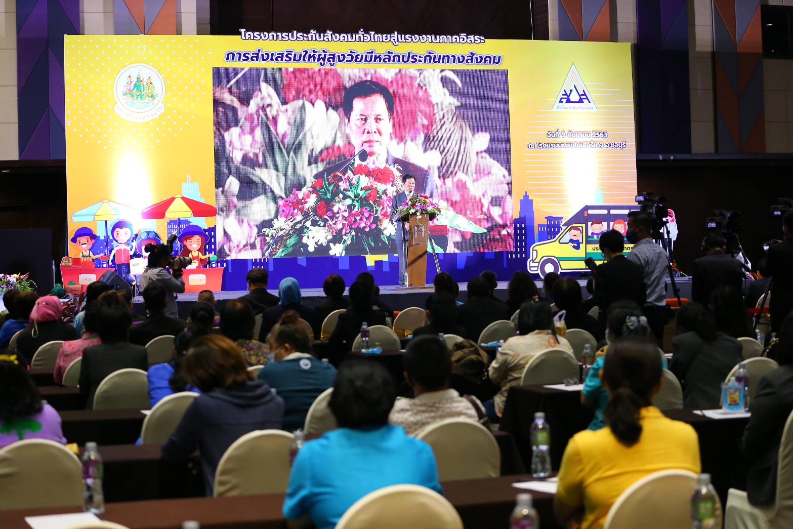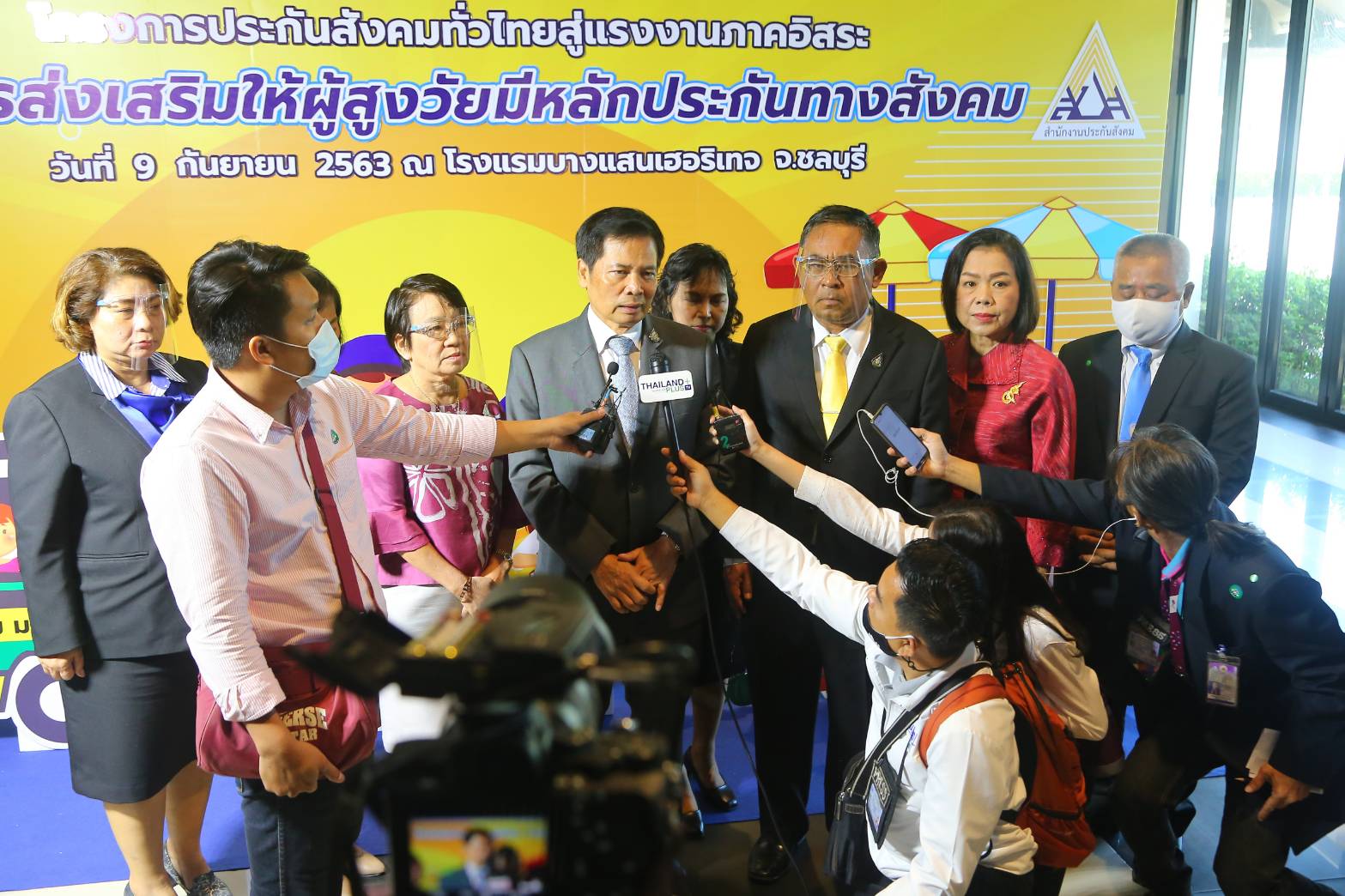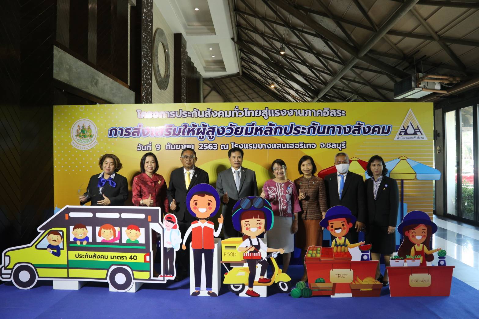 On September 9, 2020, at 09.30 hours, Secretary-General to the Ministry of Labour Mr. Suthep Chittayawong, presided over the Social Security Project’s opening ceremony throughout Thailand for the 1st and 2nd generation of independent workers (regional). Deputy Permanent Secretary of Labour Mrs. Theanrat Nawamawat, the Social Security Office’s Secretary-General Mr. Todsaphon Kritwongwiman, Chonburi District Sheriff Mr. Sukhon Suwannasaksin, Mayor of Saensuk Municipality Mr. Narongchai Khunpluem, the Social Security Offices executives and officials gave a welcoming at the Sansuk Room, Bangsaen Heritage Hotel, Muang, Chonburi.