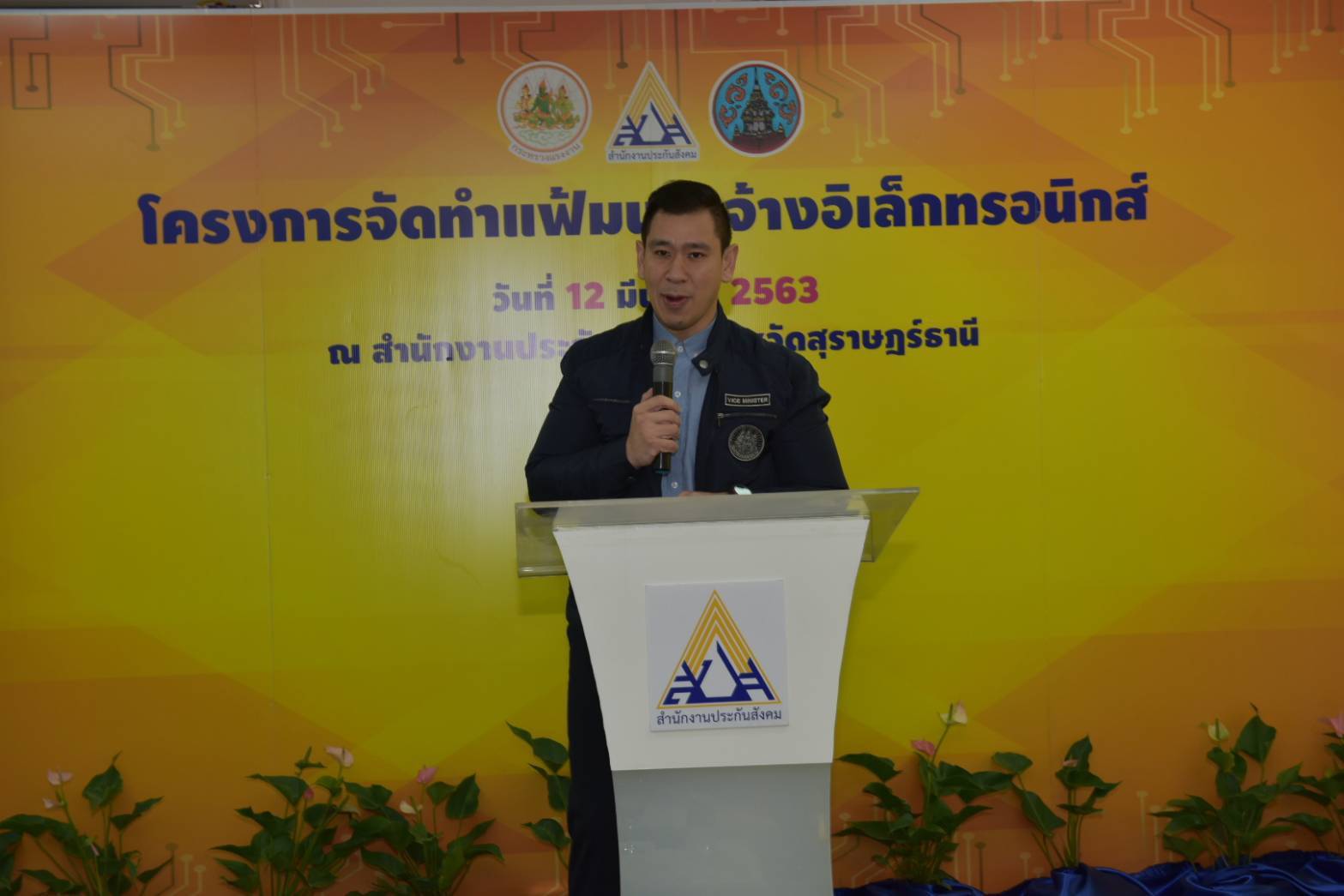 On March 12, 2020, at 10.00 hours, Assistant to the Labour Minister Dr. Duangrit Benjathukul Chairungrueng chaired the opening ceremony of the project to create electronic employer files today, which took place at the Surat Thani Social Security Office. Deputy Governor of Surat Thani Province Mrs. Jamjit Poonsawat gave a welcoming speech. The Social Security Office’s Inspector-General Mr. Boonsong Tapchaiyuth gave a report, and Surat Thani Social Security Officer Mrs. Marasri Jairangsri gave a welcoming. The Assistant to the Labour Minister said that in the implementation of the electronic employer file project, he thanked the Social Security Office for providing the project importance and for paying attention to the urgent policy of the Ministry of Labour. The Labour Minister assigned to the ministry’s executives to help develop its work and improve the level of service to people so that the Ministry of Labour can become a digital service ministry. The project aims to promote the civil service system by converting the paper-based system into electronic file storage. The Social Security Office has set a target of over 900,000 files. Today, the project commenced nationwide among agencies, which will be an essential mechanism for changing the work processes of the Ministry of Labour to drive to Thailand 4.0. He also requested the implementation of electronic file creation to be a success, to be able to serve employers, employees, and insurers as intended by the Social Security Office.