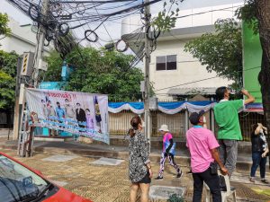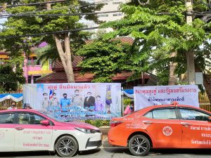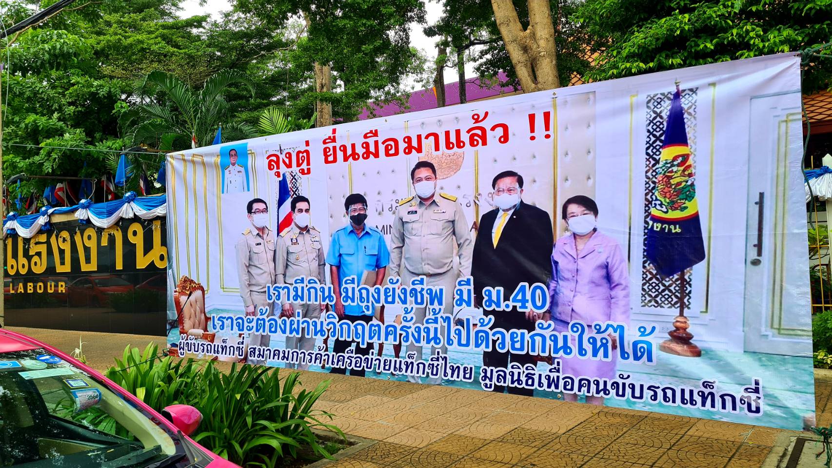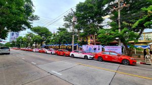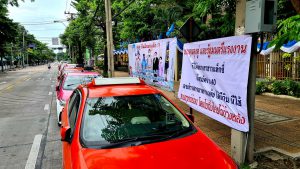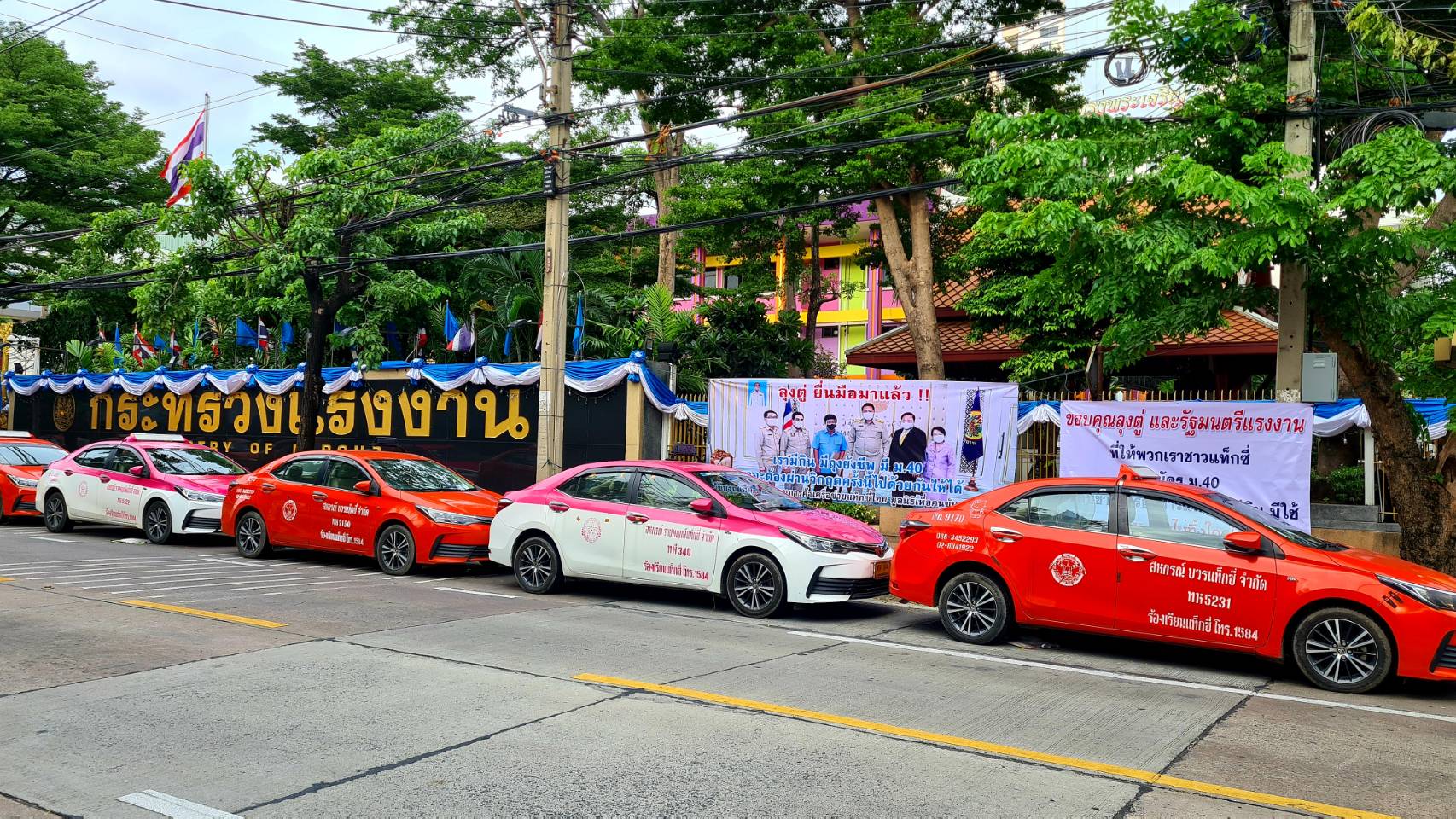 On August 4, 2021, at 16.30 hours, the Taxi Driver Network, led by Mr. Thanapon Tiewcharoen, a member of the Thai Taxi Association, and friends and members, arrived in front of the Ministry of Labour, Mitmaitri Road, Din Daeng District. Mr. Thanapon said that today, his friend and himself, who are members of the Thai Taxi Association, traveled to the area in front of the Ministry of Labour to put up signage showing messages of thanks to the Prime Minister General Prayuth Chan-ocha and Labour Minister Mr. Suchart Chomklin, for seeing the importance and compassion for taxi drivers. He said that the taxi drivers are happy for the support they have been given with the dry foods to ease the burden among taxi driver’s families. Therefore, they moved the parked taxis away from the entrance to the Ministry of Labour to not obstruct the traffic.