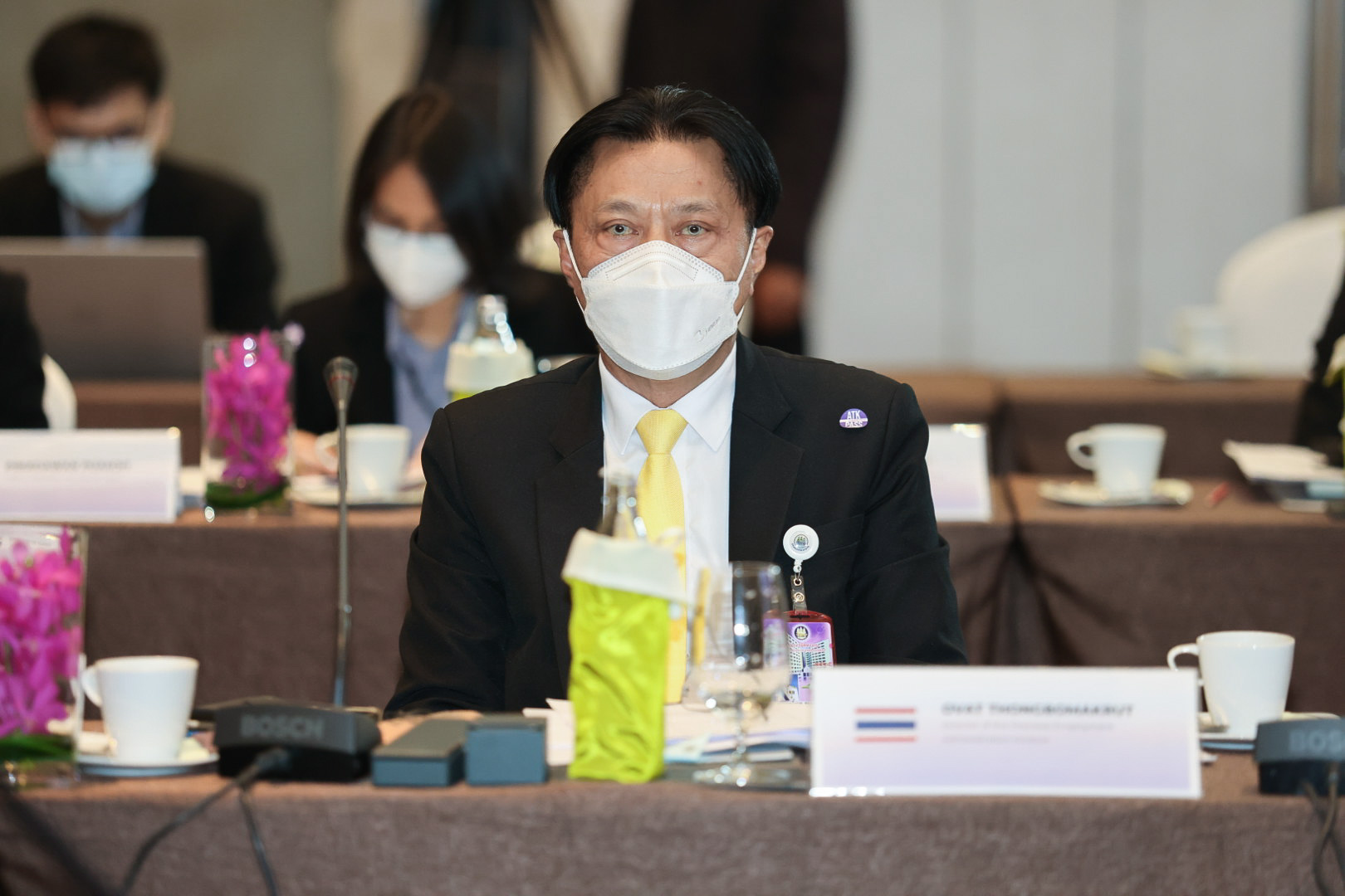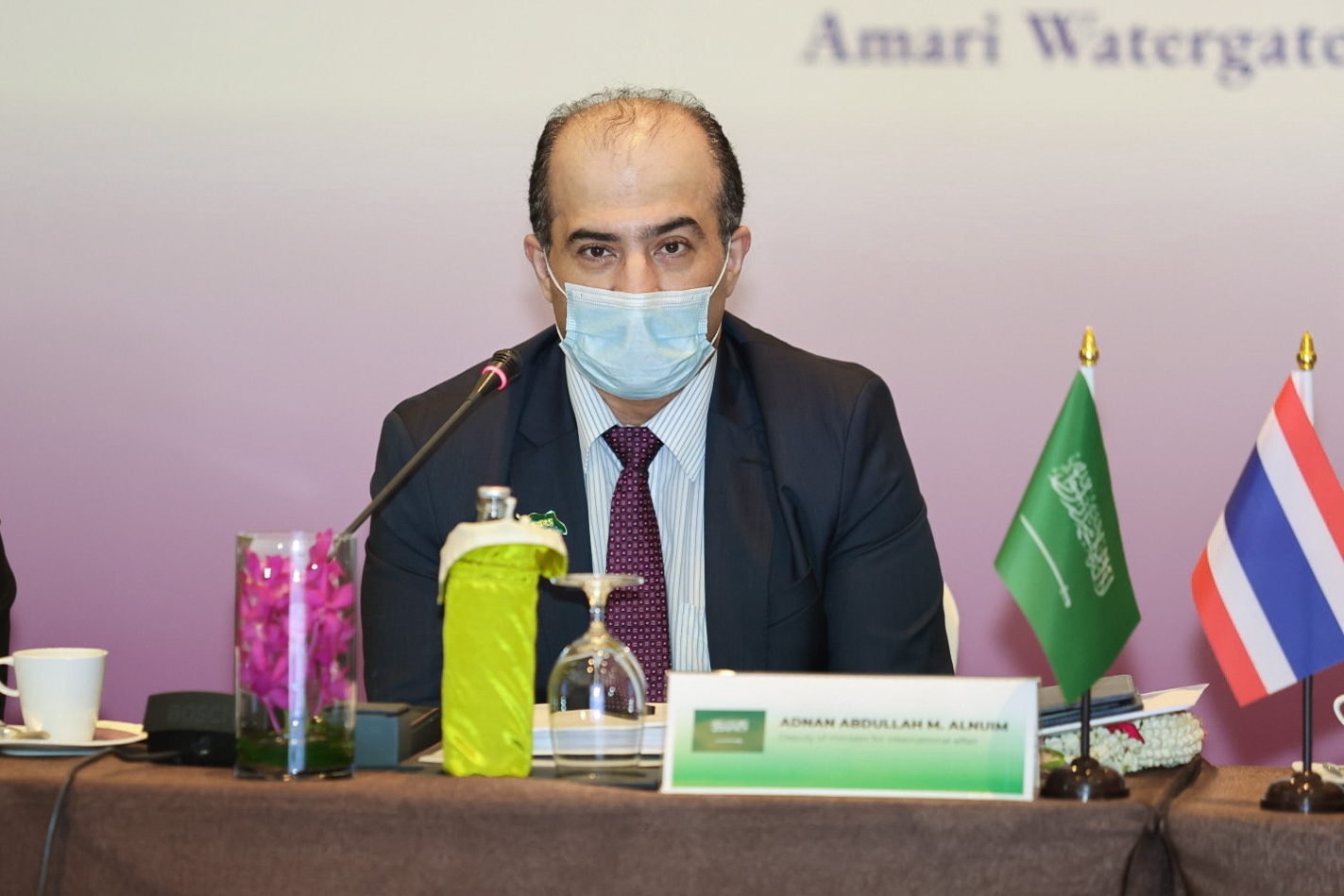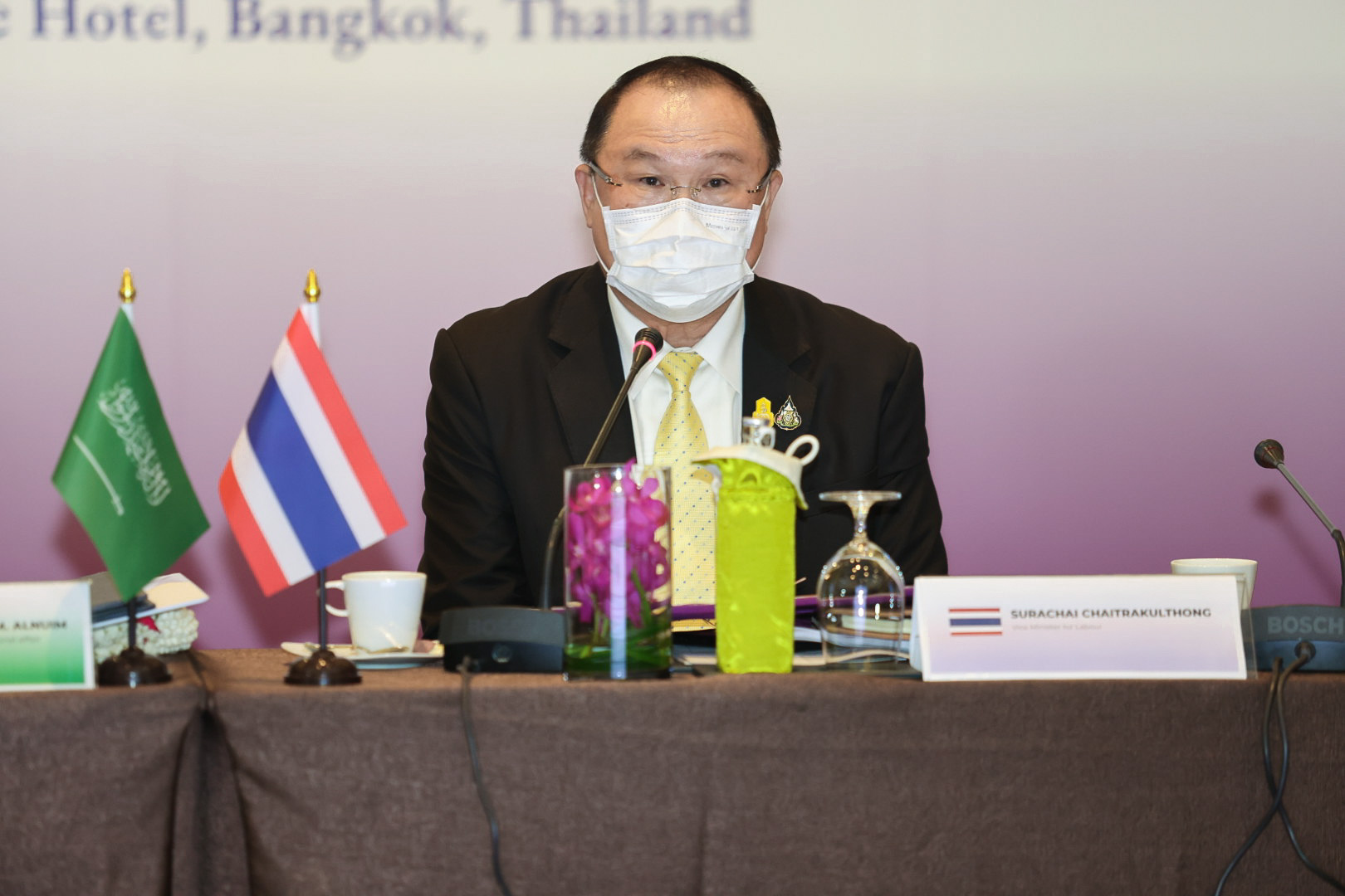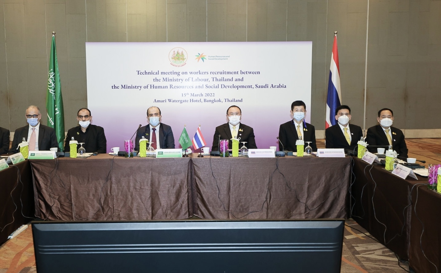 On March 15, 2022, Labour Minister Mr. Suchart Chomklin assigned Assistant to the Labour Minister Mr. Surachai Chaitrakulthong gave a speech to welcome Dr. Adnan Abdullah M. Alnuim, Deputy Minister for International Affairs of Saudi Arabia and committee at the symposium on labour recruitment between the Thai Ministry of Labour and the Saudi Arabian Ministry of Human Resources and Social Development via teleconference as well. The occasion took place at the Amari Watergate Hotel Bangkok. Permanent Secretary of Labour, Mr. Boonchob Suttamanaswong, the Department of Employment’s Director-General, Mr. Pairoj Chotiksetian, the Department of Skills Development’s Director-General, Mr. Prateep Songlamyong, Assistant to the Permanent Secretary of Labour Mr. Samat Pattamasukon, the Ministry of Labour’s executives and relevant agencies also joined the occasion. Mr. Surachai said that today’s meeting resulted from discussions between Labour Minister Mr. Suchart Chomklin and Ahman Sulaiman ALRajhi, Minister of Human Resources and Social Development from Saudi Arabia, during the official visit of His Excellency General Prayut Chan-ocha, Prime Minister of Thailand in January. The Ministry of Labour is pleased to hear that Saudi Arabia is interested in restoring labour relations with Thailand and ready to open the country to accept Thai workers to work in Saudi Arabia. They have proposed to draw up two agreements on labour recruitment. The Cabinet has now approved the draft agreement. It is in discussion to determine the date the Labour Minister travels to sign on the occasion that Saudi Arabia sees appropriate.