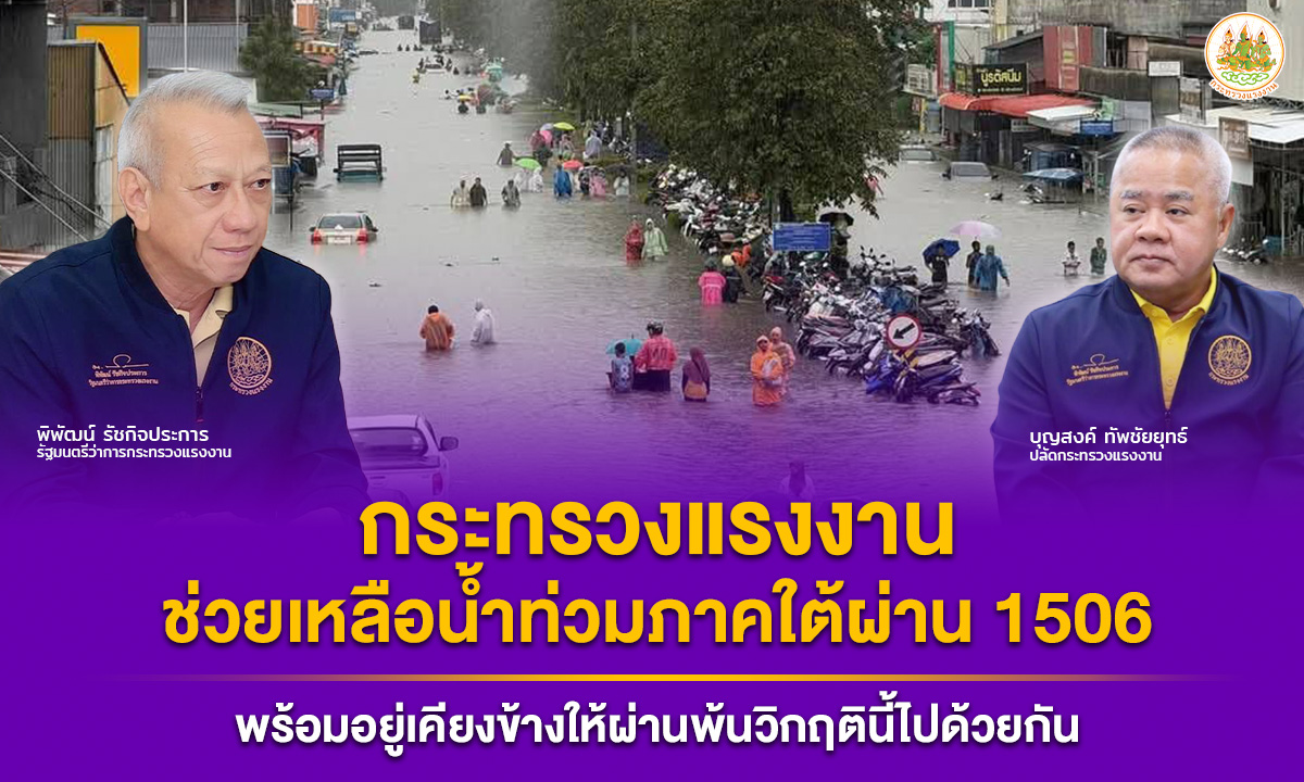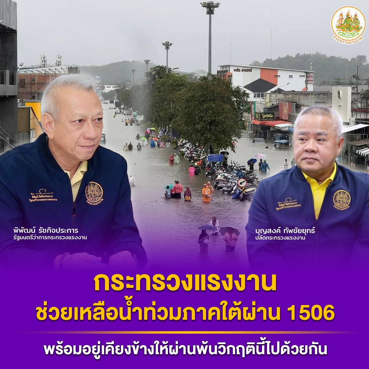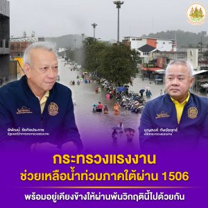 “I am concerned about the workers, civil servants, and the Ministry of Labour’s officials, including labour volunteers and graduates in the disaster-stricken areas. The Ministry of Labour stands by the people to take care of their morale and provide necessary items to the affected, both those affected by the disaster and those who are working to help employers, employees, and the public, so that there are no shortcomings. Employees, insured persons, employers, businesses, and the public affected by the flood who are currently suffering and need assistance from agencies under the Ministry of Labour can contact the Ministry of Labour’s hotline at 1506,” said Mr. Phiphat.