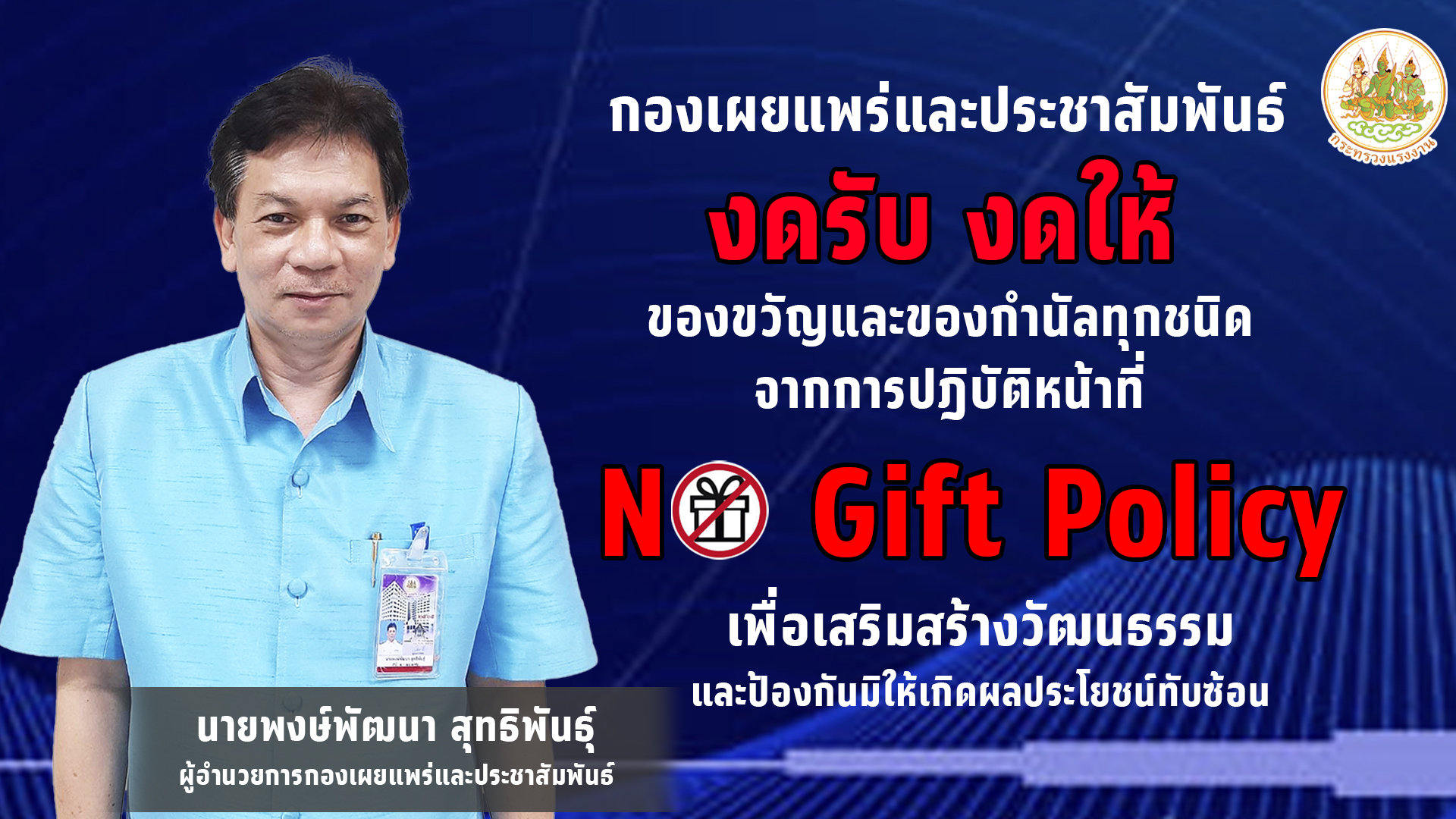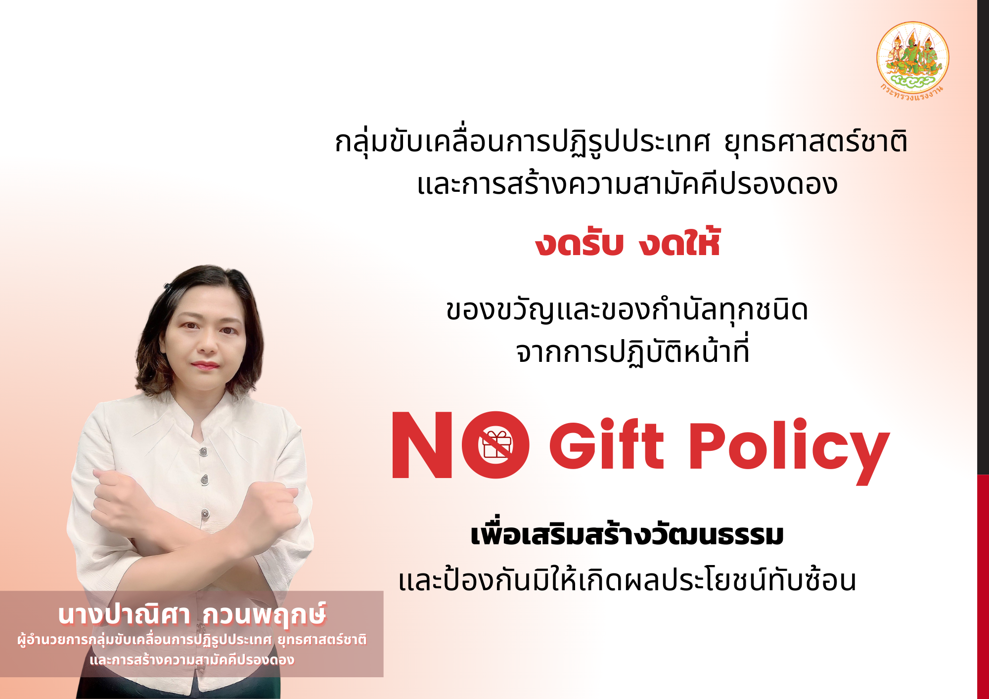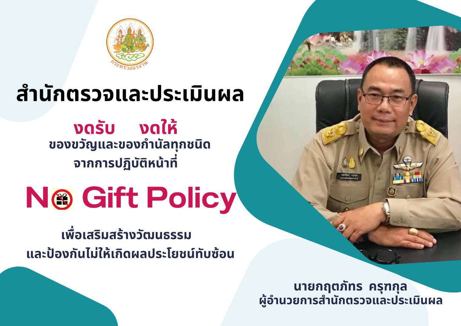หน่วยงานในสังกัดสำนักงานปลัดกระทรวงแรงงาน ขอเป็นส่วนหนึ่งในการปฏิบัติตาม “นโยบายไม่รับของขวัญทุกชนิด (No Gift Policy)