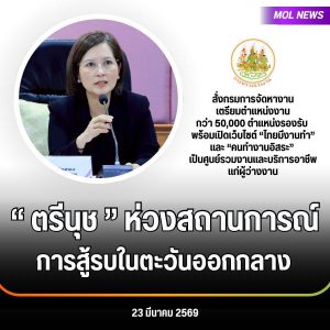 “ตรีนุช”ห่วงสถานการณ์การสู้รบในตะวันออกกลางส่งผลคนไทยตกงานเพิ่มขึ้น สั่งกรมการจัดหางานเตรียมตำแหน่งงานกว่า 50,000 ตำแหน่งรองรับ พร้อมเปิดเว็บไซต์ “ไทยมีงานทำ” และ “คนทำงานอิสระ”เป็นศูนย์รวมงานและบริการอาชีพแก่ผู้ว่างงาน