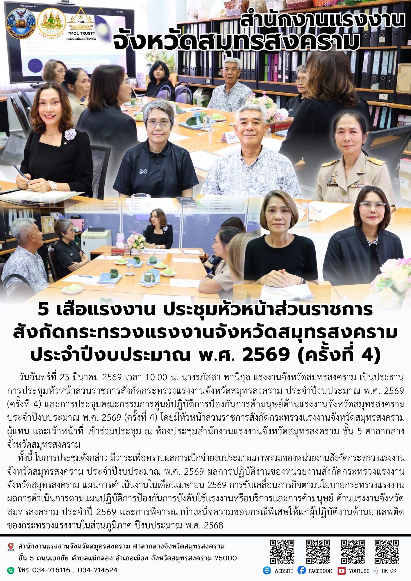 5 เสือแรงงาน ประชุมหัวหน้าส่วนราชการ สังกัดกระทรวงแรงงานจังหวัดสมุทรสงคราม ประจำปีงบประมาณ พ.ศ. 2569 (ครั้งที่ 4)