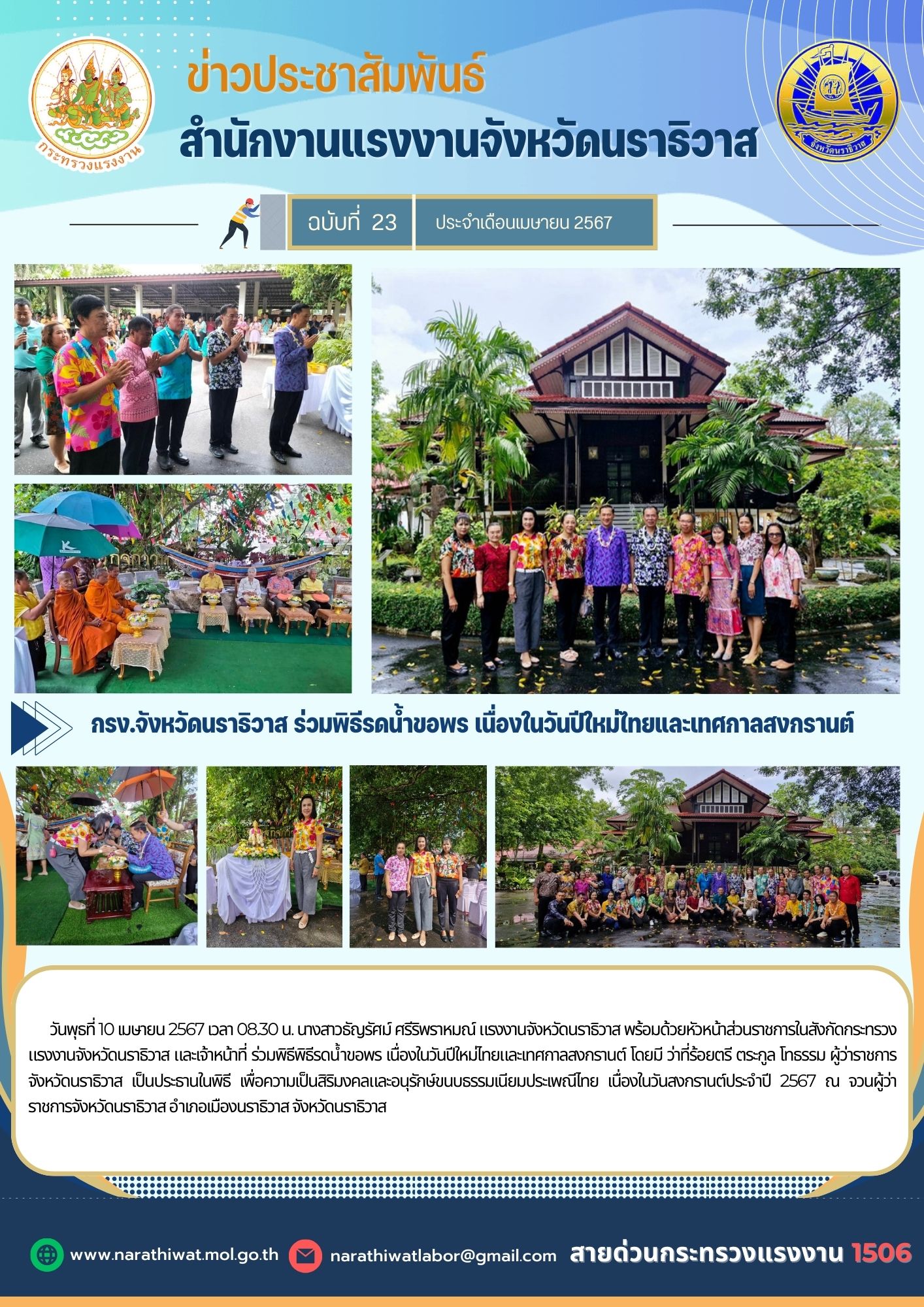 วันพุธที่ 10 เมษายน 2567 เวลา 08.30 น. นางสาวธัญรัศม์ ศรีริพราหมณ์ แรงงานจังหวัดนราธิวาส พร้อมด้วยหัวหน้าส่วนราชการในสังกัดกระทรวงแรงงานจังหวัดนราธิวาส และเจ้าหน้าที่ ร่วมพิธีพิธีรดน้ำขอพร เนื่องในวันปีใหม่ไทยและเทศกาลสงกรานต์ โดยมี ว่าที่ร้อยตรี ตระกูล โทธรรม ผู้ว่าราชการจังหวัดนราธิวาส เป็นประธานในพิธี เพื่อความเป็นสิริมงคลและอนุรักษ์ขนบธรรมเนียมประเพณีไทย เนื่องในวันสงกรานต์ประจำปี 2567 ณ จวนผู้ว่าราชการจังหวัดนราธิวาส อำเภอเมืองนราธิวาส จังหวัดนราธิวาส