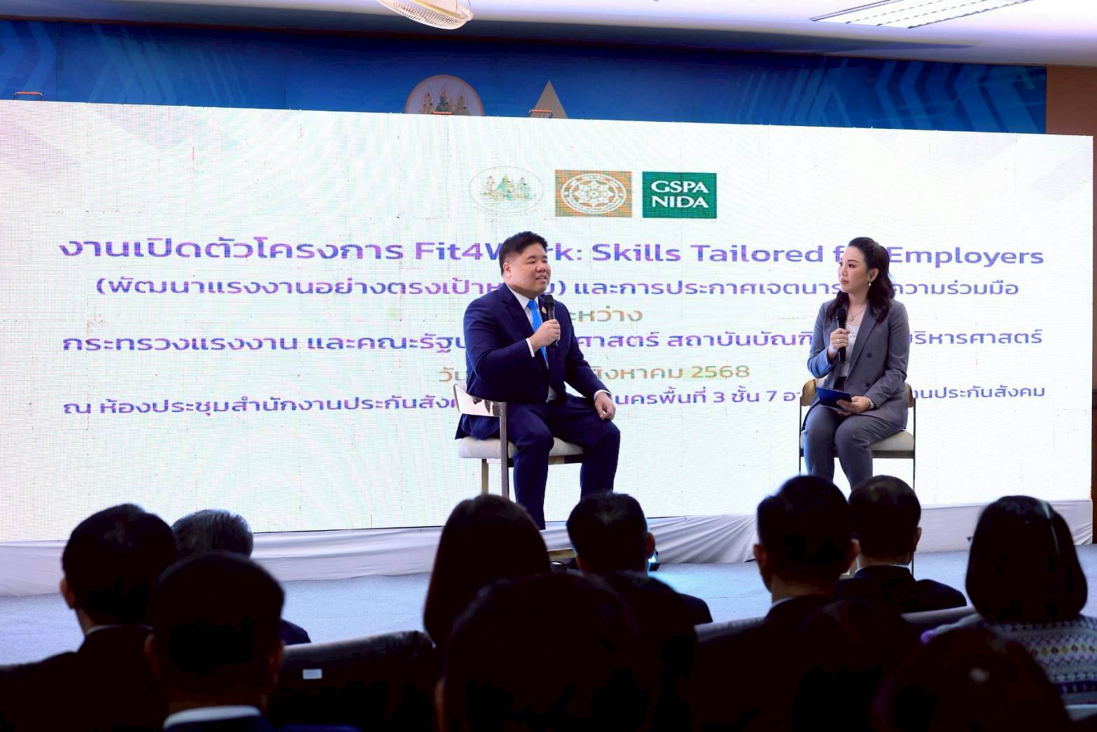 วันที่ 22 สิงหาคม 2568 (กรุงเทพฯ) – นายพงศ์กวิน จึงรุ่งเรืองกิจ รัฐมนตรีว่าการกระทรวงแรงงาน เป็นประธานในงานเปิดตัวโครงการ “Fit4Work: Skills Tailored for Employers” ซึ่งเป็นกลไกสำคัญในการพัฒนาแรงงานให้ตรงกับความต้องการของตลาดอย่างแท้จริง พร้อมประกาศเจตนารมณ์ความร่วมมือกับคณะรัฐประศาสนศาสตร์ สถาบันบัณฑิตพัฒนบริหารศาสตร์ (GSPA NIDA) เพื่อยกระดับการพัฒนาทักษะแรงงานไทยในยุคดิจิทัล โดยมี นายสุรสิทธิ์ นิธิวุฒิวรรักษ์ เลขานุการรัฐมนตรีว่าการกระทรวงแรงงาน นายสุทธิเกียรติ วีระกิจพานิช ประธานคณะที่ปรึกษารัฐมนตรี นายสมาสภ์ ปัทมะสุคนธ์ รองปลัดกระทรวงแรงงาน นายสันติ นันตสุวรรณ รองปลัดกระทรวงแรงงาน นางสาวกาญจนา พูลแก้ว ผู้ตรวจราชการกระทรวงแรงงาน ว่าที่ร้อยตรี สมศักดิ์ พรหมดำ ผู้ตรวจราชการกระทรวงแรงงาน นายเกริกไกร นาสมยนต์ ที่ปรึกษากฎหมาย นายณัฐวุฒิ ภัทรประยูร ที่ปรึกษาวิชาการแรงงาน พร้อมด้วยผู้บริหารระดับสูงกระทรวงแรงงาน ณ ห้องประชุมสำนักงานประกันสังคมกรุงเทพมหานครพื้นที่ 3 ชั้น 7 อาคารสำนักงานประกันสังคม กระทรวงแรงงาน